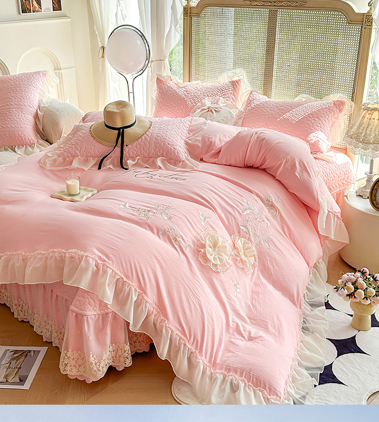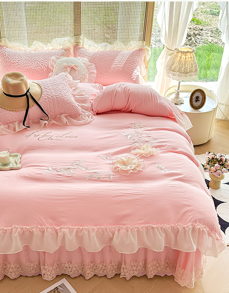 韩版花边公主风甜美少女心水洗棉床盖款四件套泡泡棉双层纱棉麻小竺棉纯棉全棉夏被床盖四件套小竺棉纯棉全棉夏被床盖四件套