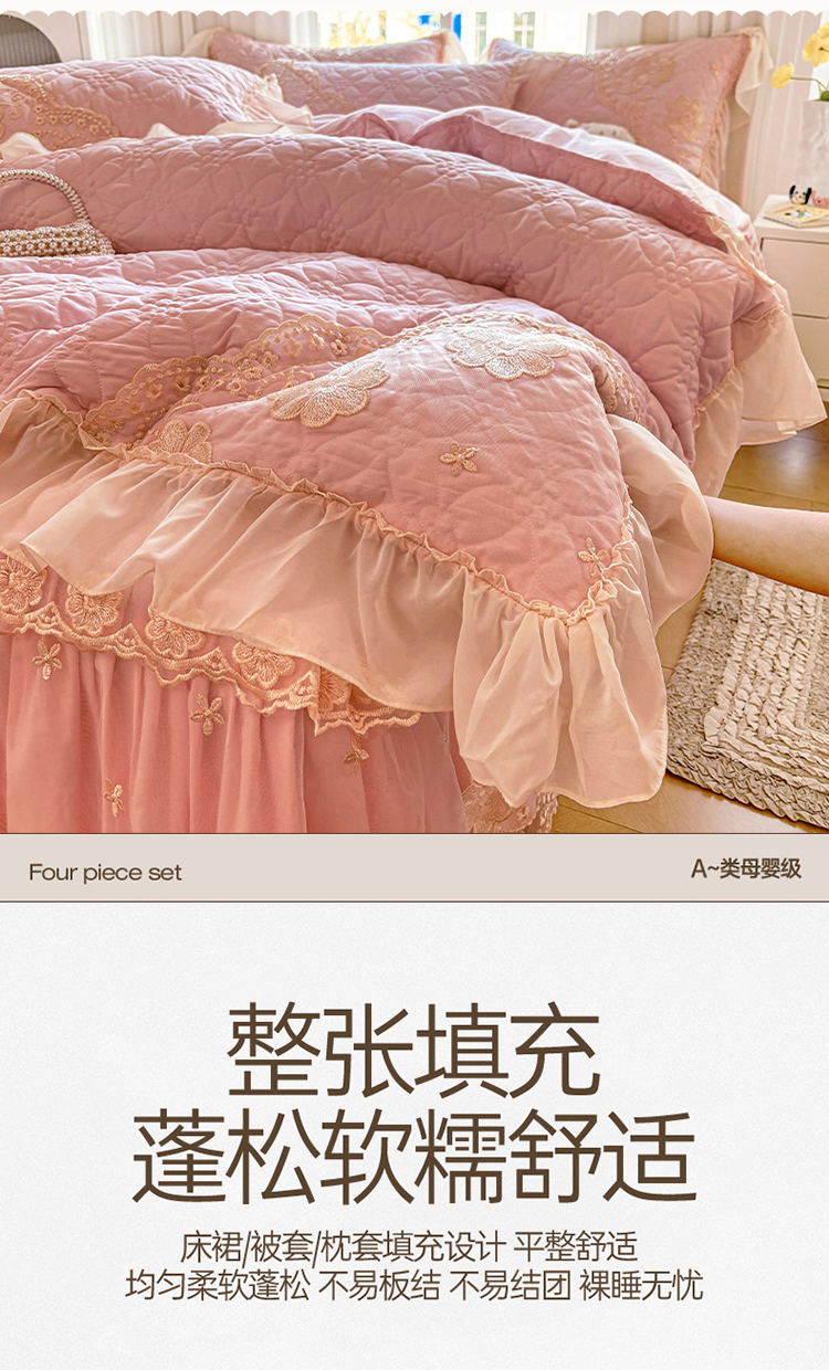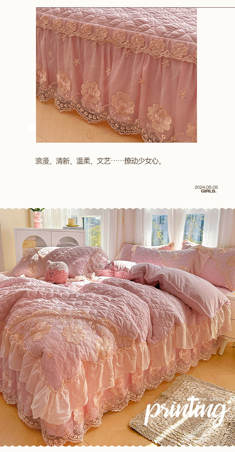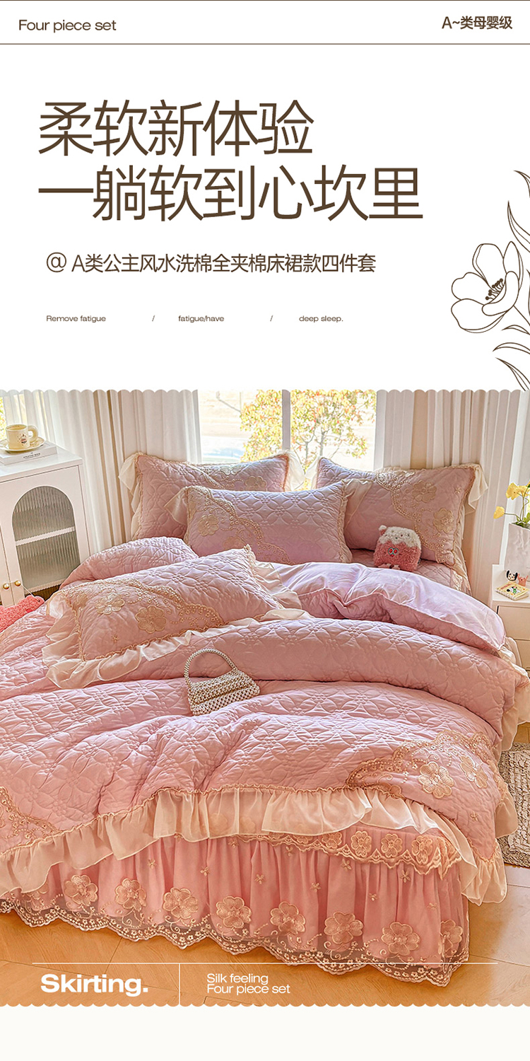当前位置: 91家纺网 > 商品网购 > 床品套件 > 四件套 > 其它四件套 > 罗艺轩 2024新款公主风水洗棉夹棉床裙款四件套-浪漫满屋床 浪漫满屋-豆沙
