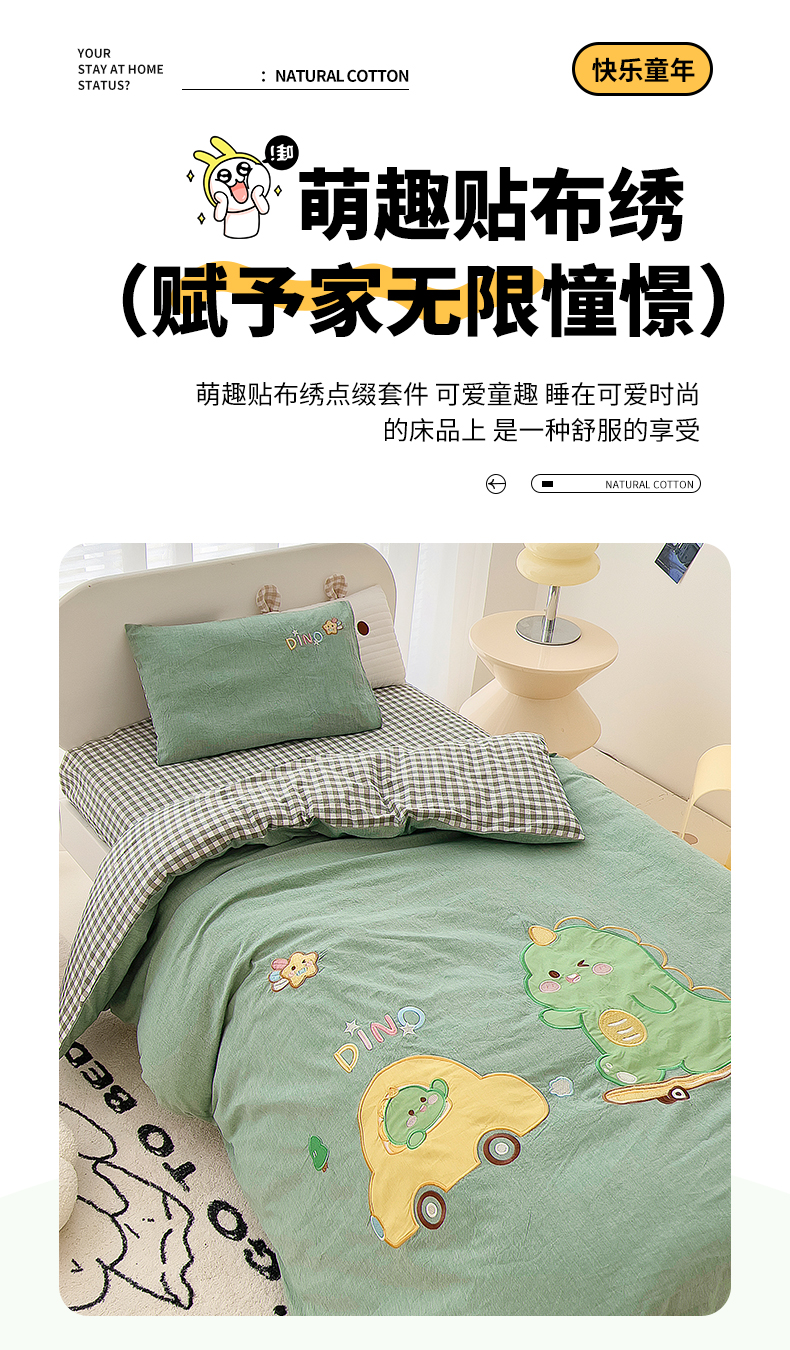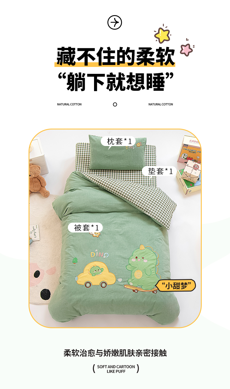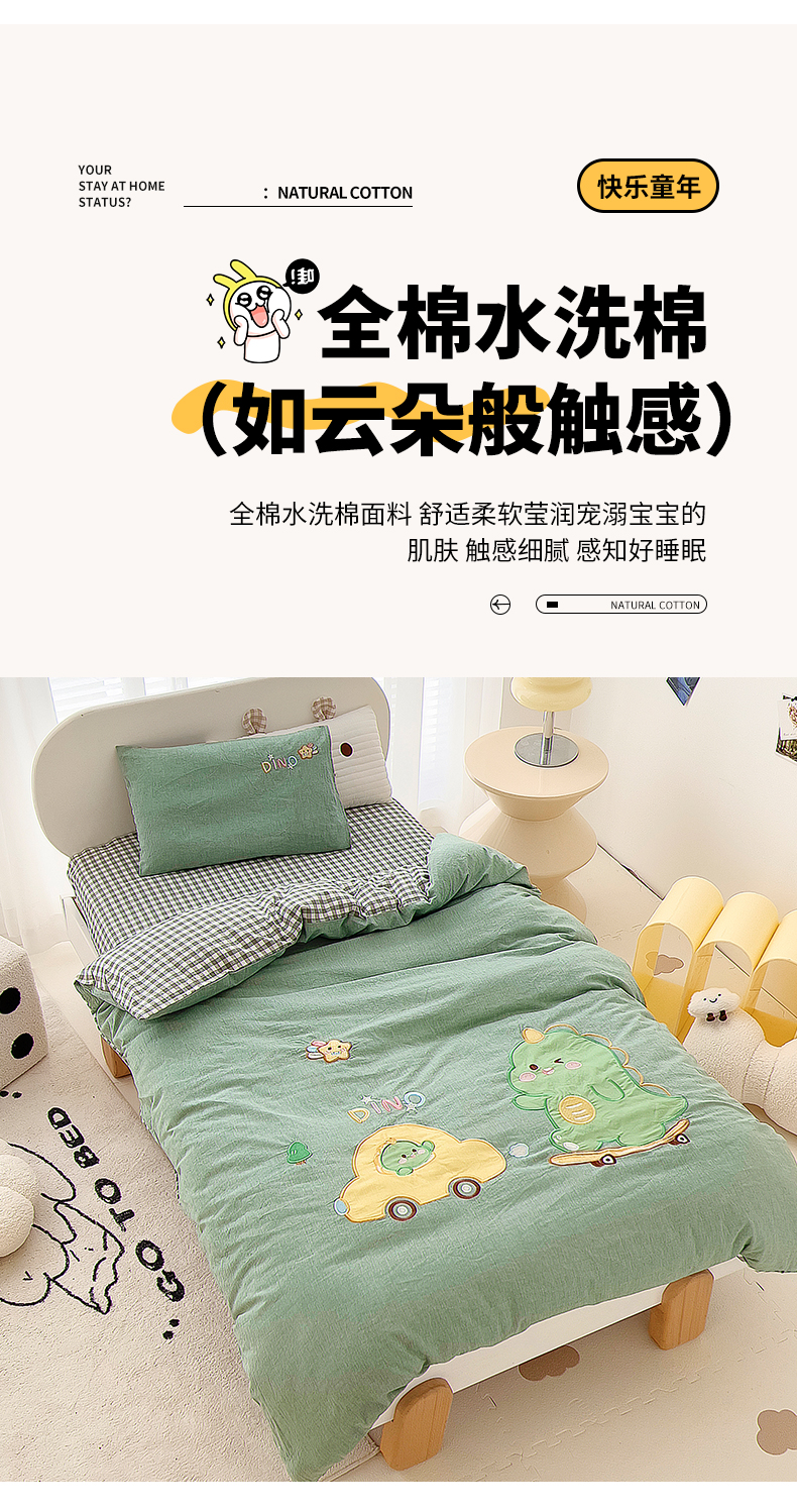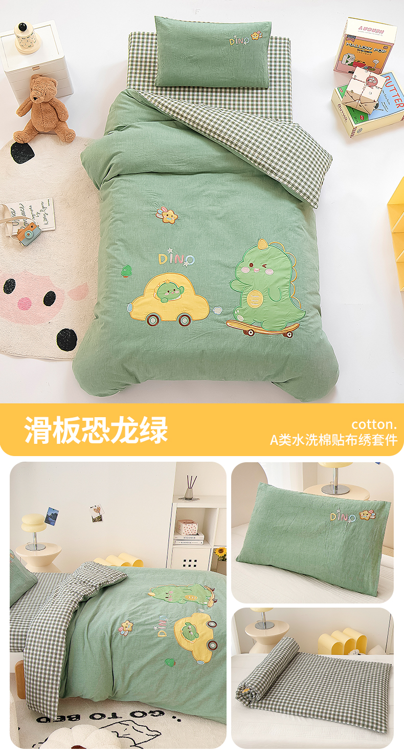 当前位置: 91家纺网 > 商品网购 > 床品套件 > 三件套 > 鱼宝 2025新款全棉水洗棉绣花幼儿园套件 滑板恐龙绿
