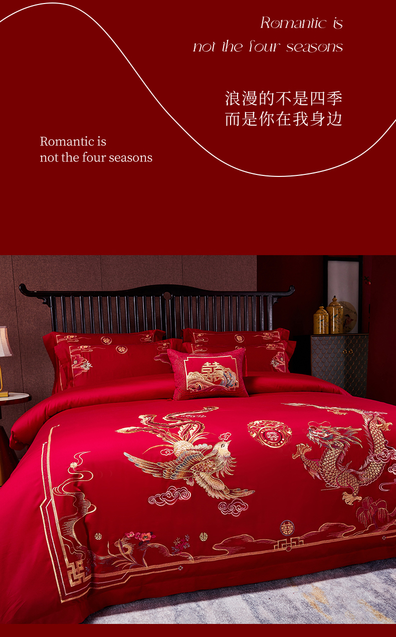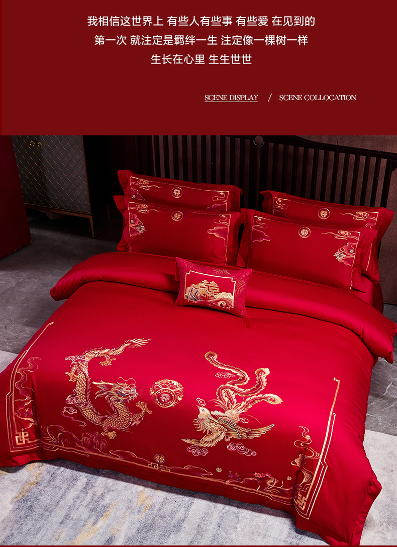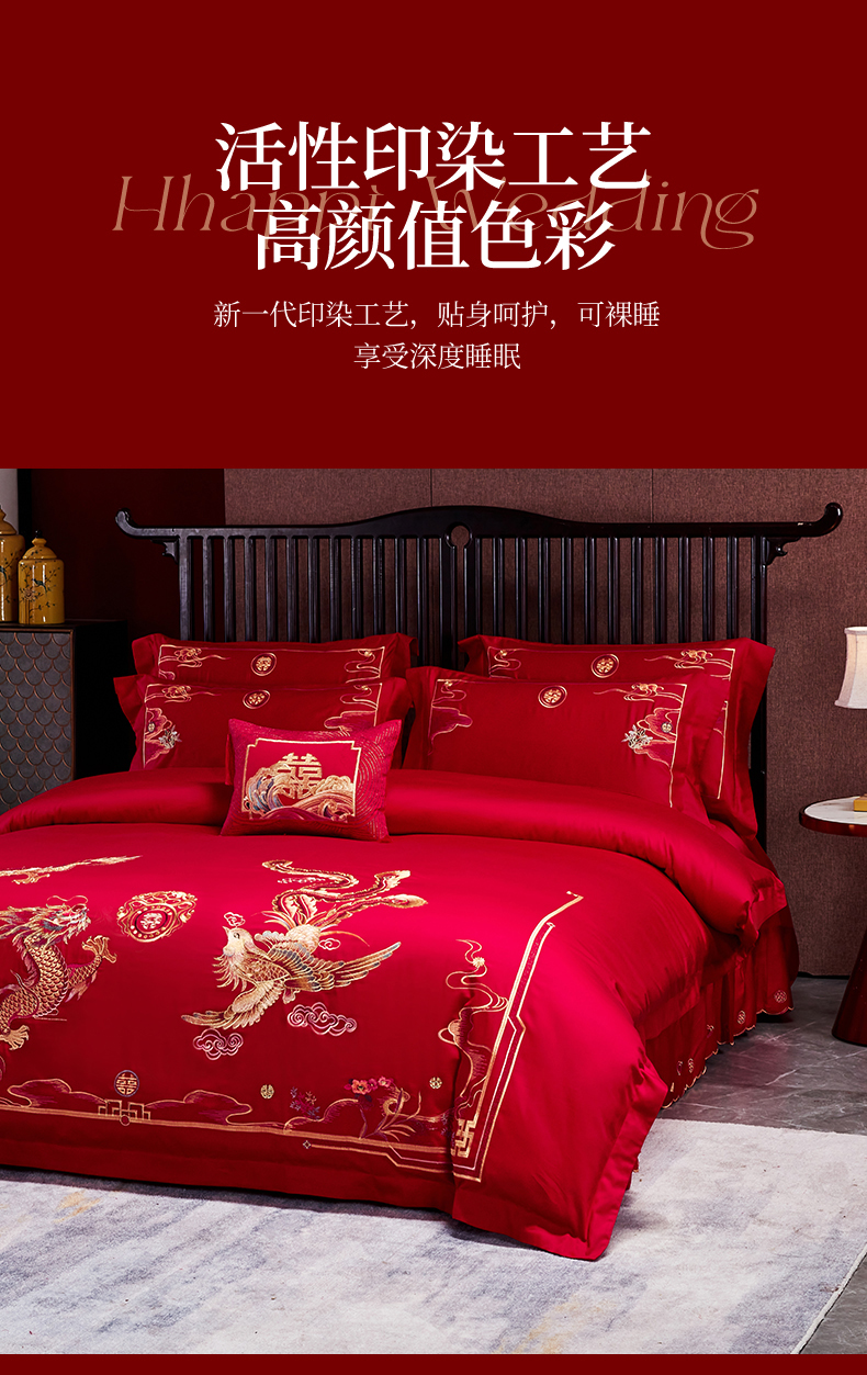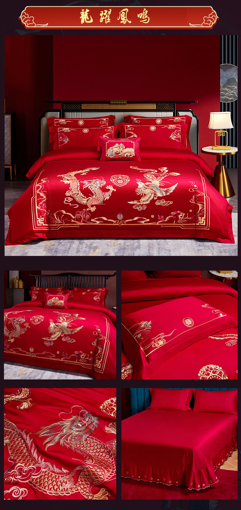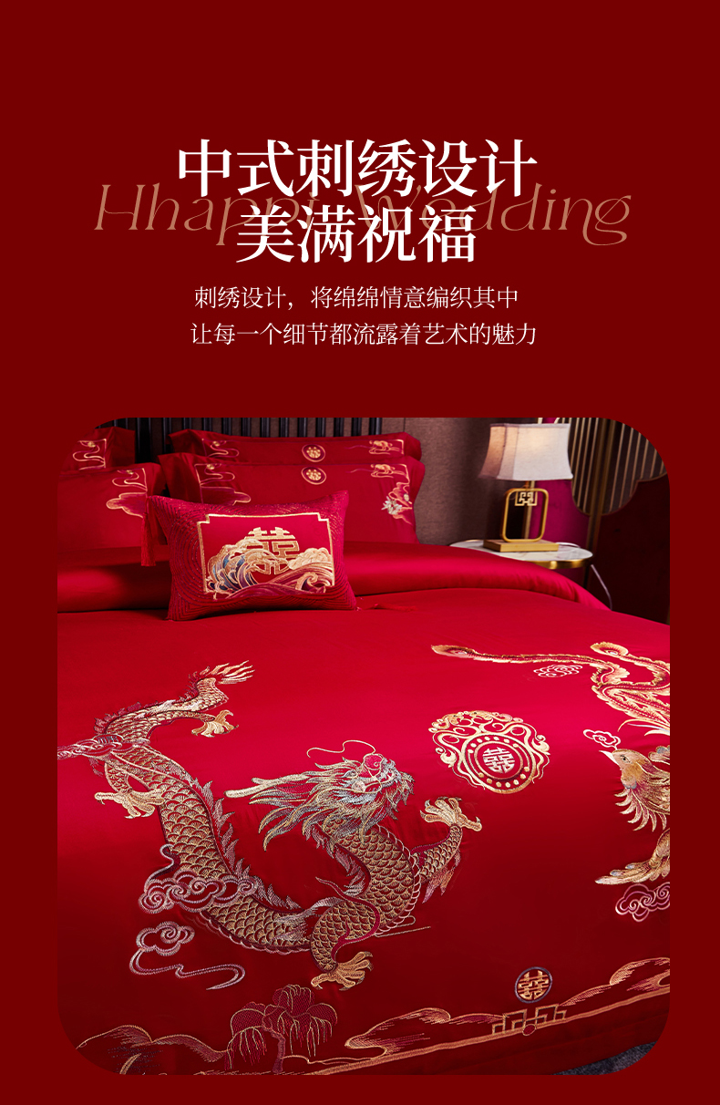 商品名称:晶缦家纺 2024纯棉全棉60支贡缎长绒棉刺绣花婚庆四件套--绣花贴边床单款 龙跃凤鸣