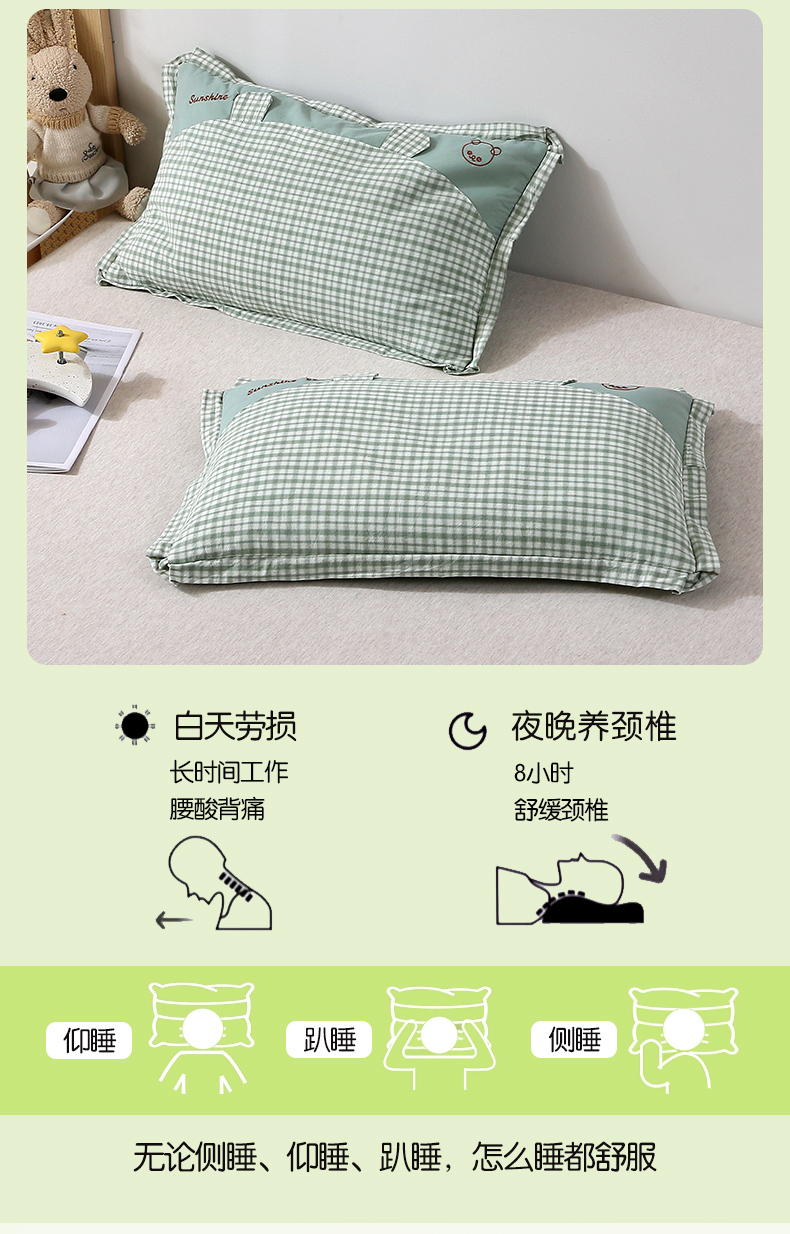 小熊耳朵方格荞麦枕-绿色30*50/只