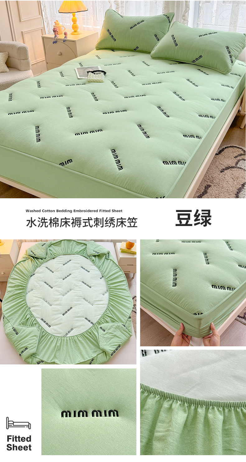 予梦家纺 2024新款ins风刺绣夹棉床笠床垫保护套 字母-豆绿