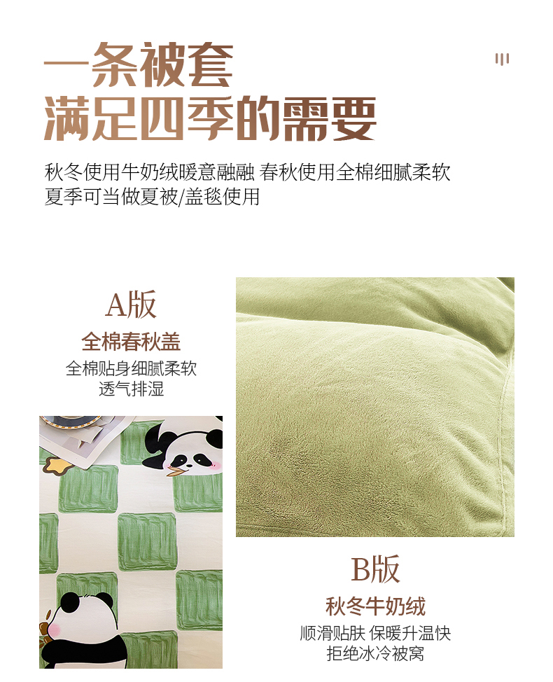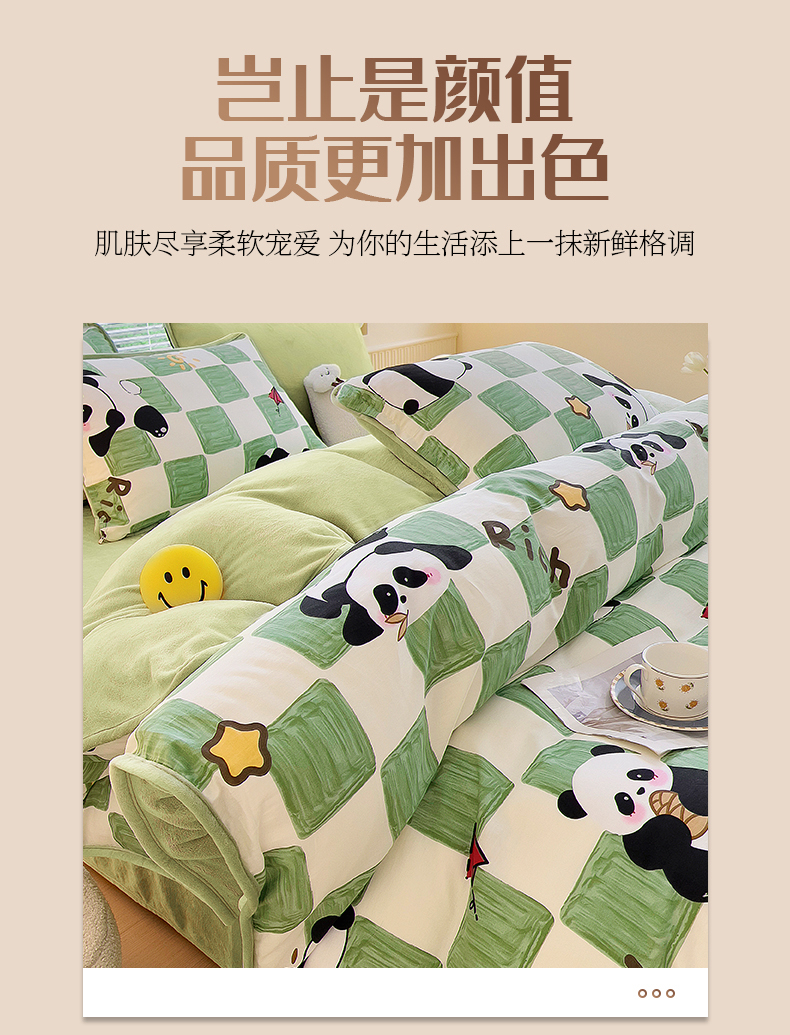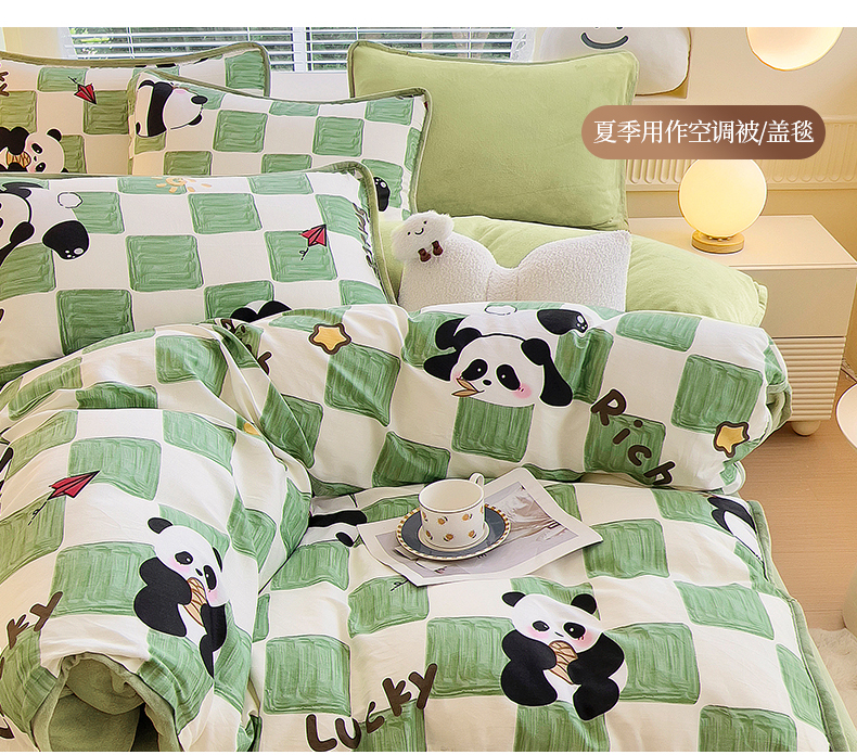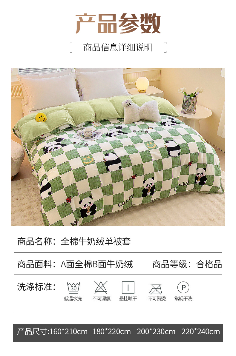 商品名称:2024新款全棉加牛奶绒四件套单被套系列-单被套 緑格熊猫