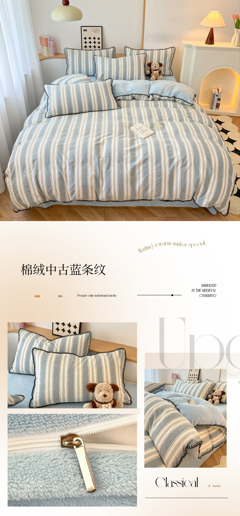 商品名称:柠馨 2024新款简约时尚全棉牛奶绒棉绒四件套 棉绒中古蓝条纹