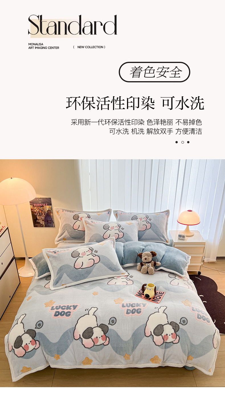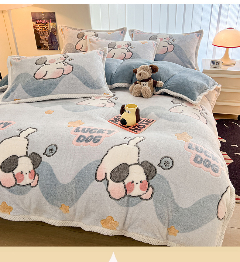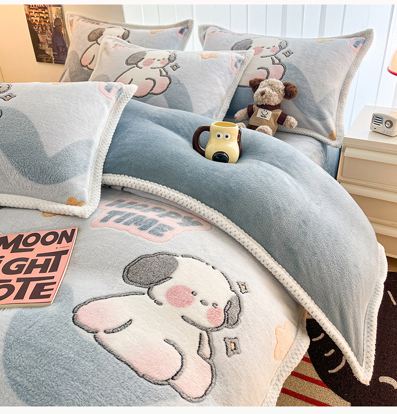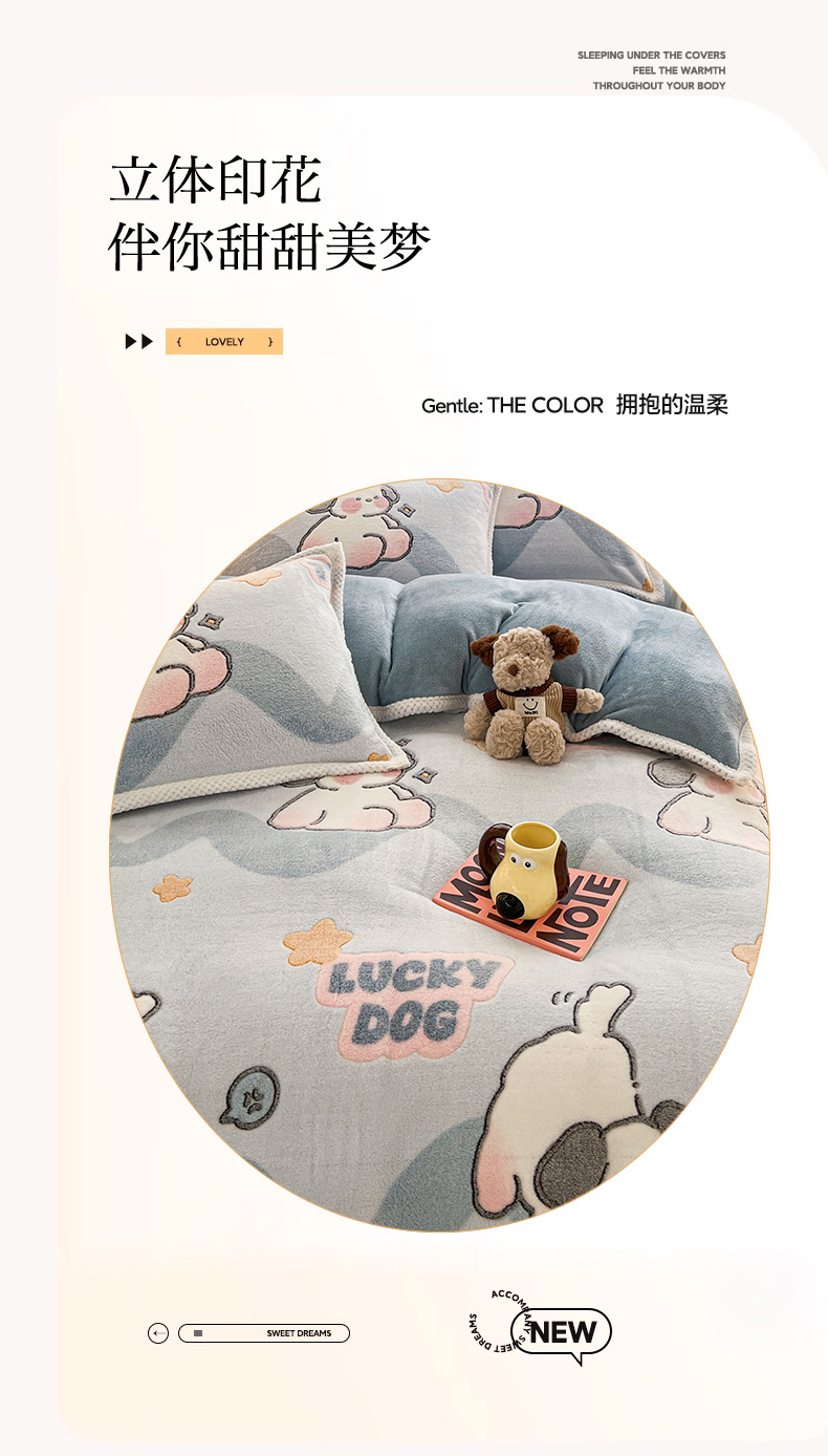 (总)倾慕家纺 2025新款卡通毛巾绣加厚保暖牛奶绒四件套,爱心女孩,咖啡小狗,猫咪熊兔,迷你小车,圣诞树熊,音乐企鹅