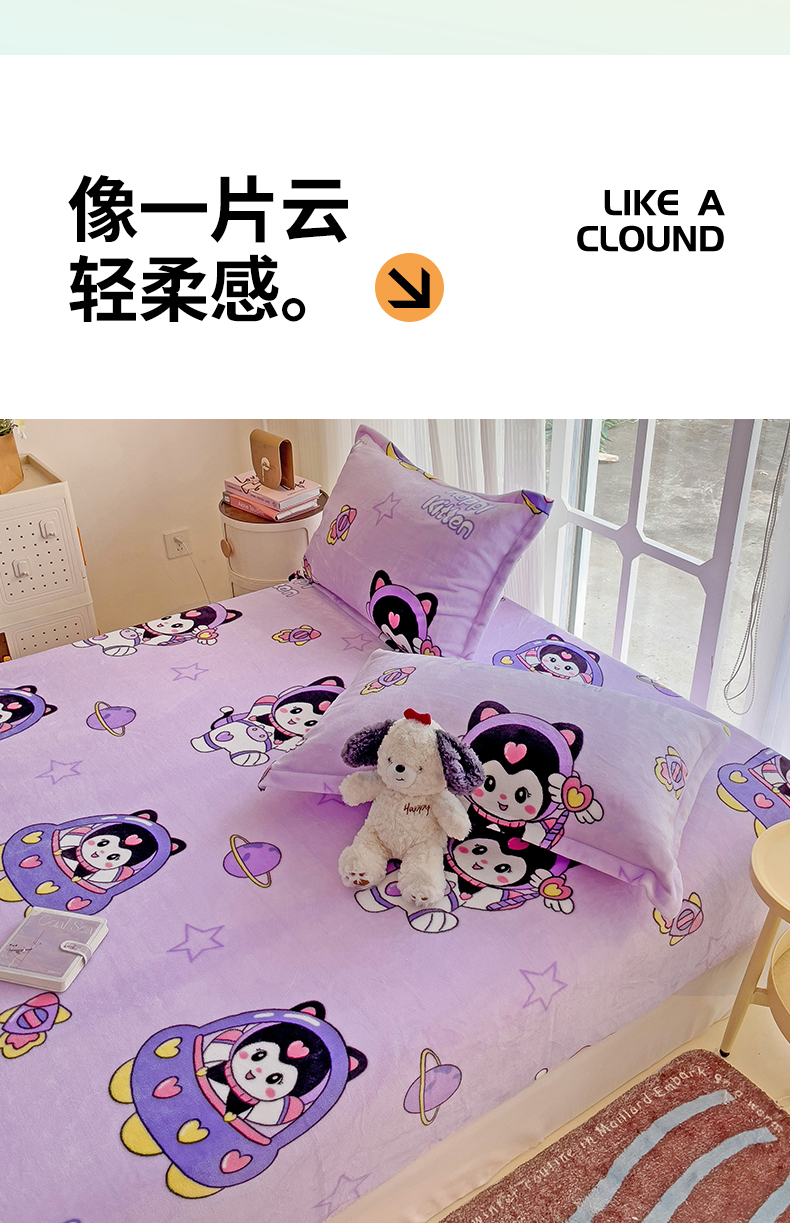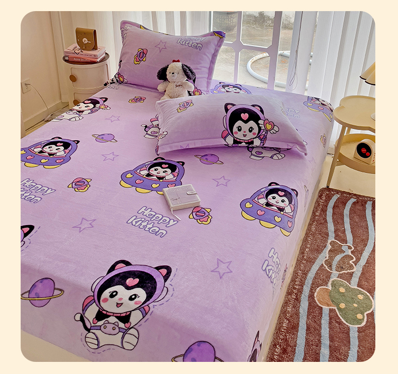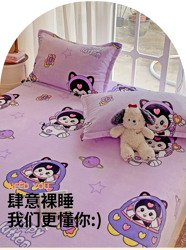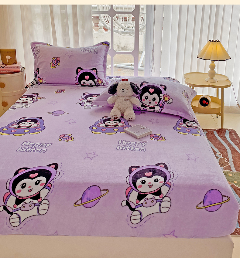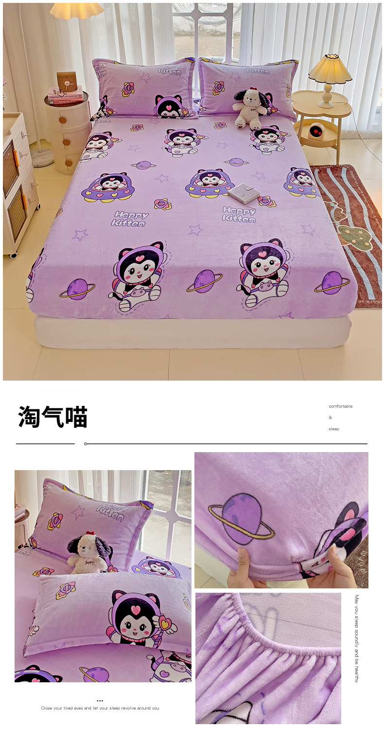 • 91家纺网 家纺一手货源 找家纺 名兮 2024卡通时尚风高克重牛奶绒床笠 淘气喵