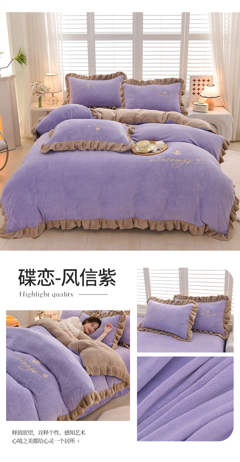 商品名称:氧家 2024新款韩版牛奶绒绣花四件套--蝶恋 羽蝶-熏韵紫