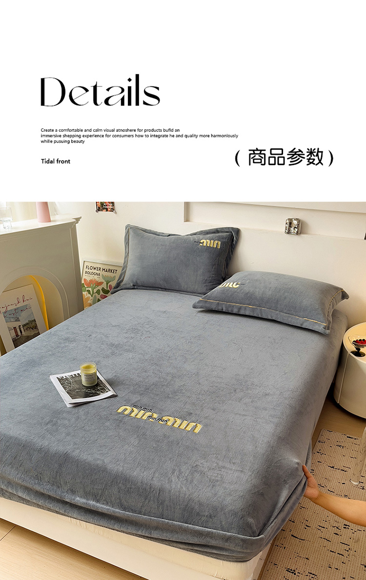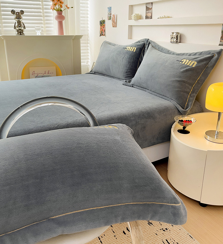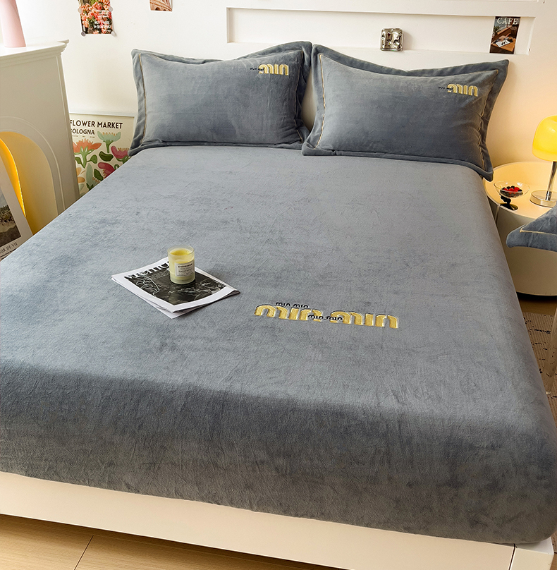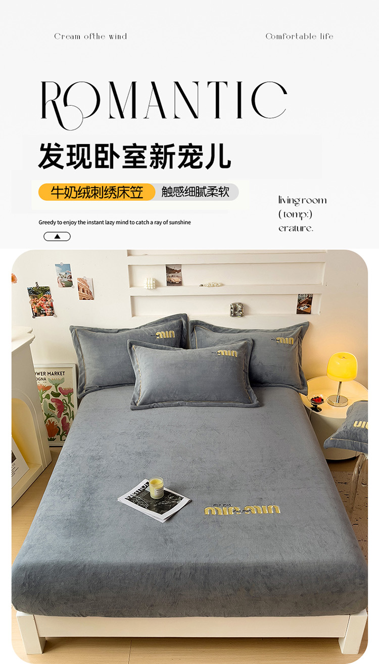 • 91家纺网 家纺一手货源 找家纺 言熙居 2024新款牛奶绒刺绣纯色360度全包床笠三件套 喵喵-灰