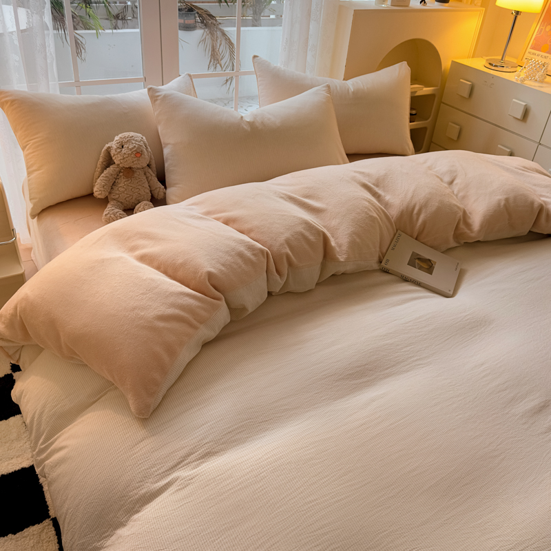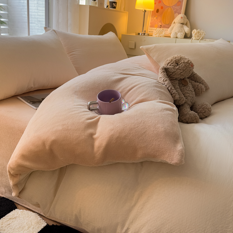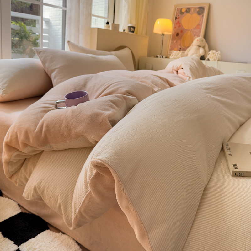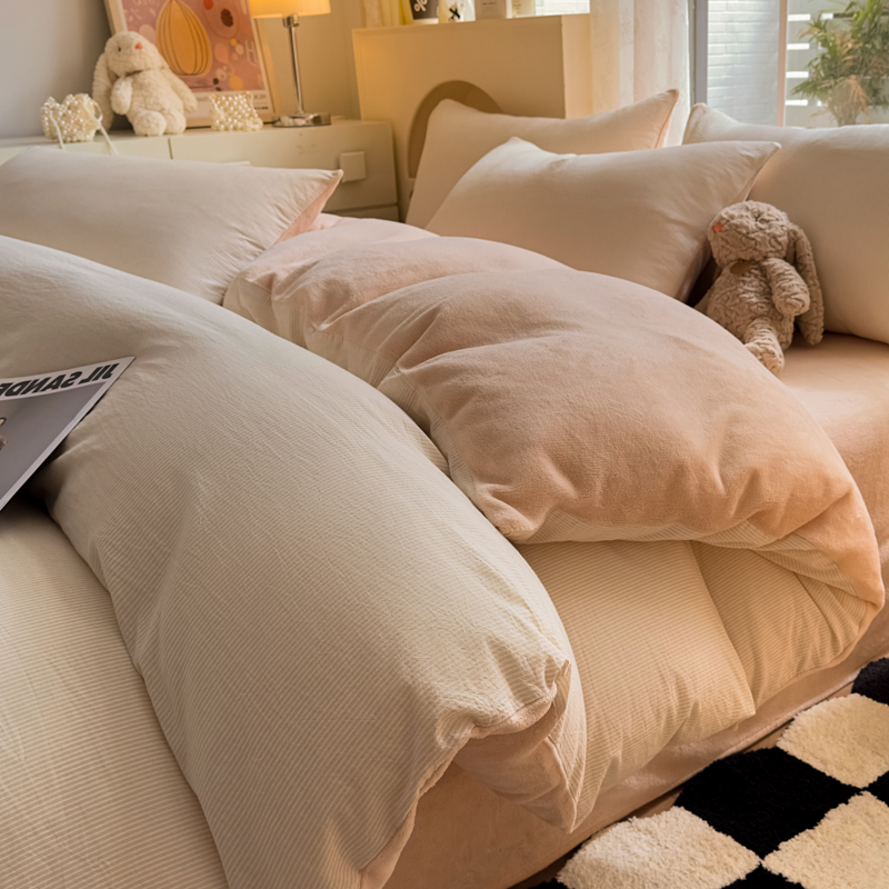 当前位置: 91家纺网 > 商品网购 > 床品套件 > 四件套 > 牛奶绒四件套 > 2024最新无印良品风双拼全棉色织水洗棉加牛奶绒四件套简约全棉拼牛奶绒 棉+绒-米密条