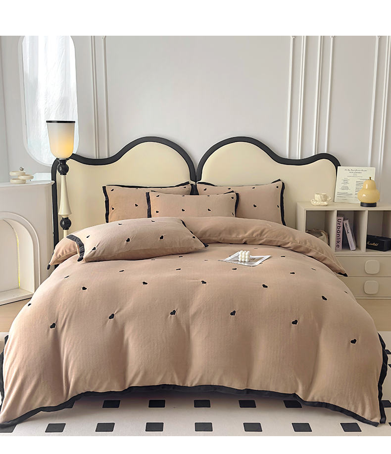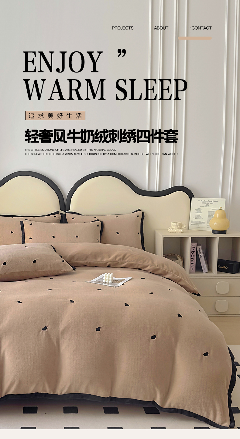 美梦家纺 2024新款秋冬高克重牛奶绒绣花四件套系列-绒蝴蝶结 绒爱心-卡其