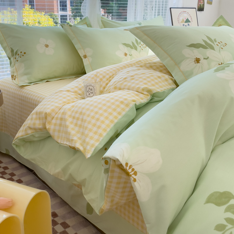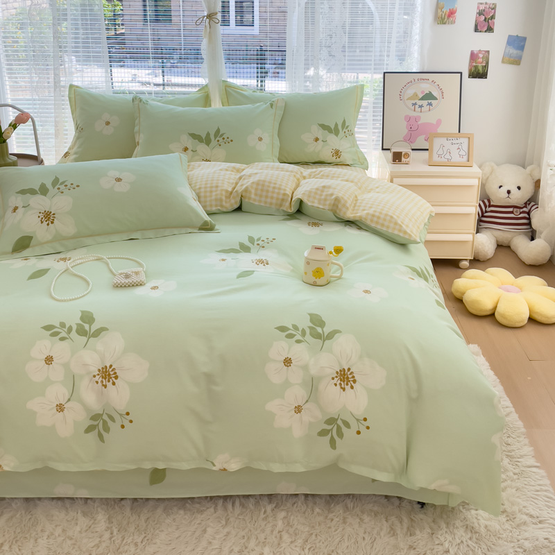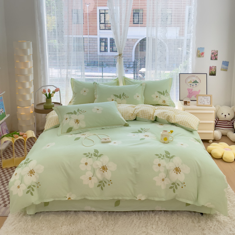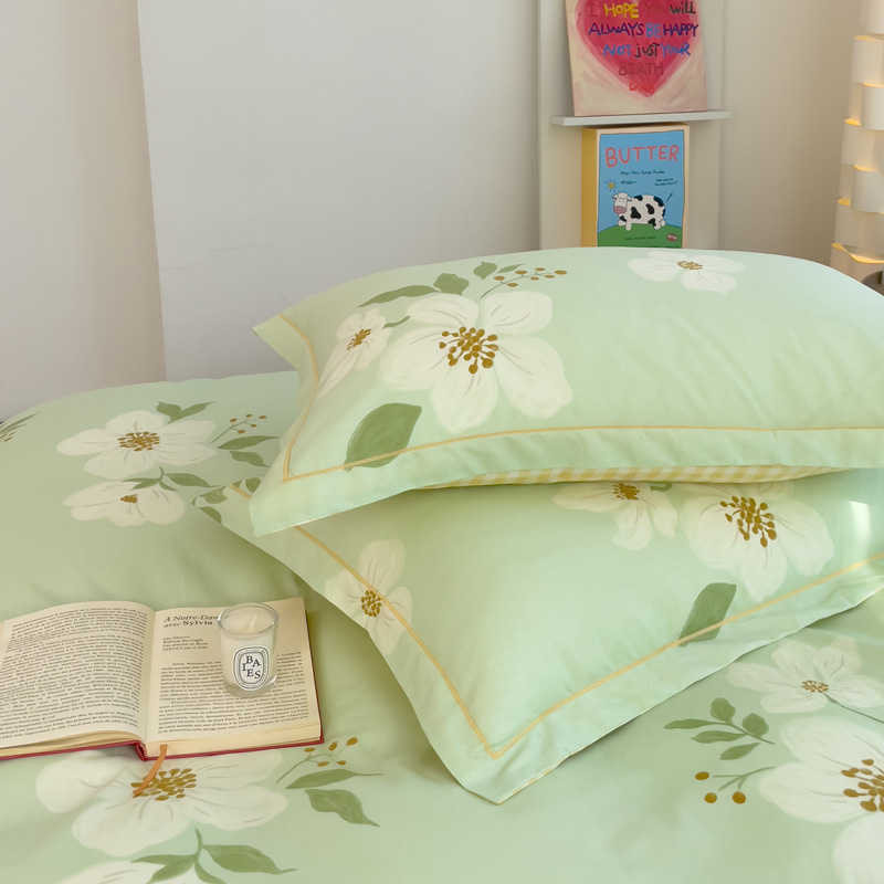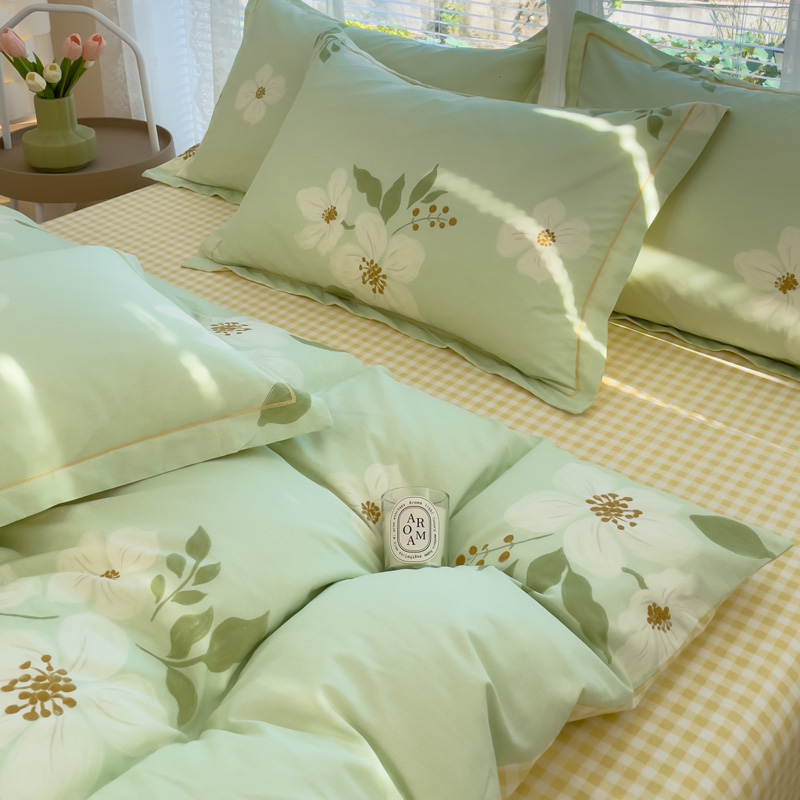 铭博家纺 新款直播爆款网红全棉四件套13070印花吊边一字绣纯棉四件套工艺款 春光绿意