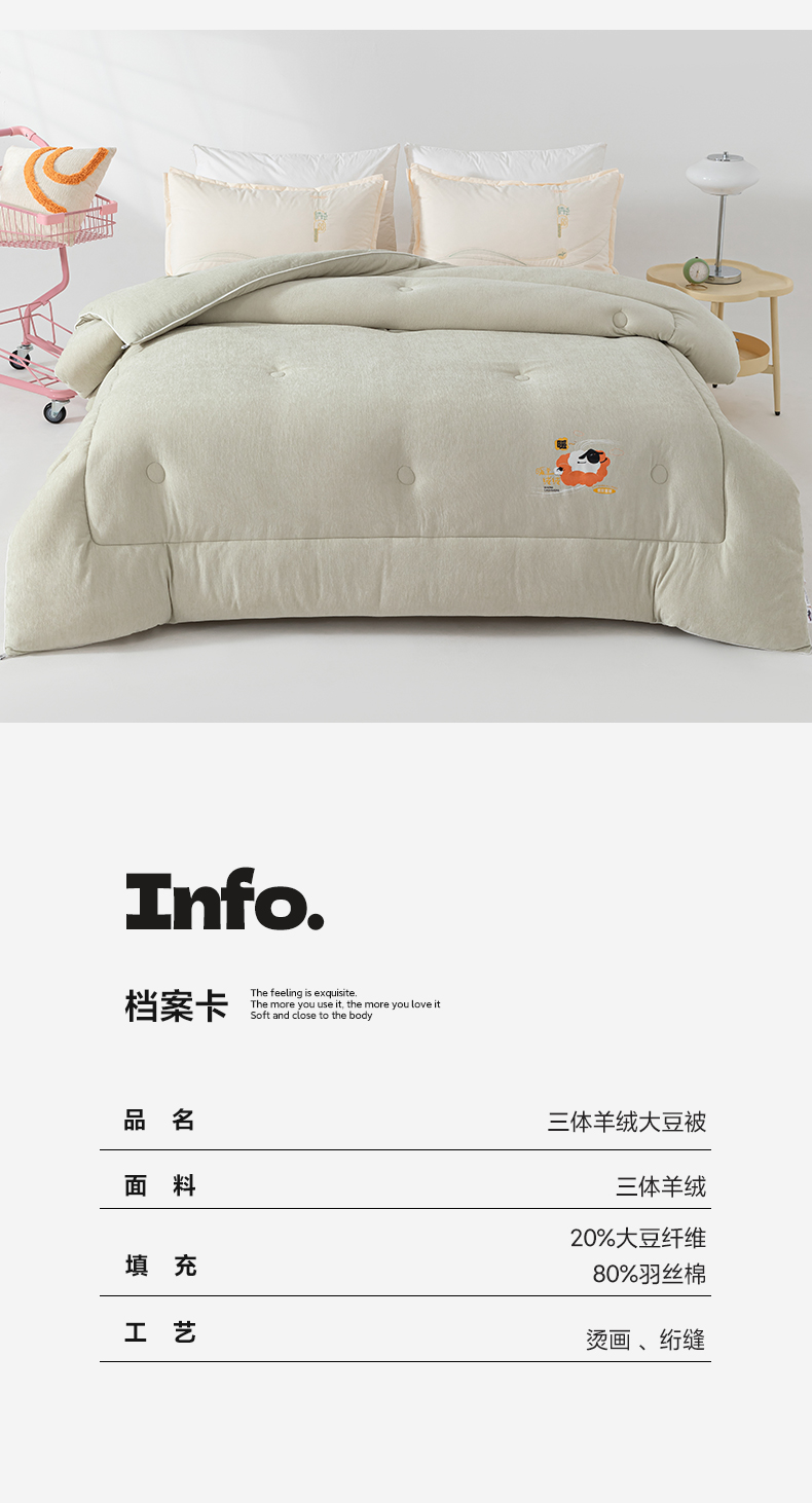 当前位置: 91家纺网 > 商品网购 > 被子 > 冬被 > 爱来伊家纺 2024新款三体羊绒加厚保暖冬被芯大豆纤维被春秋被子被芯 山体羊绒大豆被-淡绿