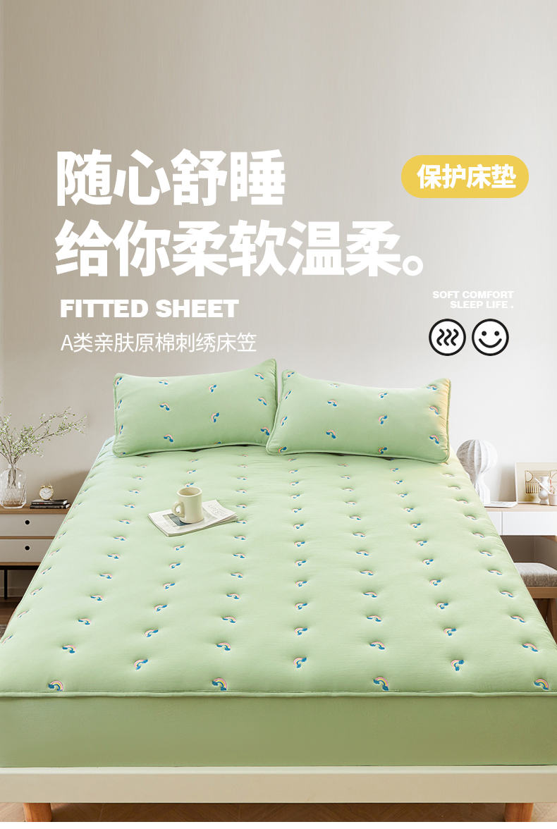 迪梦思家纺 2024新款A类亲肤原棉刺绣床笠床垫保护套--彩虹系列 彩虹-豆绿