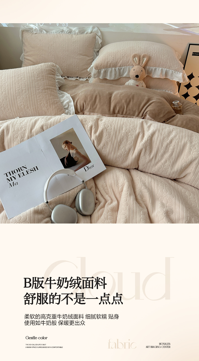 (总)三朵家纺 2025新款3D立体加厚雕花绒牛奶绒花边款四件套,花边宽条-灰色,花边宽条-蓝色,花边宽条-玉色,花边宽条-紫