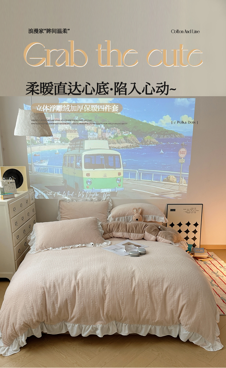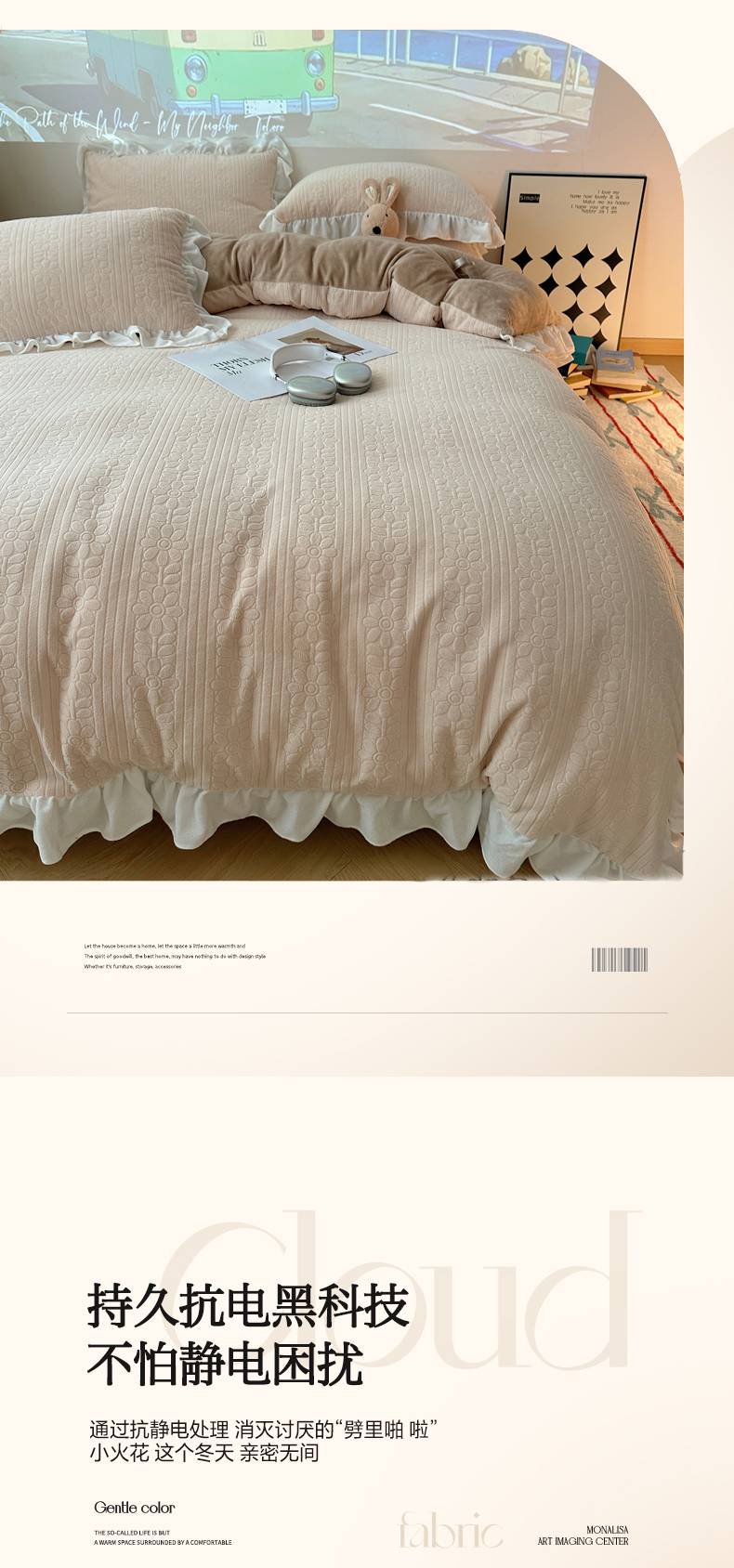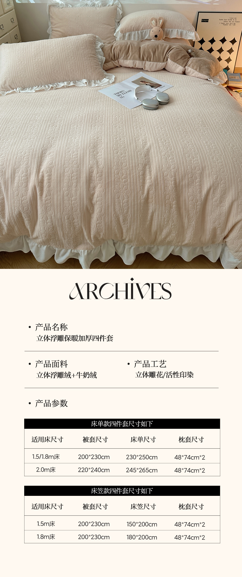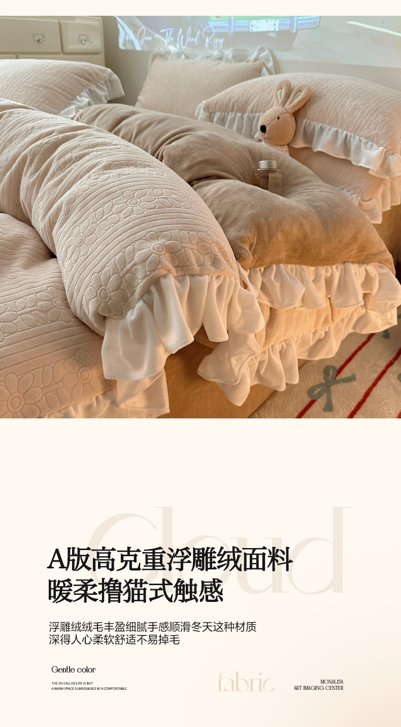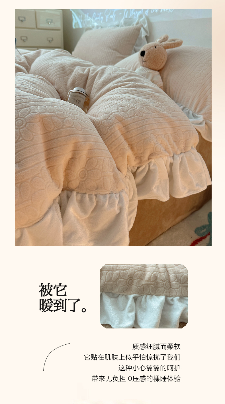 商品名称:三朵家纺 2024新款3D立体浮雕花边保暖加厚四件套 暖暖花语