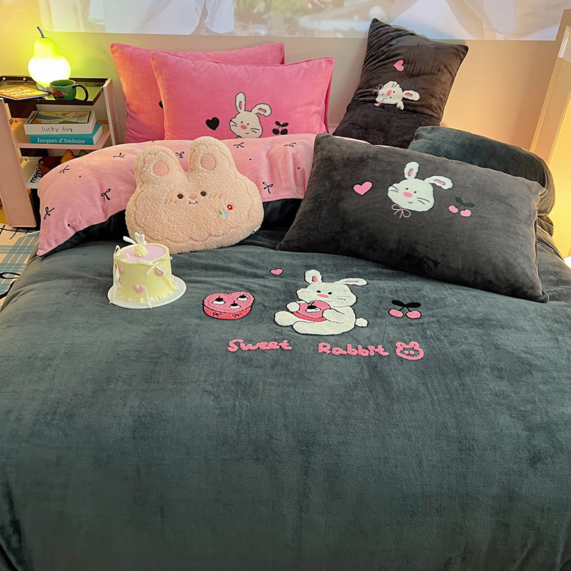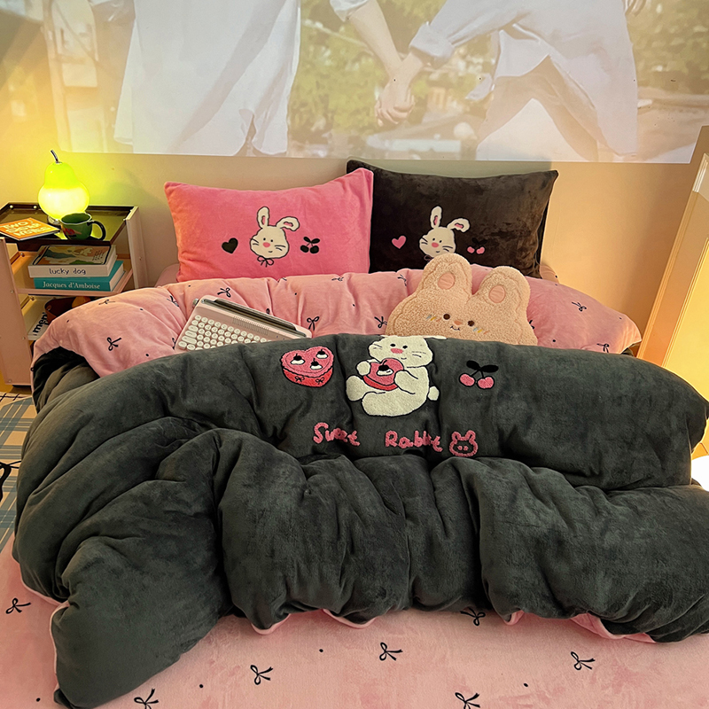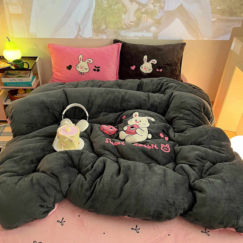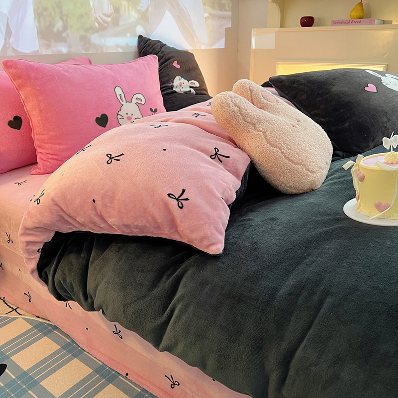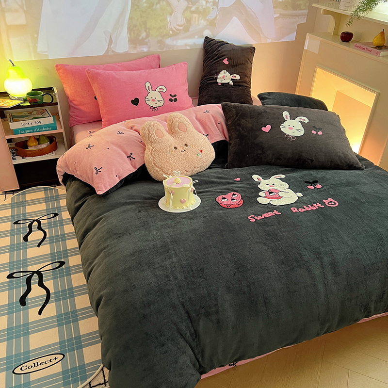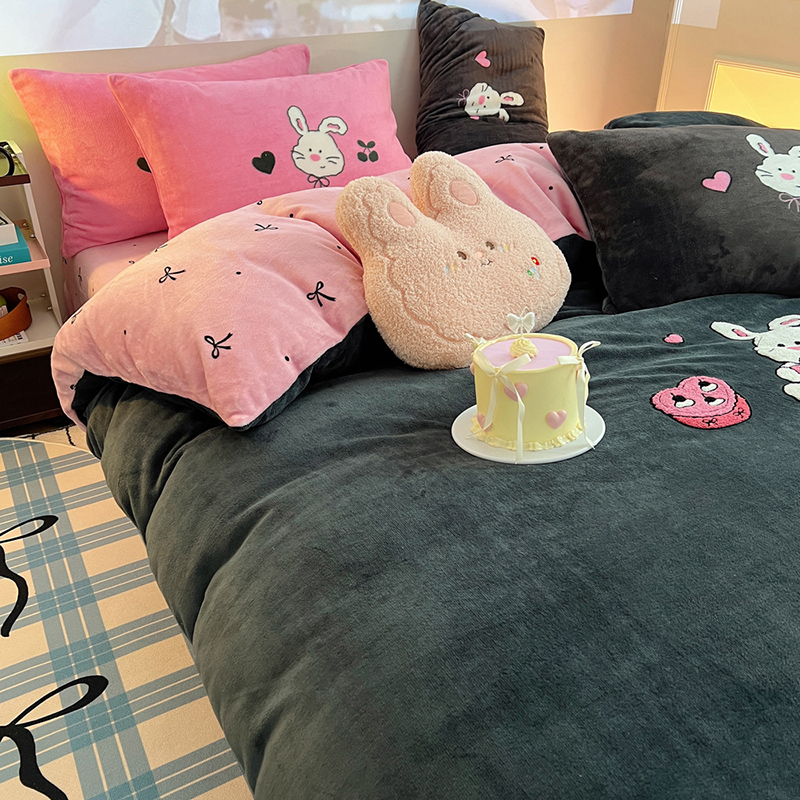 商品名称:桃喜 2024新款230g牛奶绒绣花系列四件套 黑粉兔兔