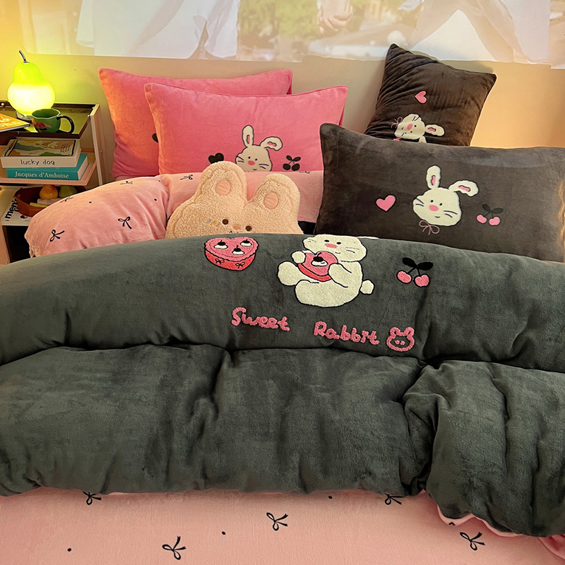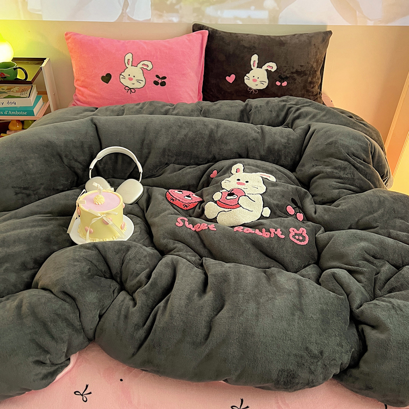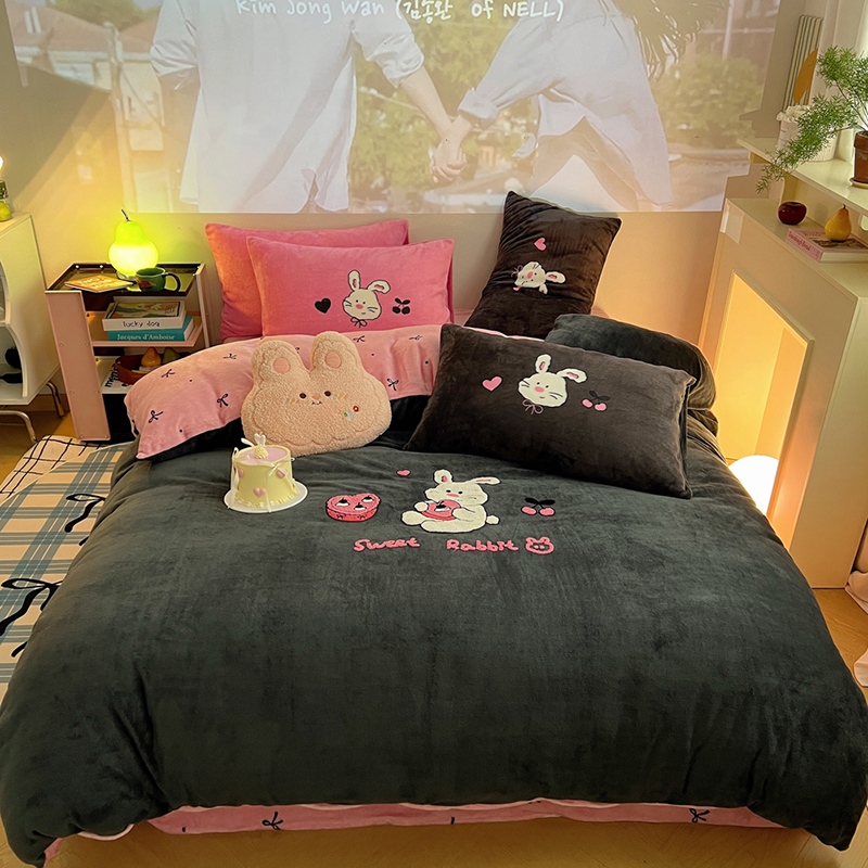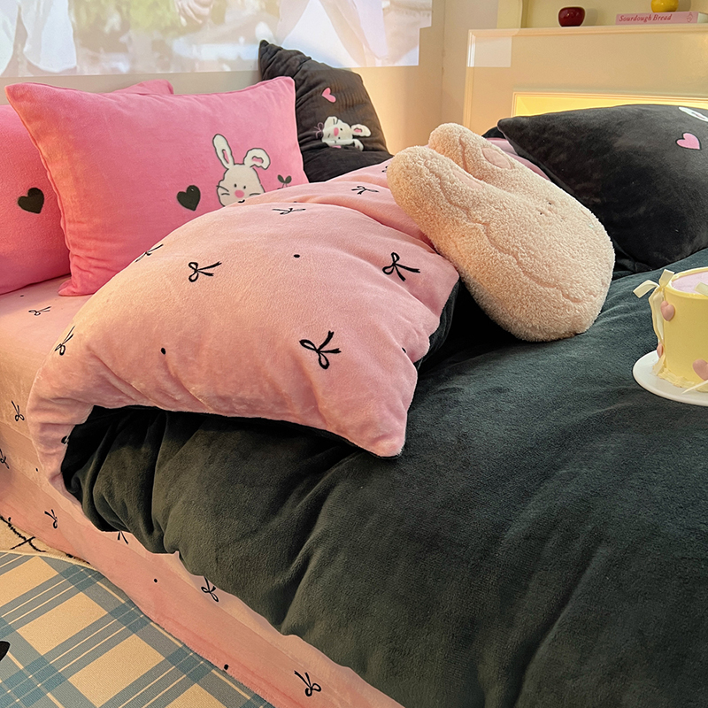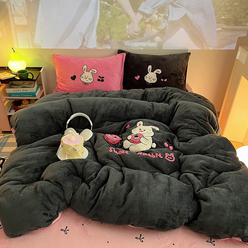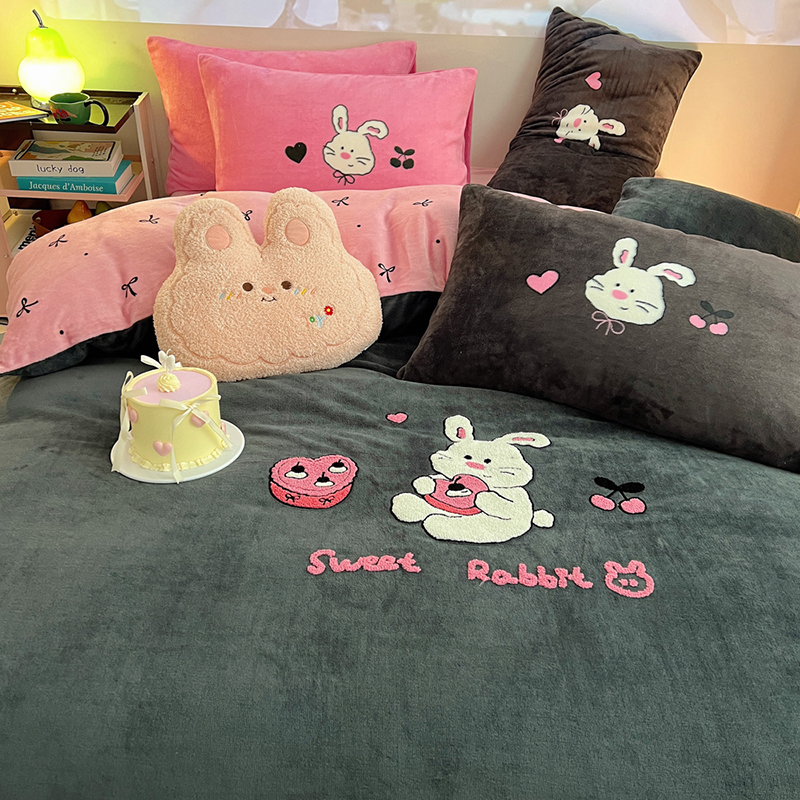 商品名称:桃喜 2024新款230g牛奶绒绣花系列四件套 黑粉兔兔