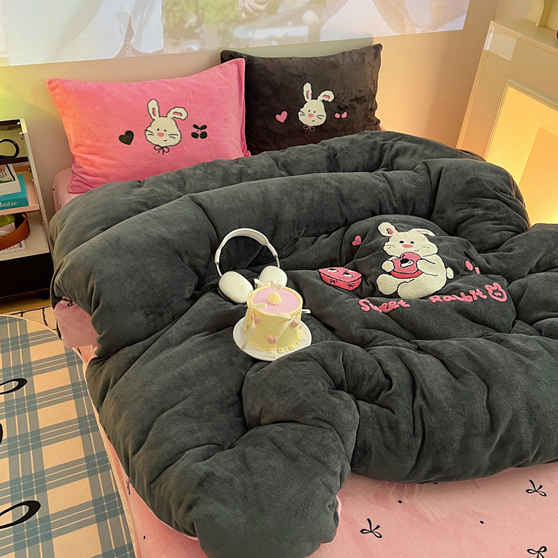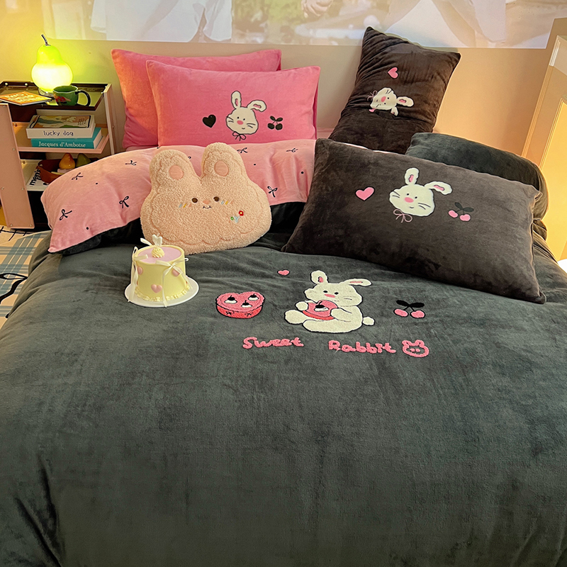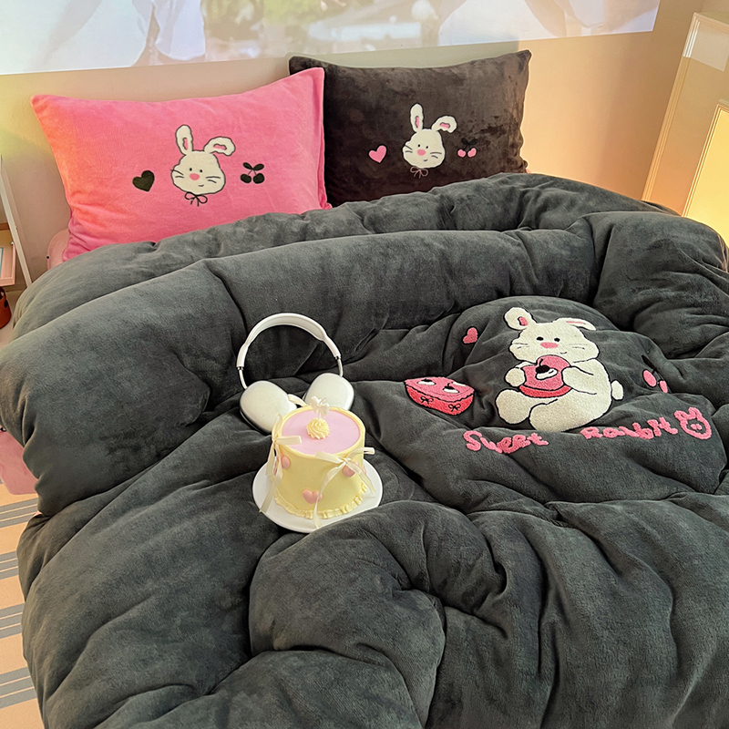 桃喜 2024新款230g牛奶绒绣花系列四件套 黑粉兔兔