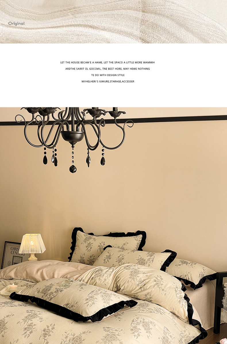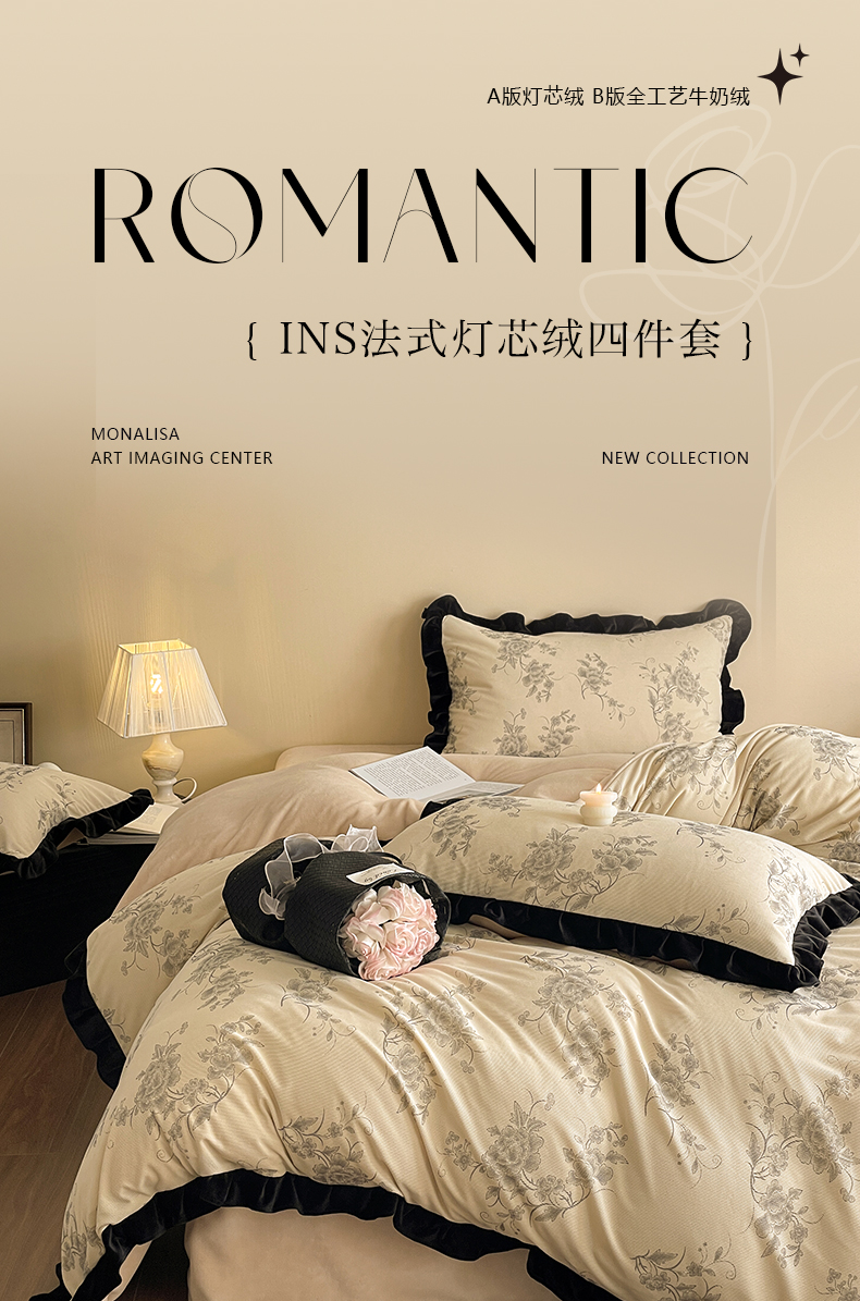 商品名称:羚羊语家纺 2024新款轻法式赫本风灯芯绒四件套提花立体韩版花边牛奶绒三件套 山茶