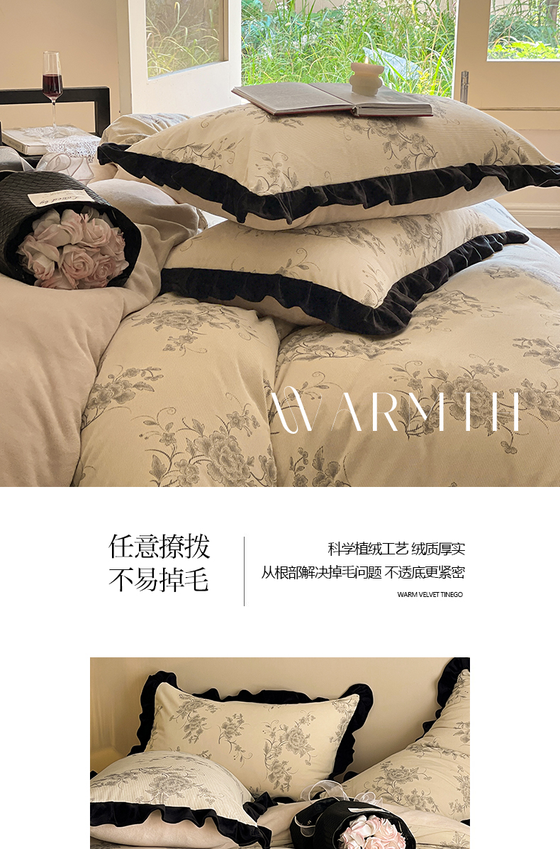 羚羊语家纺 2024新款轻法式赫本风灯芯绒四件套提花立体韩版花边牛奶绒三件套 山茶