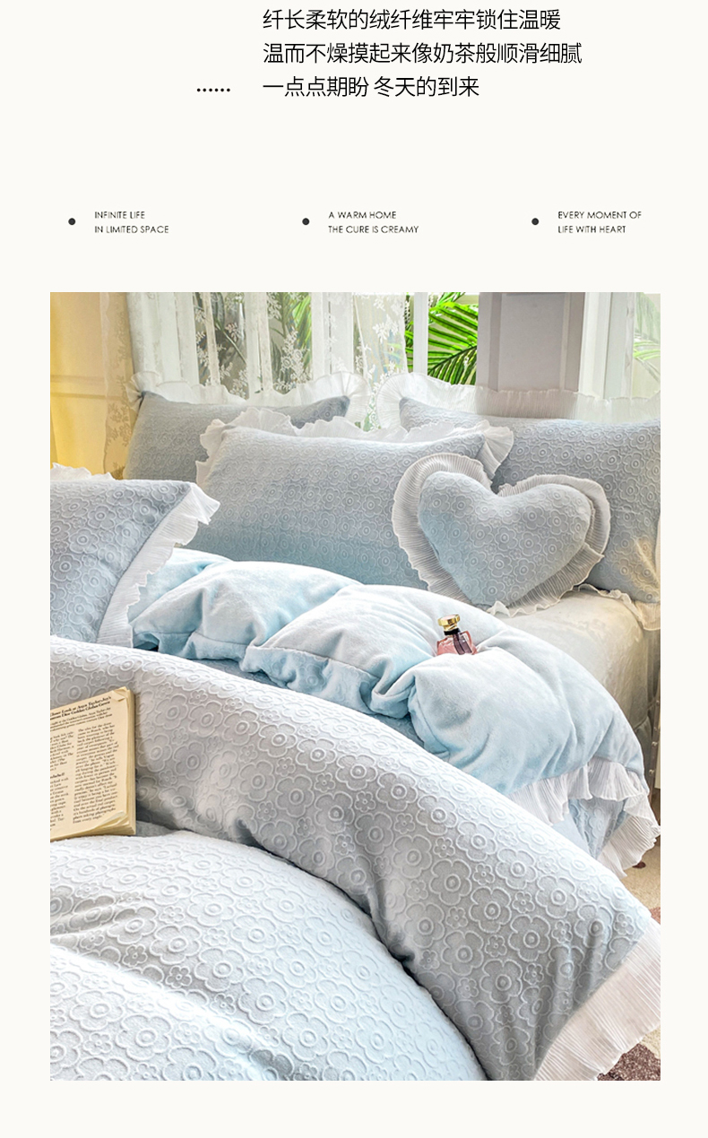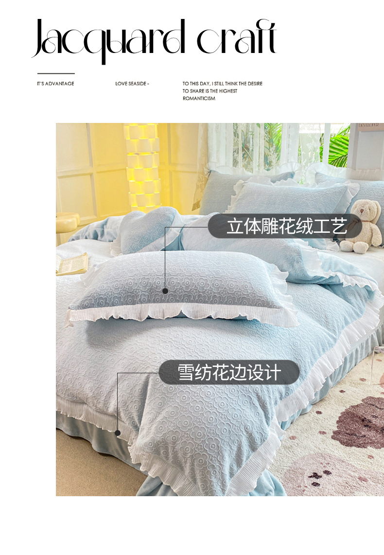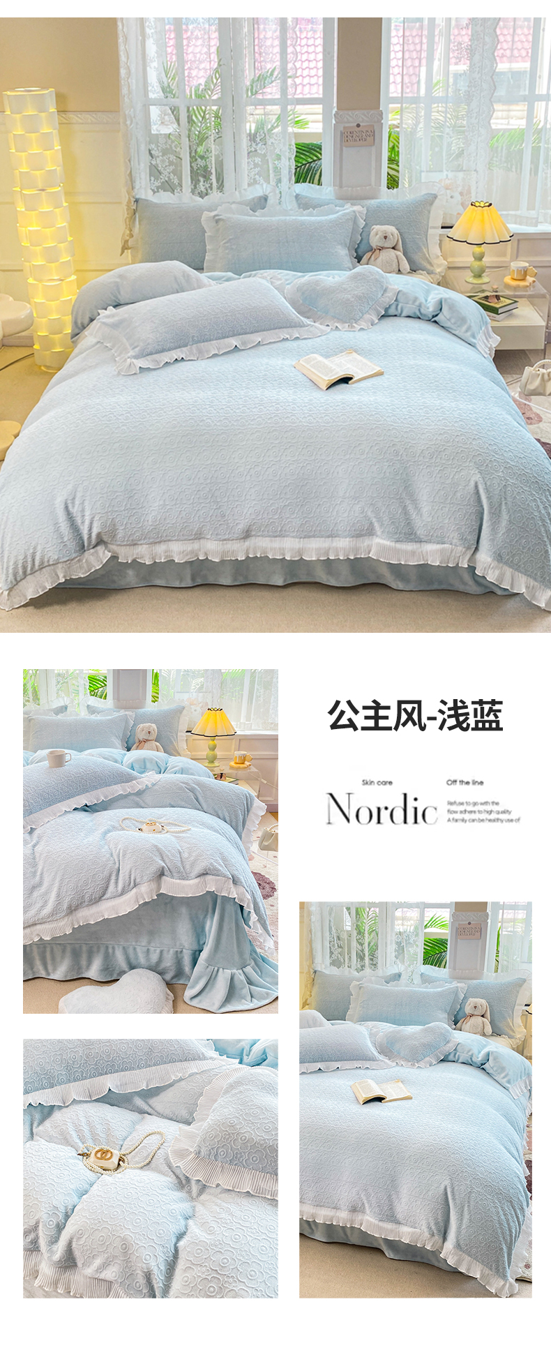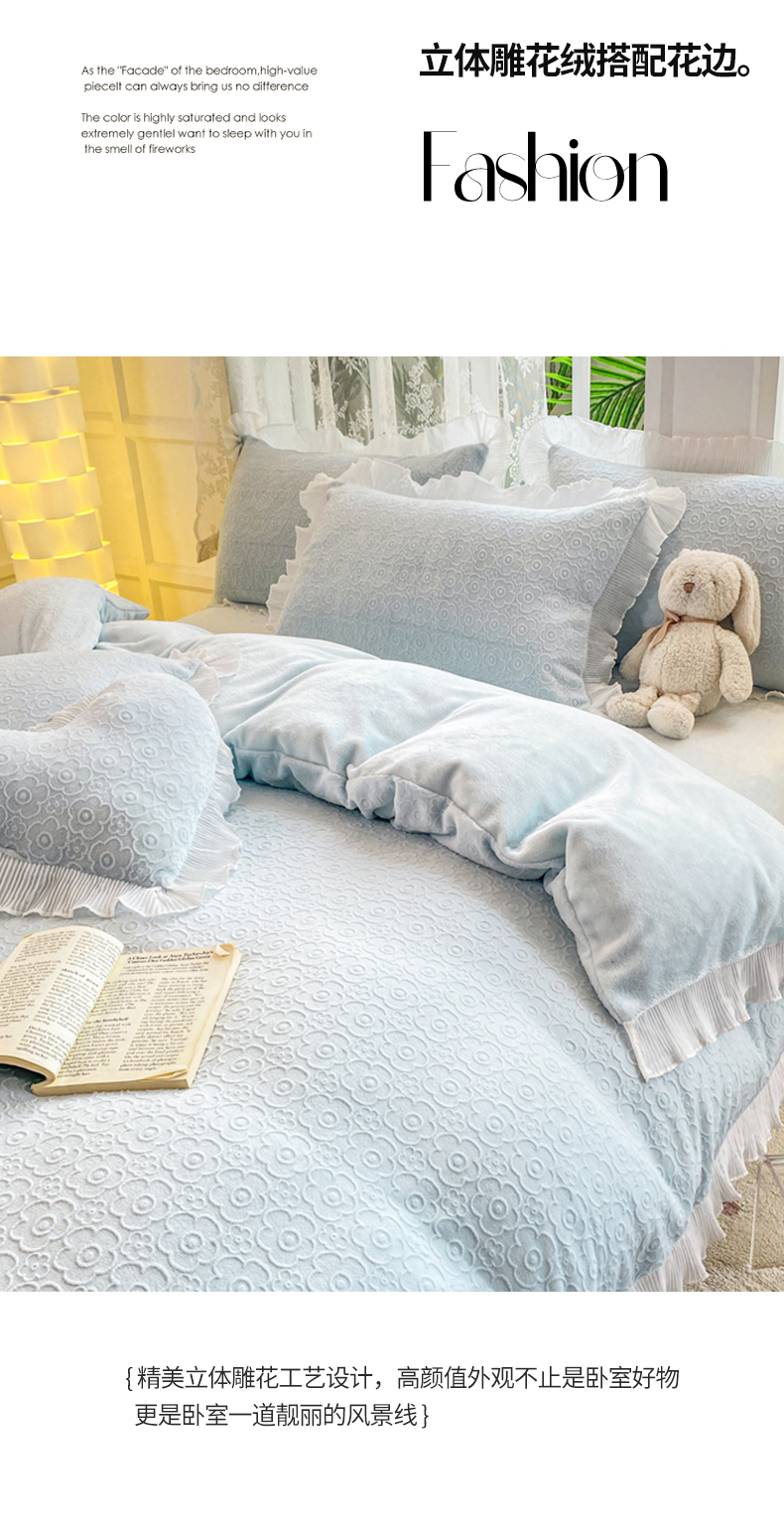 商品名称:畅畅家纺 2024直播爆款8斤230克雕花牛奶绒韩版花边法莱绒烂花四件套 公主风-浅蓝