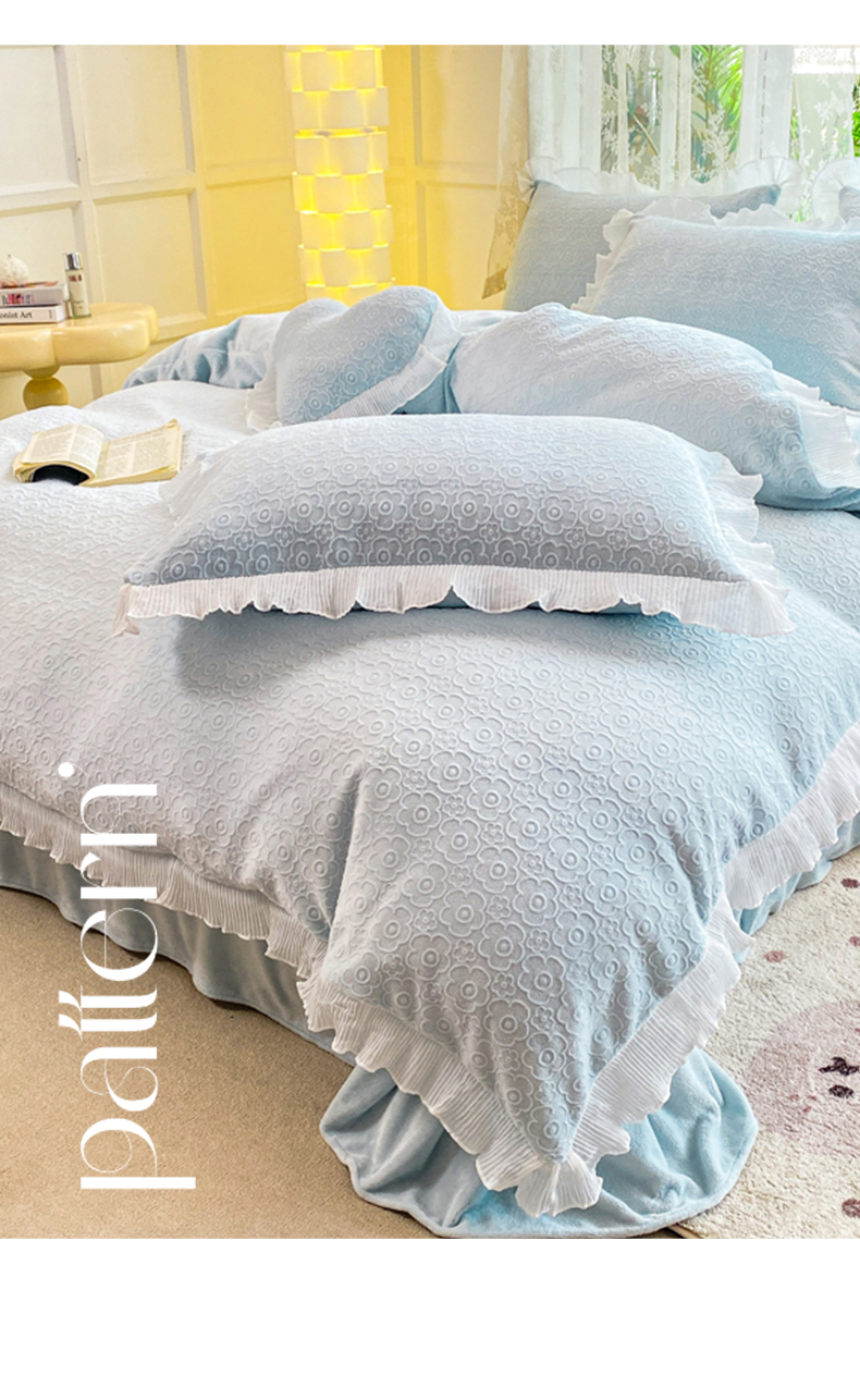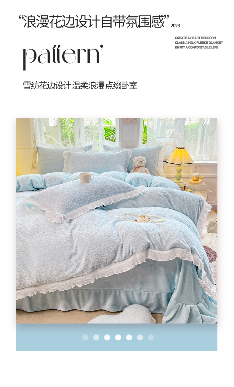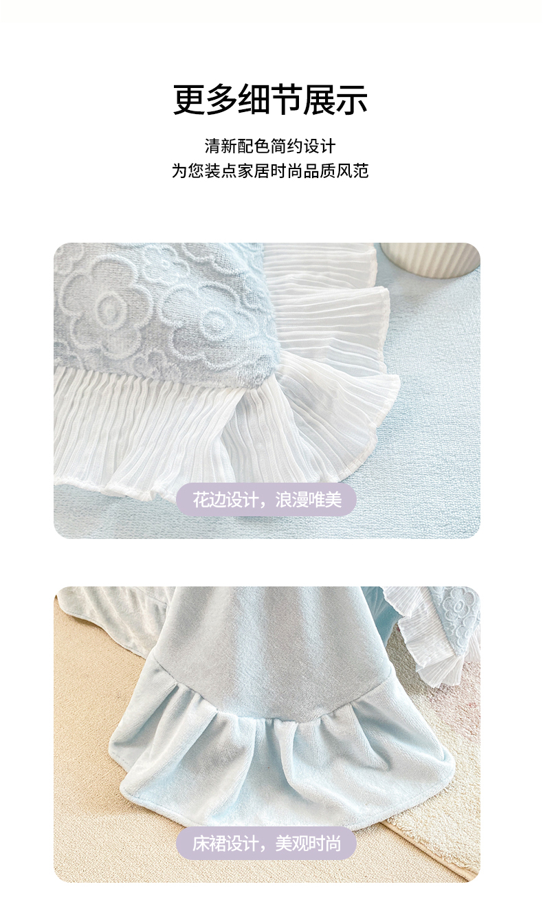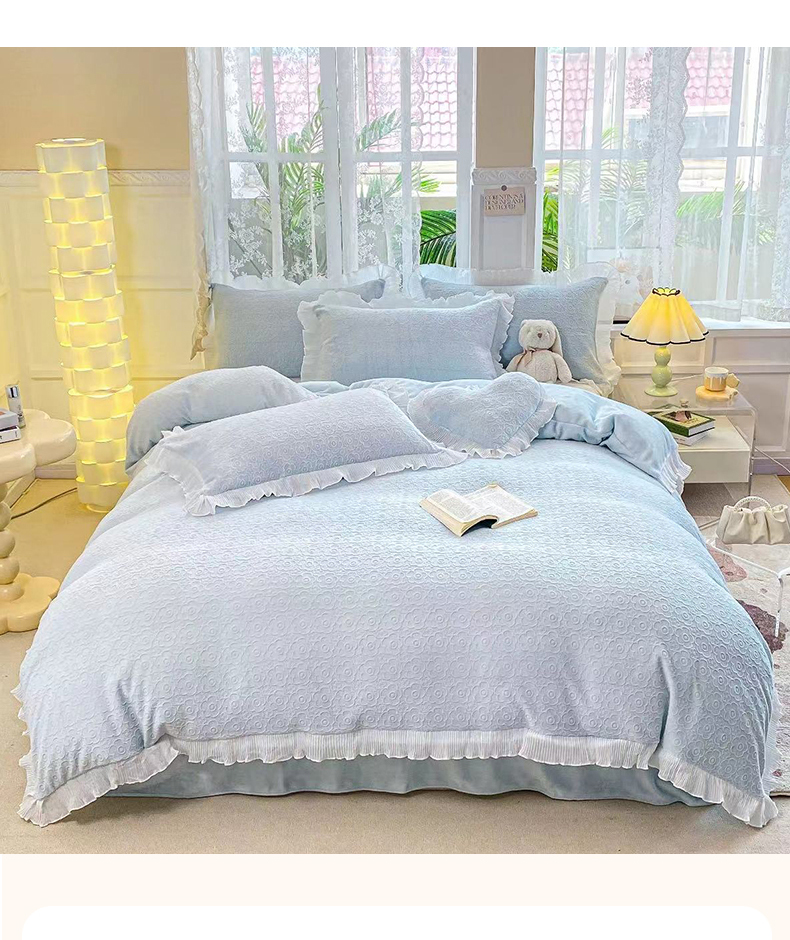 商品名称:畅畅家纺 2024直播爆款8斤230克雕花牛奶绒韩版花边法莱绒烂花四件套 公主风-浅蓝