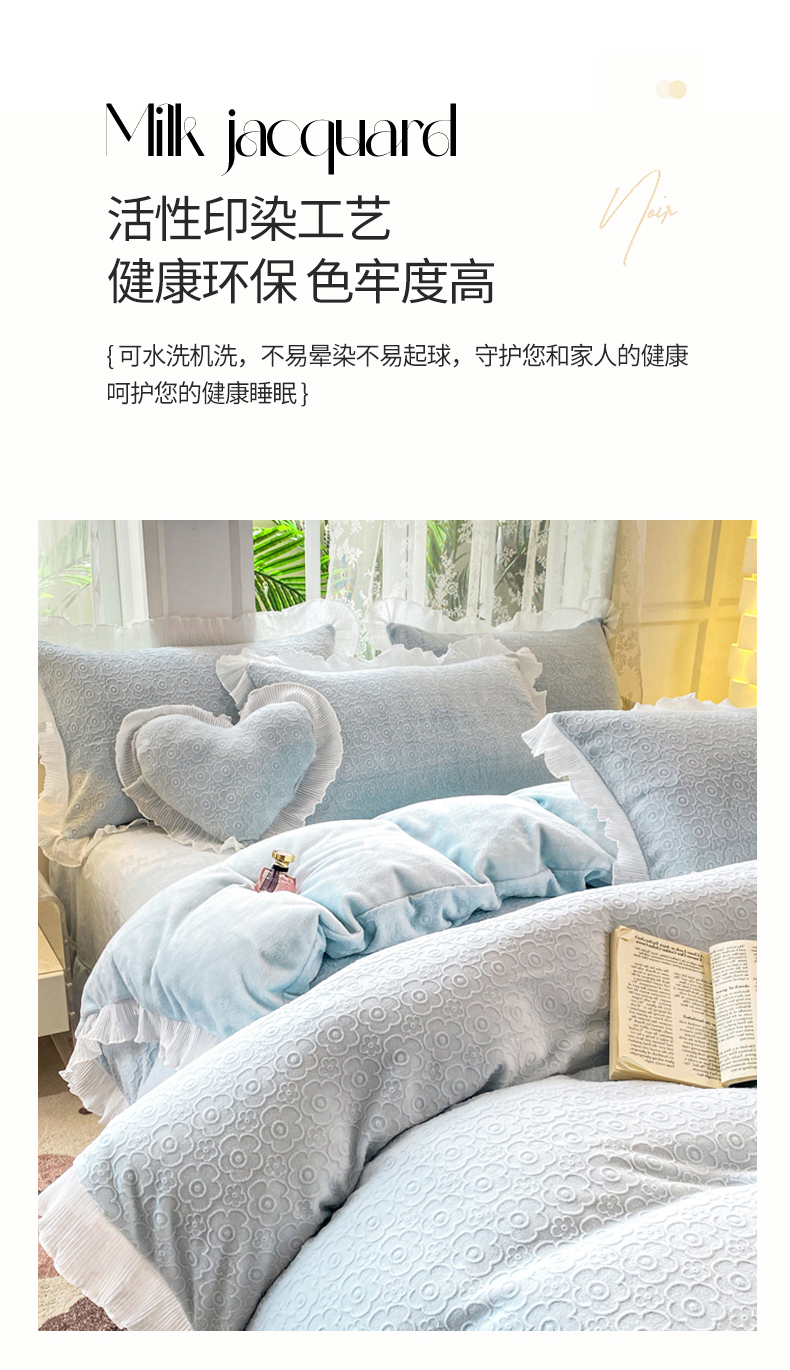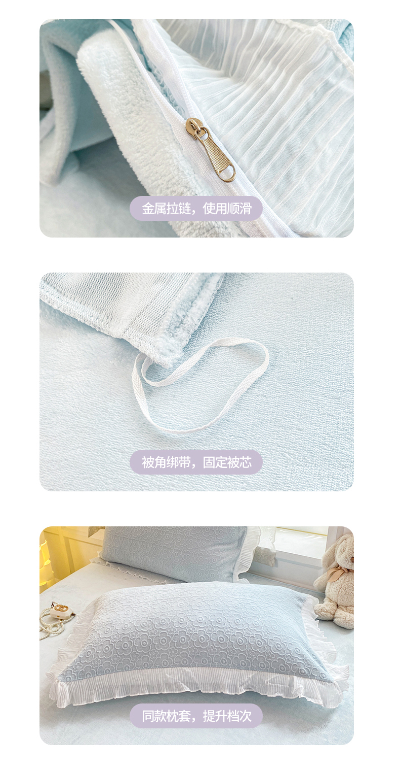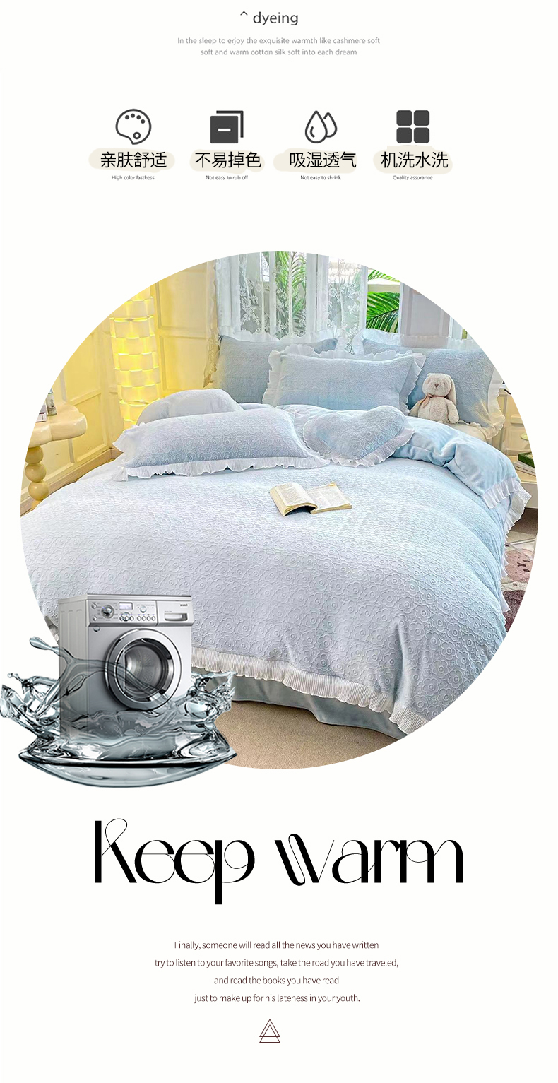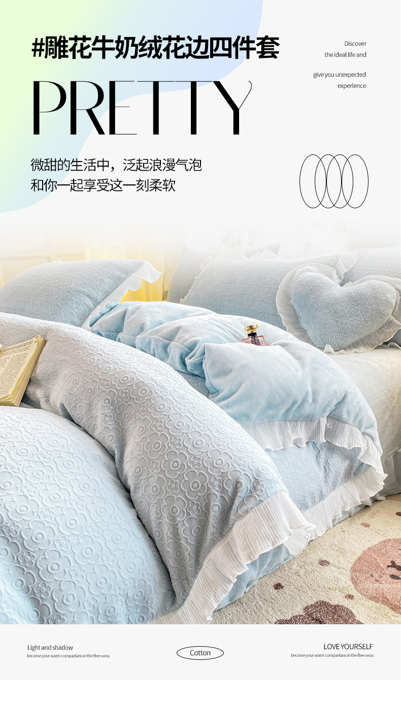商品名称:畅畅家纺 2024直播爆款8斤230克雕花牛奶绒韩版花边法莱绒烂花四件套 公主风-浅蓝