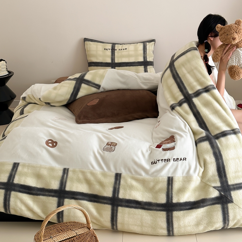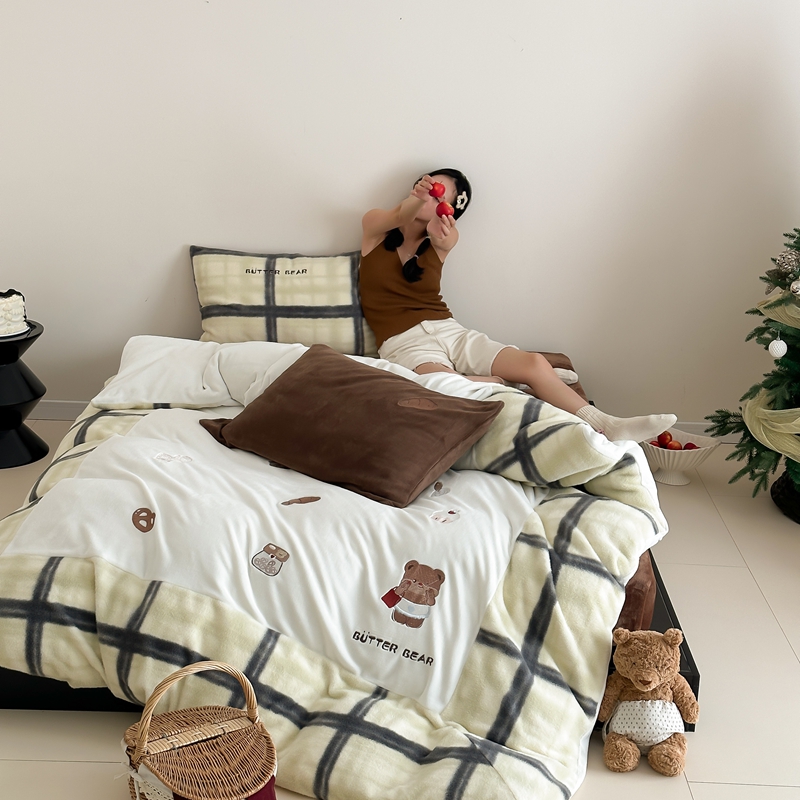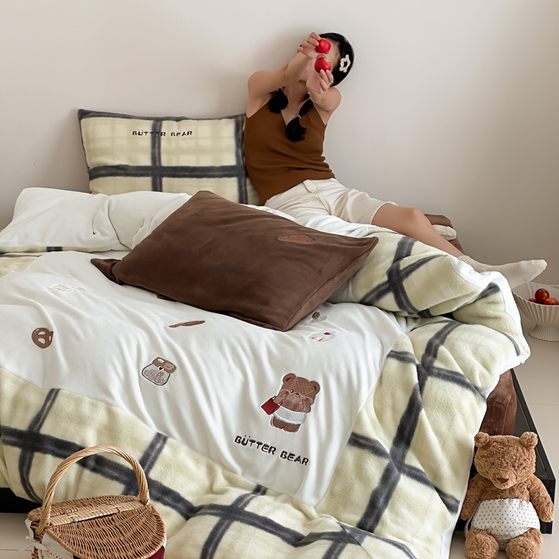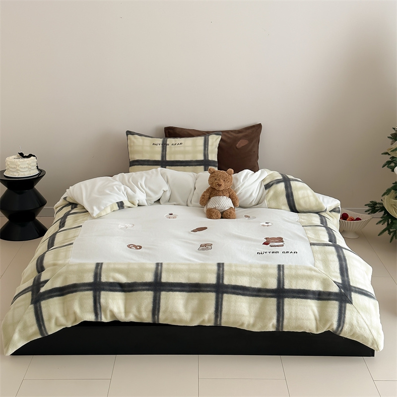 商品名称:赫帛 2024新款卡通刺绣大宽边仿生羊毛绒四件套-面包小熊 面包小熊-黄色