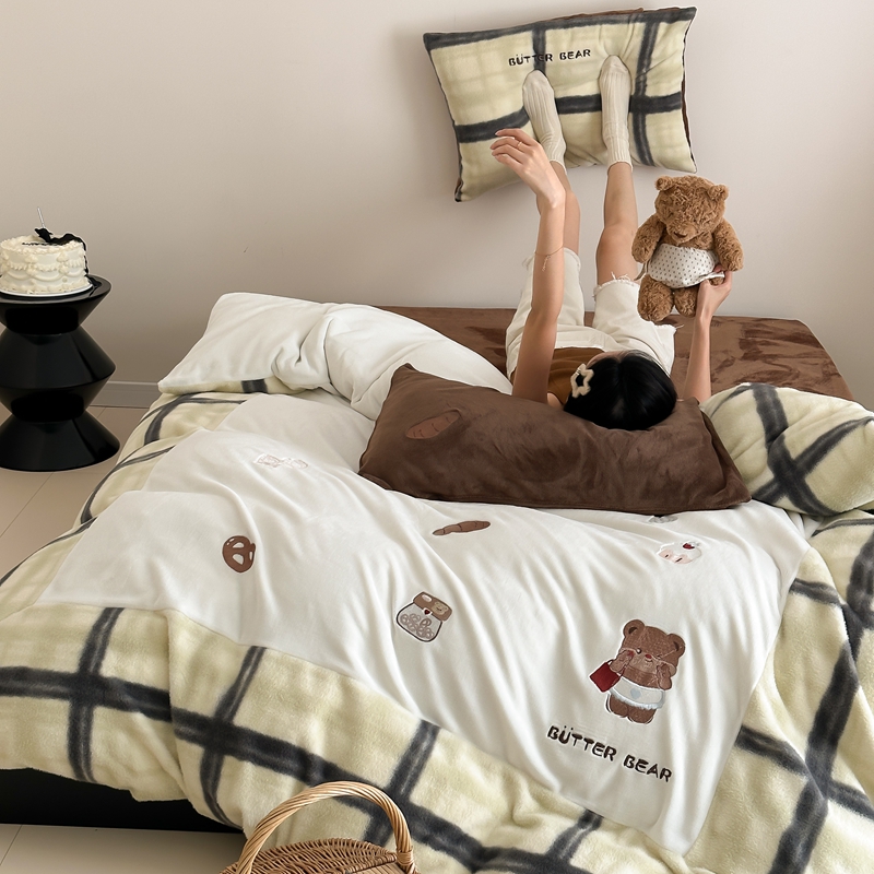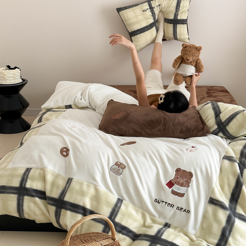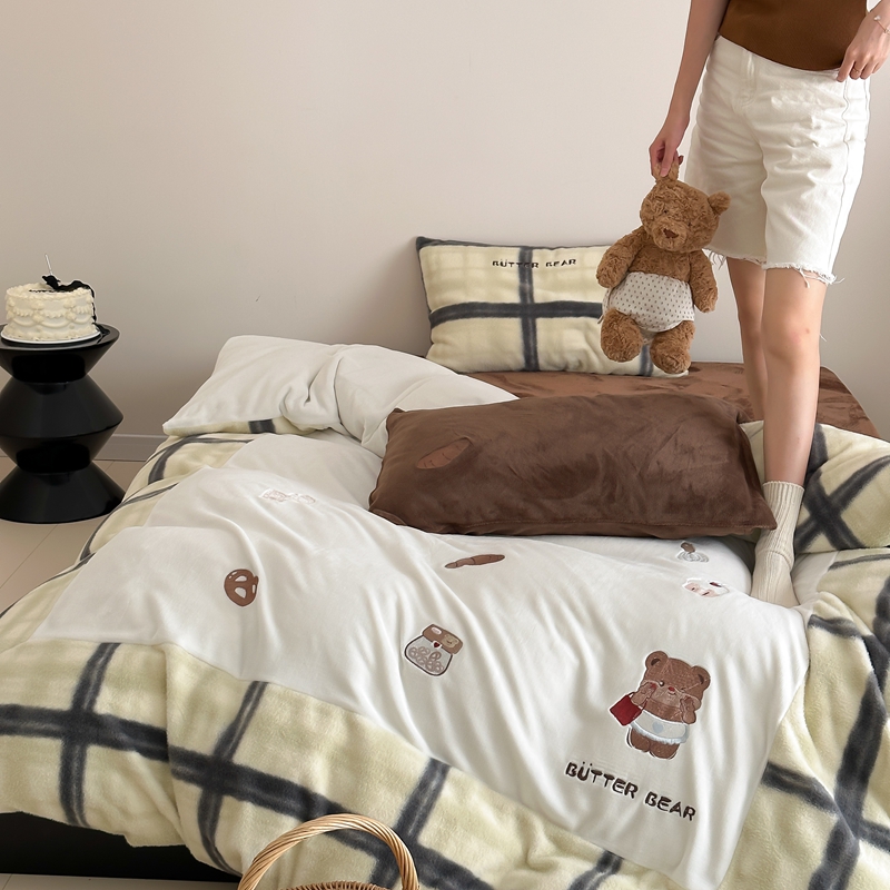 赫帛 2024新款卡通刺绣大宽边仿生羊毛绒四件套-面包小熊 面包小熊-黄色