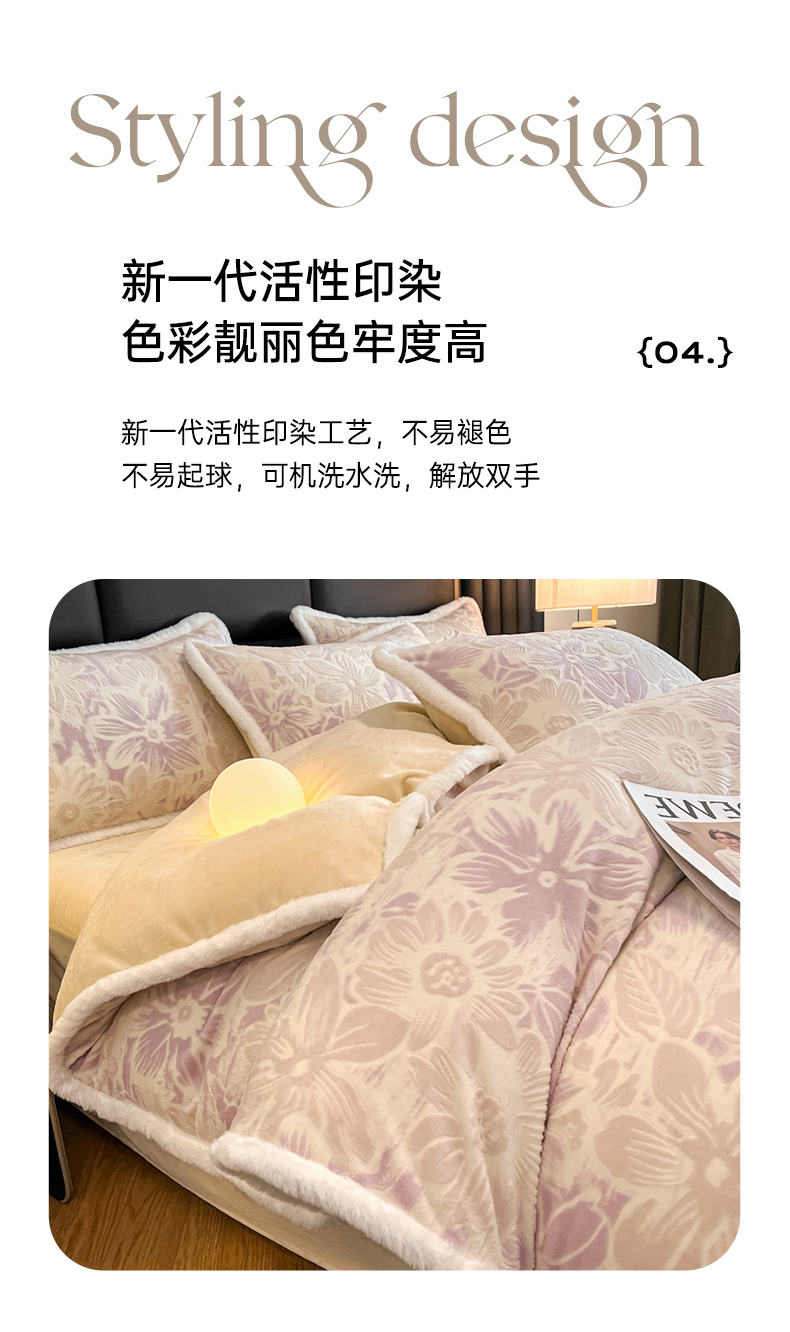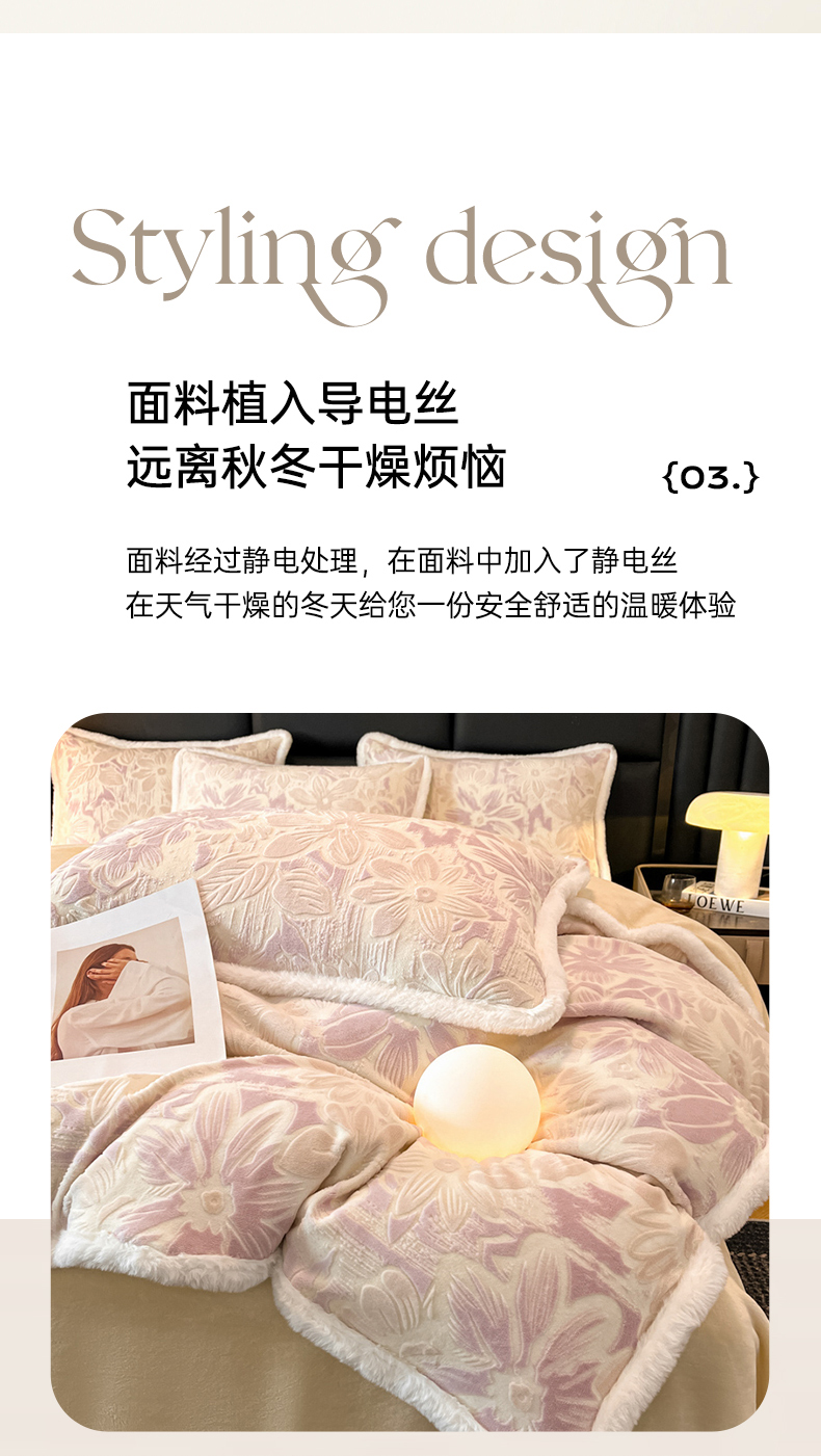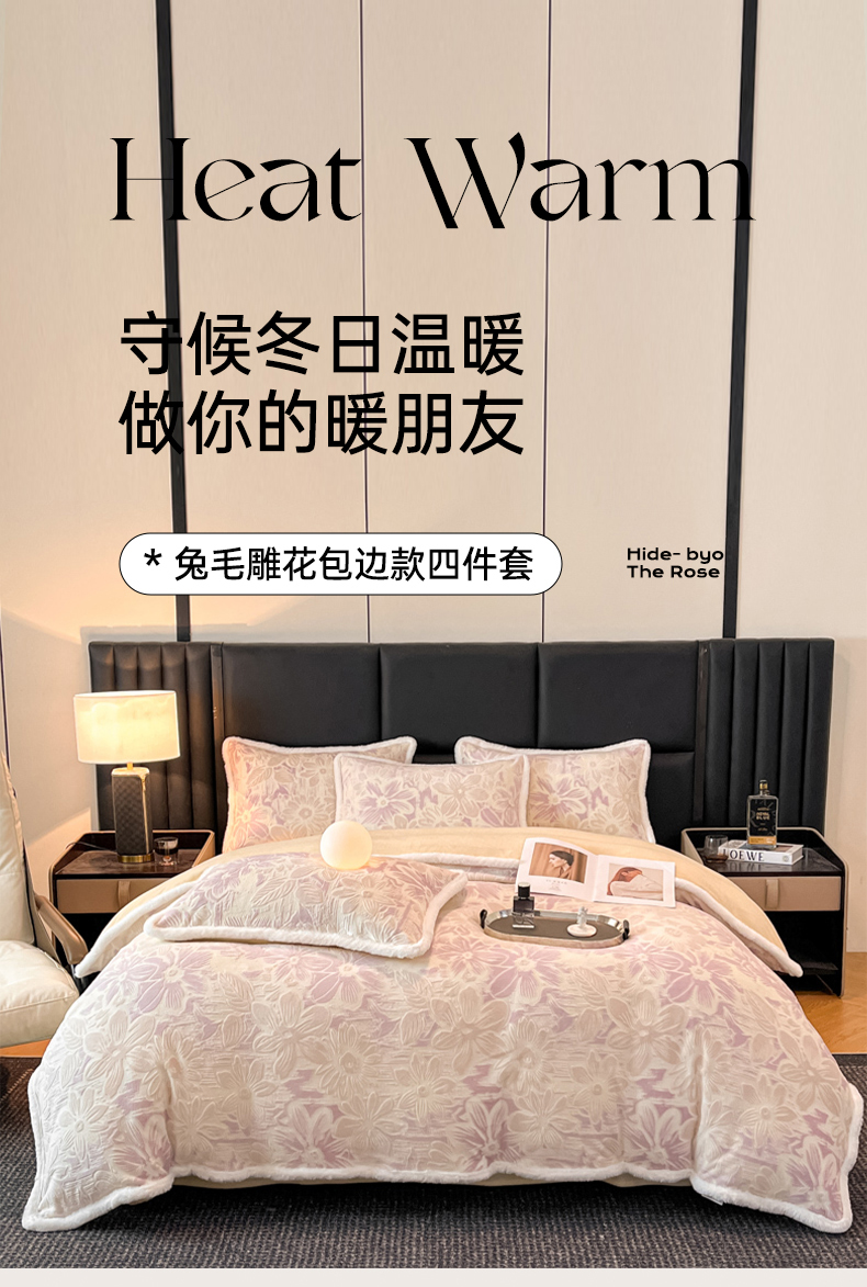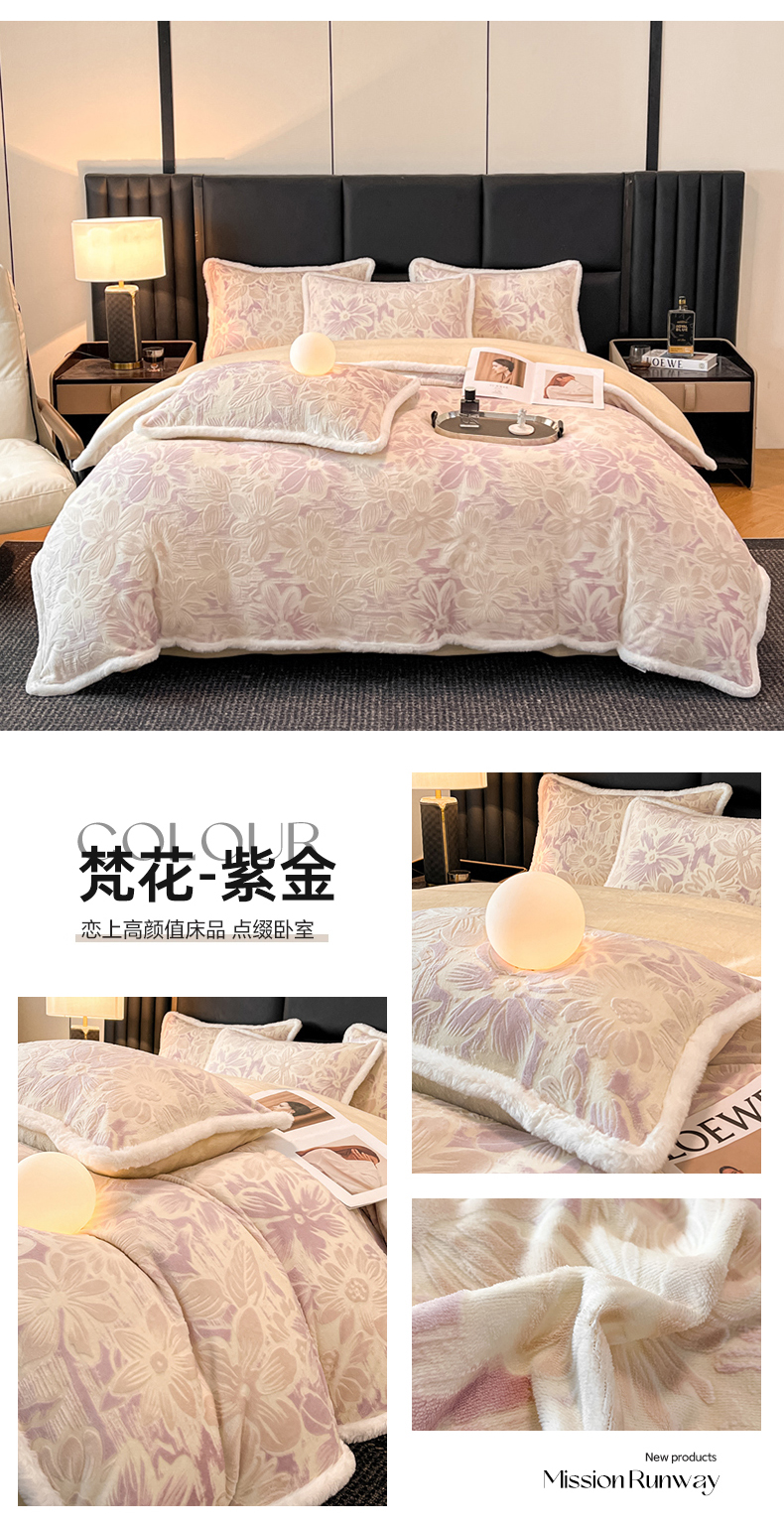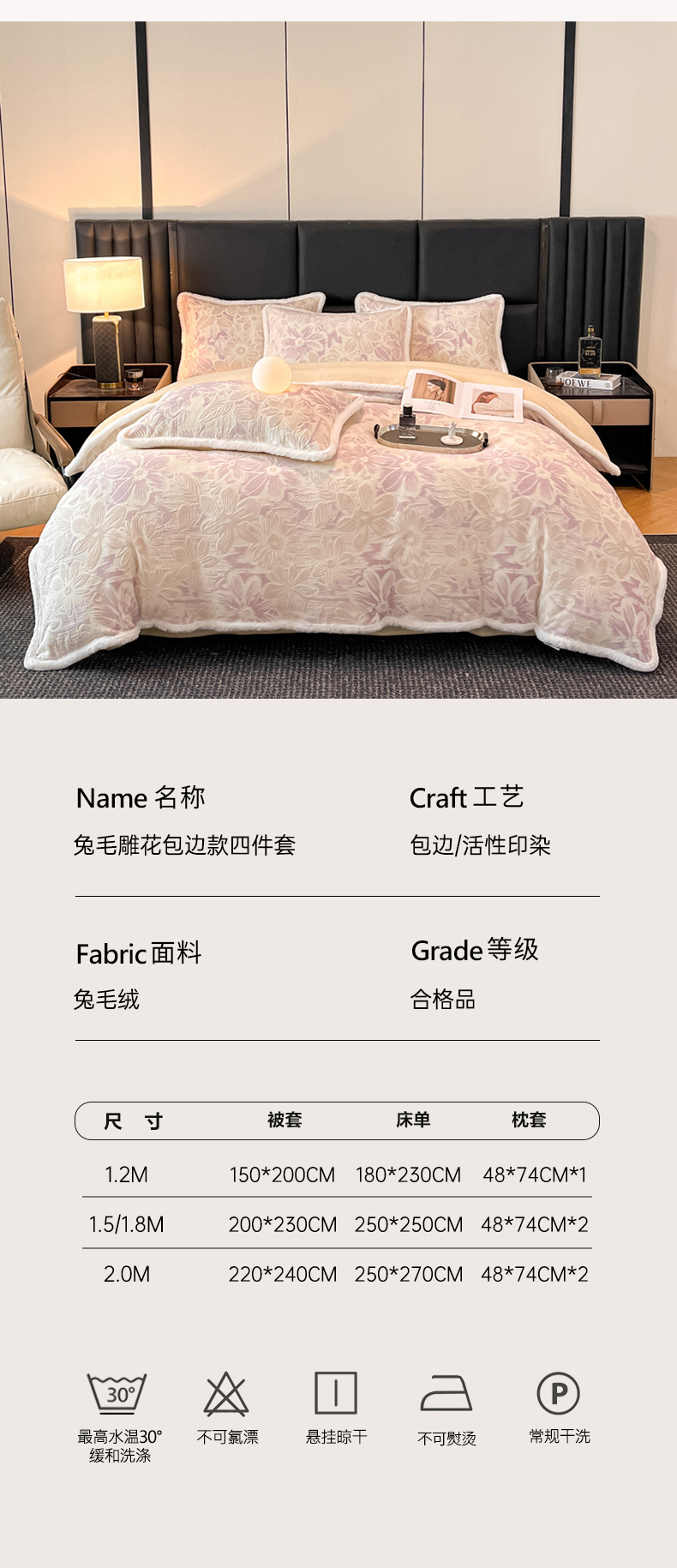商品名称:畅畅家纺 2025新款兔毛绒大包边雕花牛奶绒绒四件套 梵花-紫金