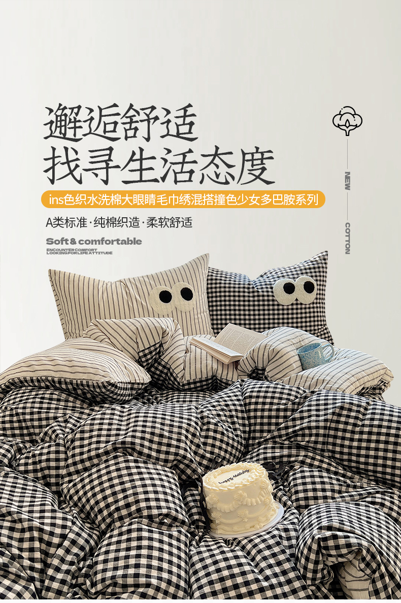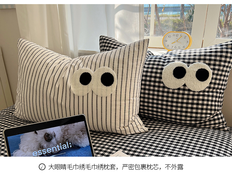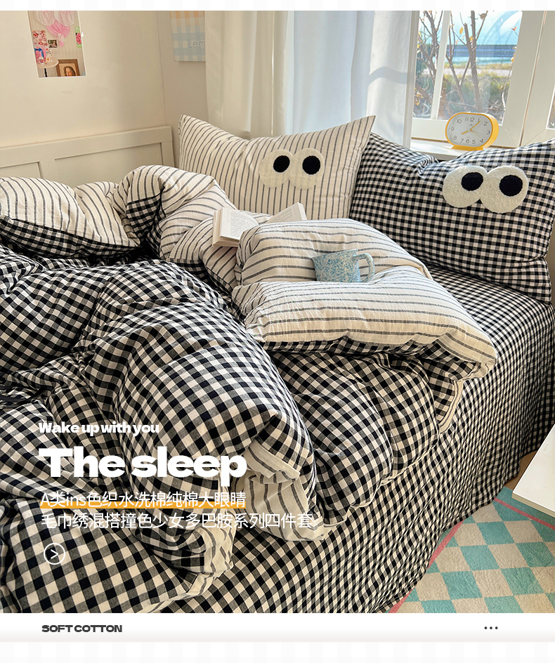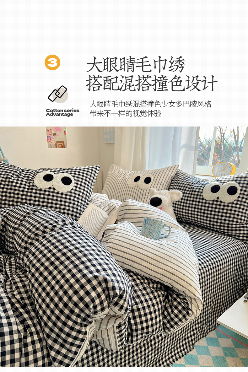 当前位置: 91家纺网 > 商品网购 > 床品套件 > 四件套 > 水洗棉四件套 > 桃子家居 2026新款A类ins色织水洗棉纯棉大眼睛毛巾绣混搭撞色少女多巴胺系列四件套 色织水洗棉-大眼格格灰条2
