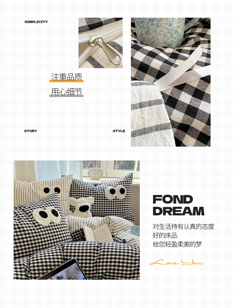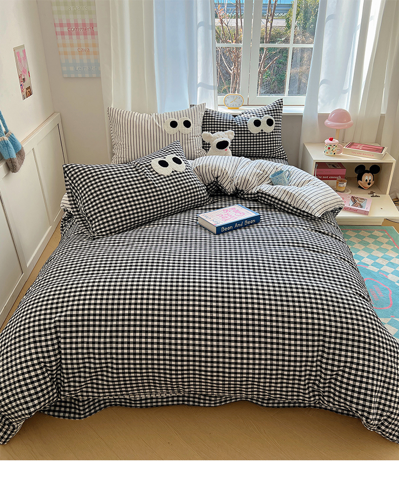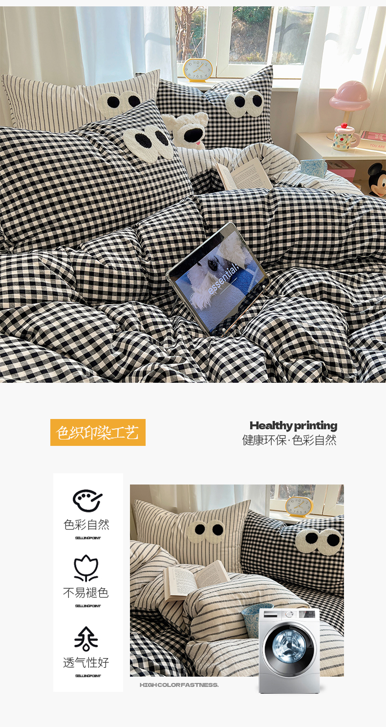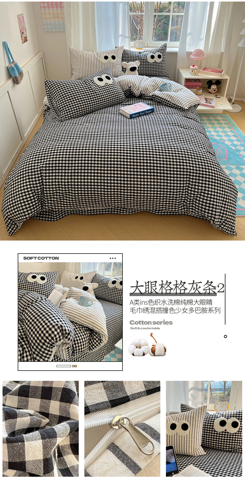 当前位置: 91家纺网 > 商品网购 > 床品套件 > 四件套 > 水洗棉四件套 > 桃子家居 2026新款A类ins色织水洗棉纯棉大眼睛毛巾绣混搭撞色少女多巴胺系列四件套 色织水洗棉-大眼格格灰条2