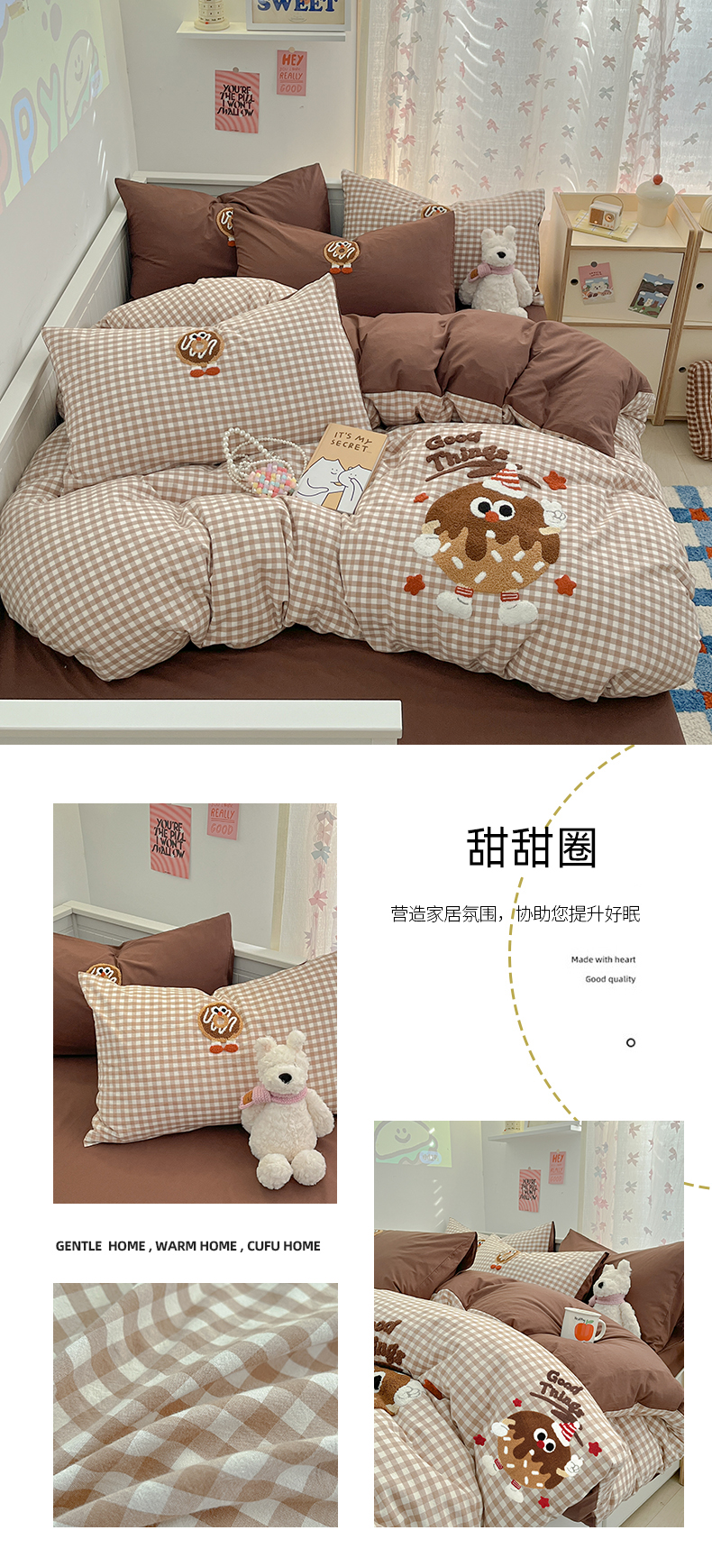 商品名称:呗旺鹿 2025新款A类全棉色织水洗棉毛巾绣系列四件套 甜甜圈
