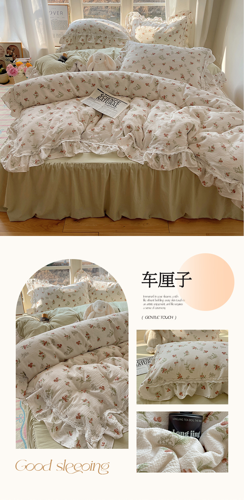当前位置: 91家纺网 > 商品网购 > 床品套件 > 四件套 > 其它四件套 > 轻奢坊 2025新款法式泡泡棉床裙款四件套 车厘子