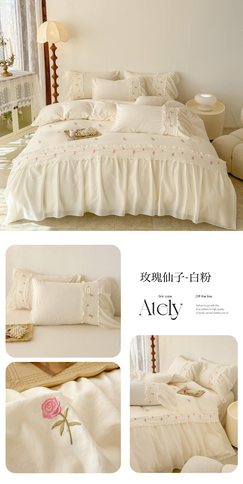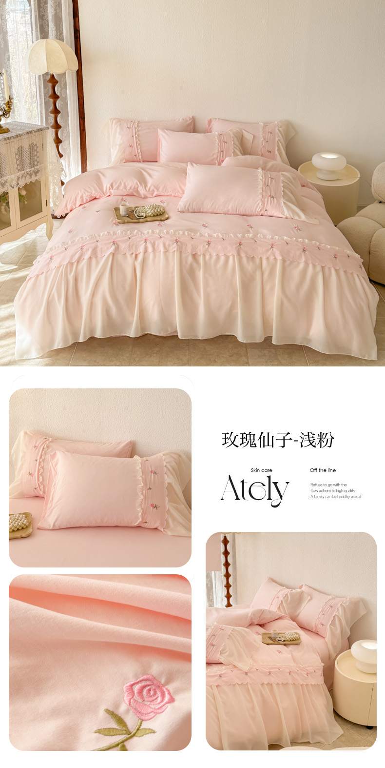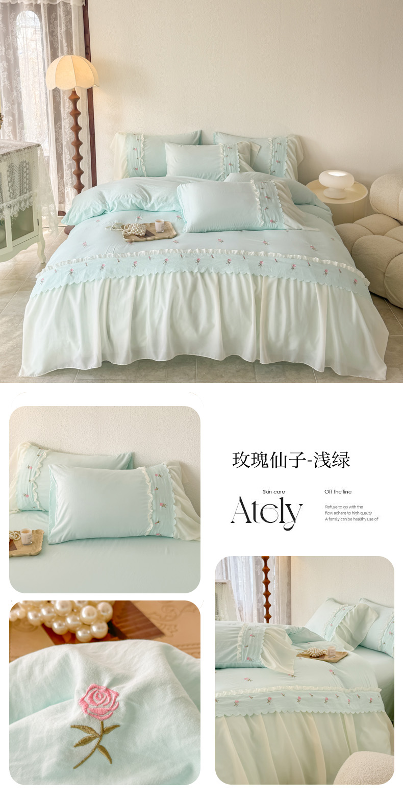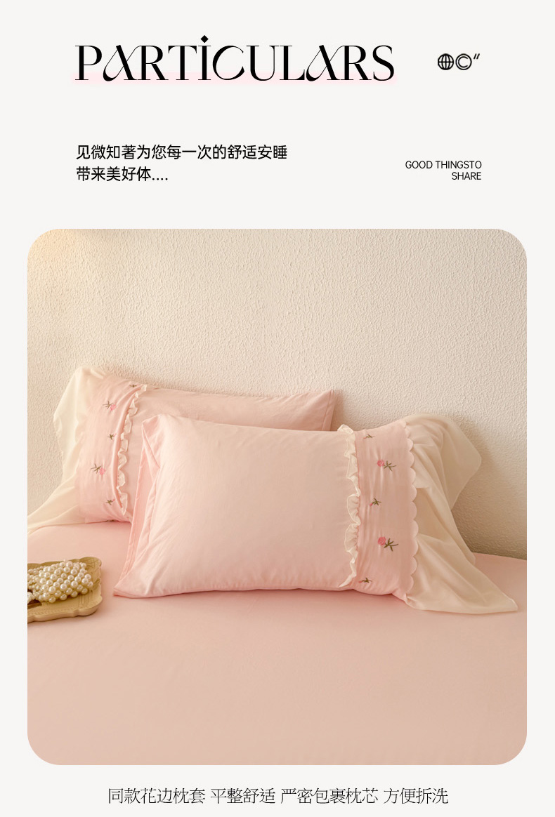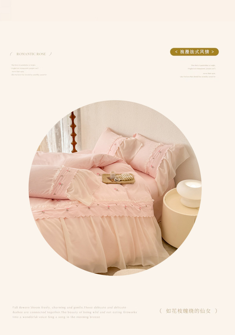 (总)米可 2025新款水洗棉蕾丝花边绣花工艺款四件套,玫瑰仙子-浅粉,玫瑰仙子-白粉,玫瑰仙子-白黑,玫瑰仙子-浅绿
