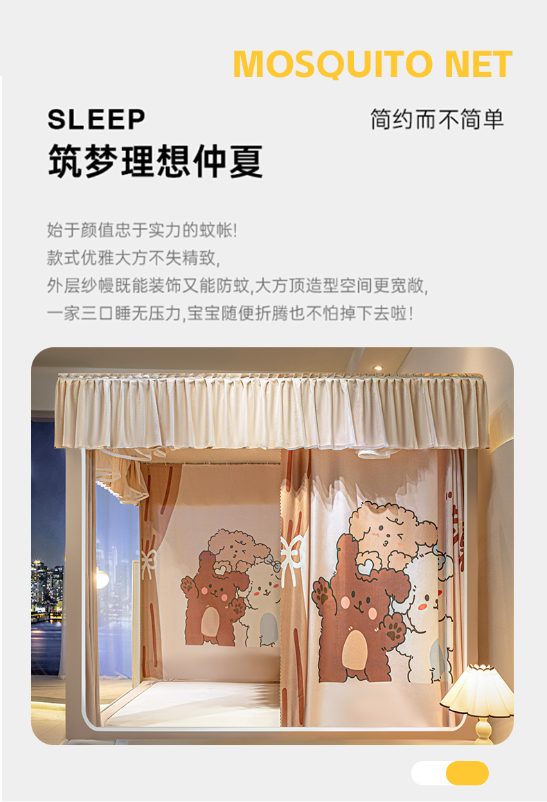 (总)飞轮海蚊帐 2025新款三开门遮光蚊帐LX-1,绿叶仙踪,奶油黄,香槟点点,元气桃,字母小熊