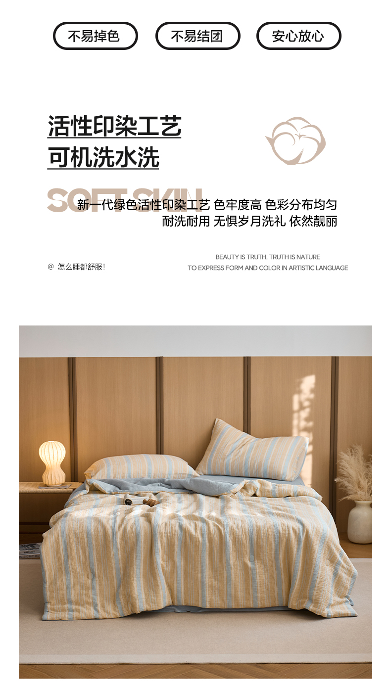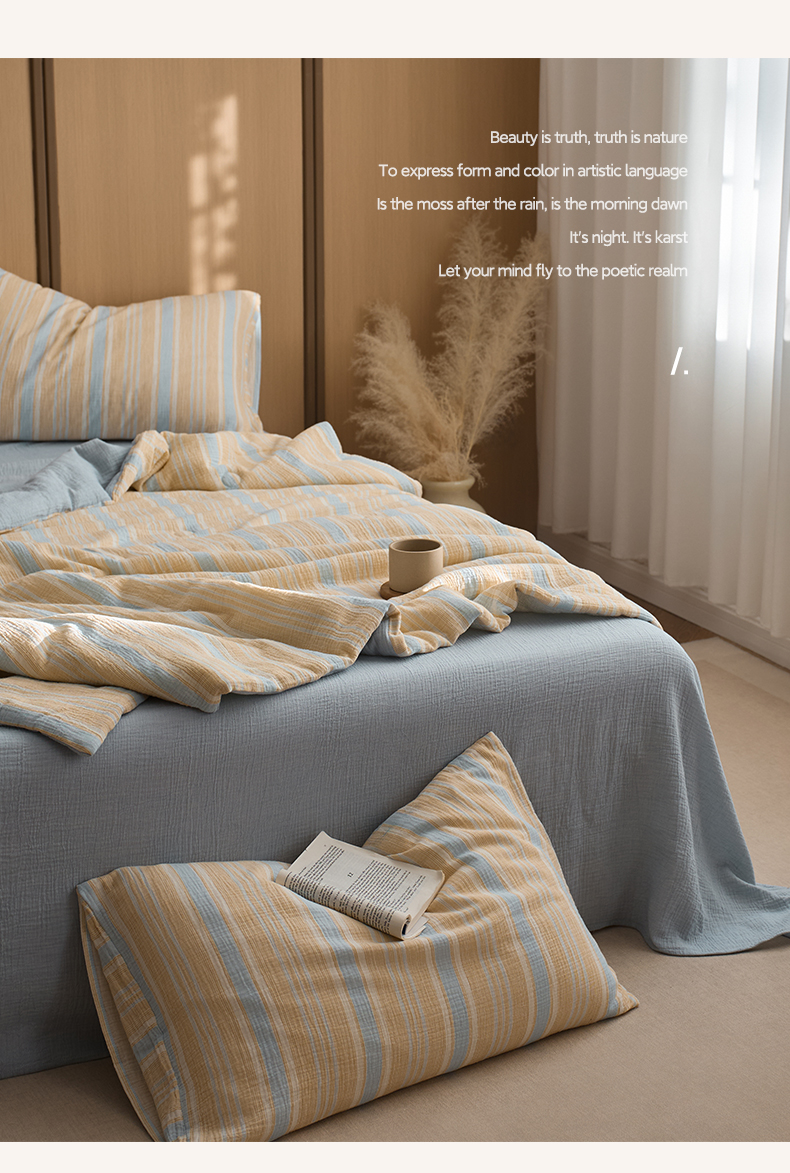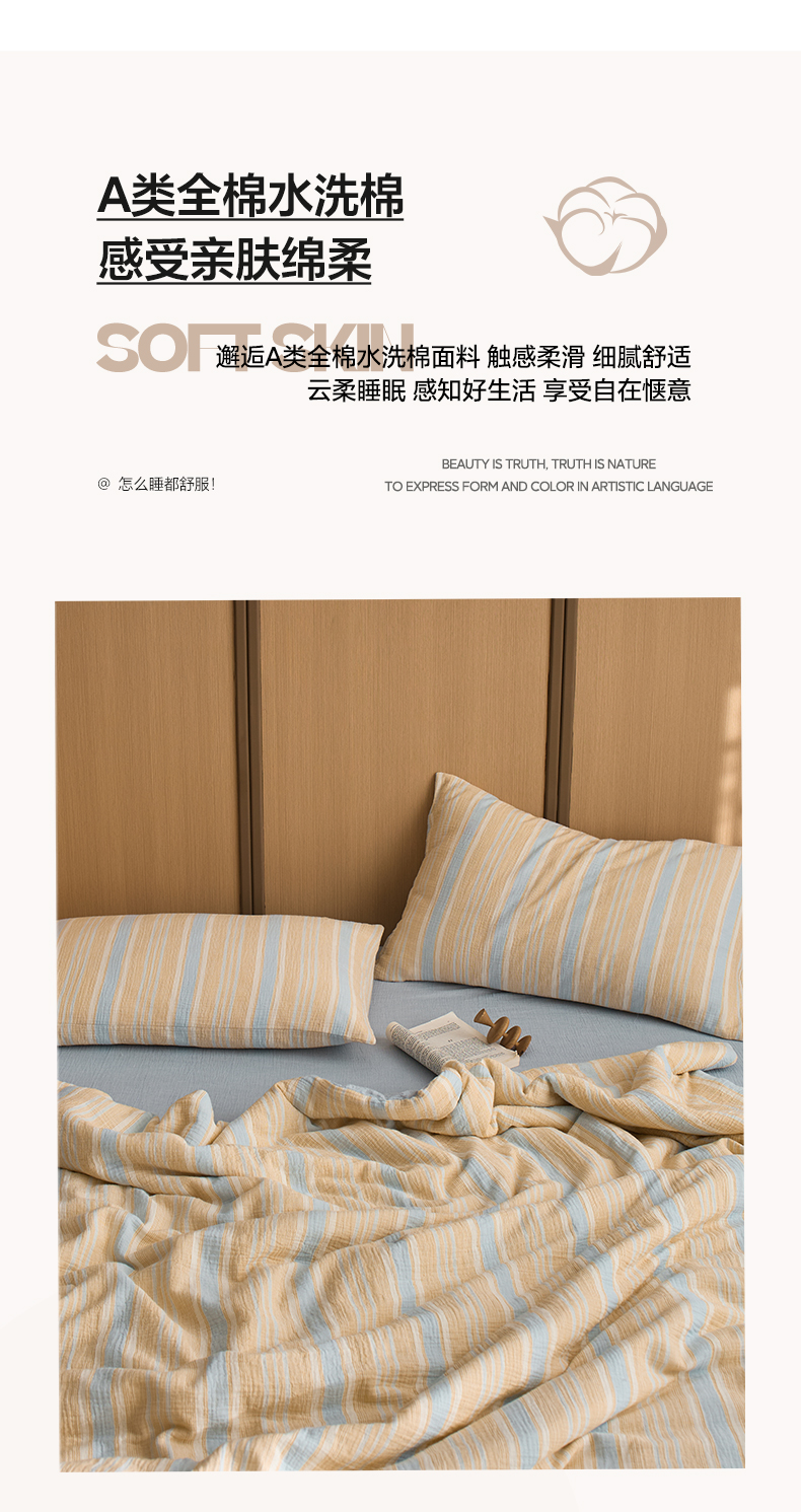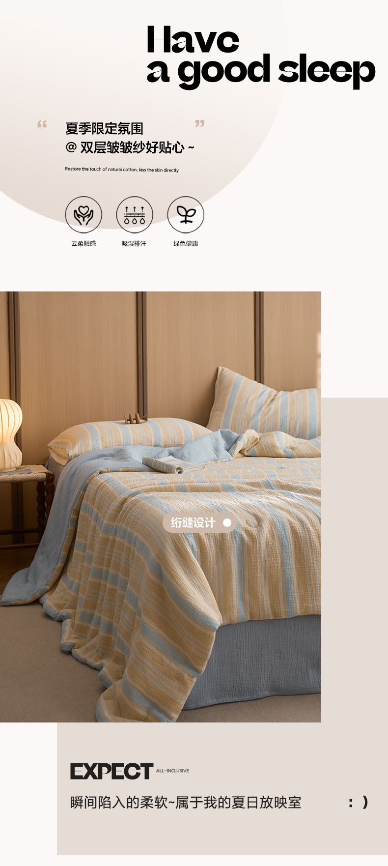 • 91家纺网 家纺一手货源 找家纺 一加一 2025新款A类母婴级水洗全棉无印双层皱皱纱牛奶蛋白夏被四件套 时予桔蓝