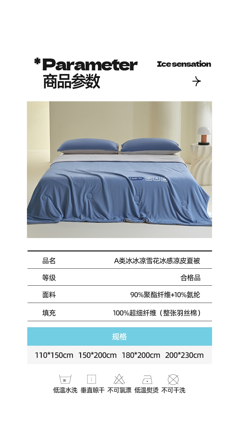 当前位置: 91家纺网 > 商品网购 > 被子 > 夏被 > 桃子家居 2025新款A类高品质冰冰凉雪花冰感凉皮双面加倍透气孔氨纶凉感夏被 冰感凉皮-蓝银灰(加倍透气)