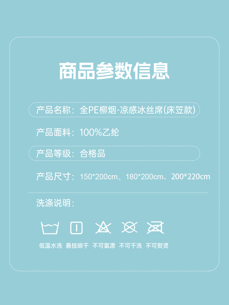 商品名称:(总)小牛席业 2025新款全PE柳烟冰丝凉席席子(床笠款)凉席藤席冰藤席冰丝席竹席空调席草席乳胶席豆豆席三件套