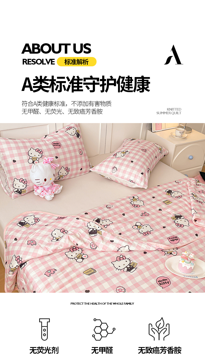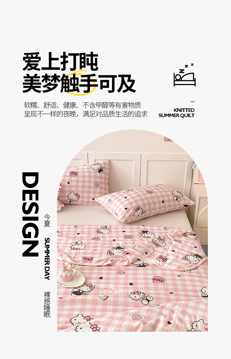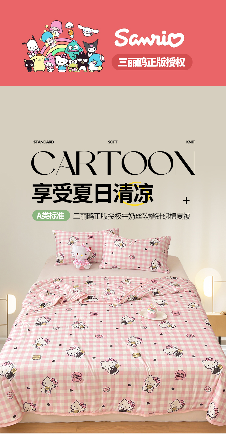 • 91家纺网 家纺一手货源 找家纺 桃子家居 2025新款A类三丽鸥正版授权高品质牛奶丝软糯针织棉大豆夏被系列 针织棉三丽鸥-粉格爱心kitty