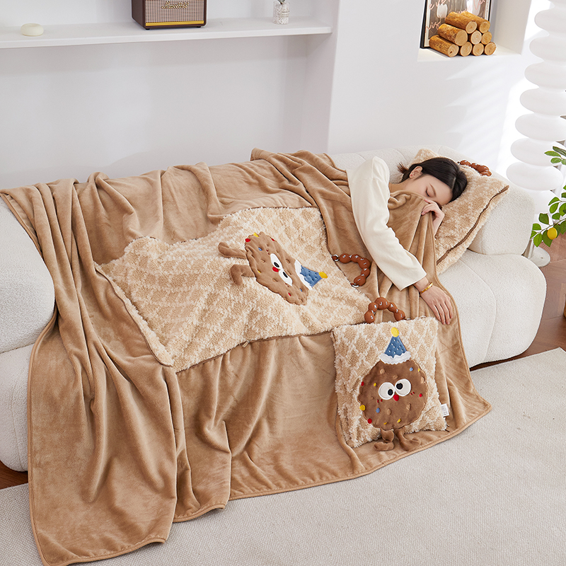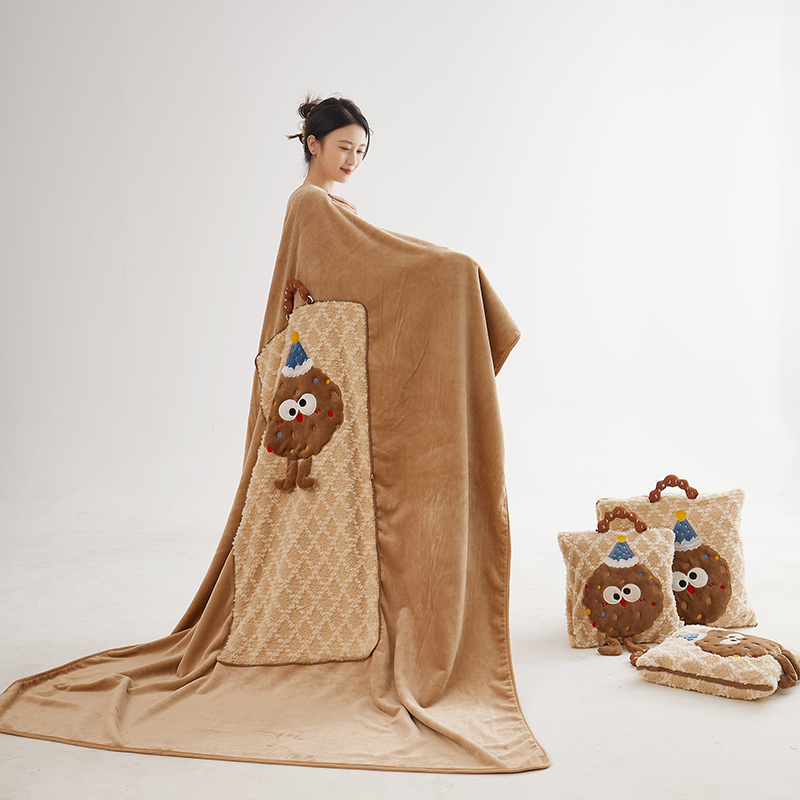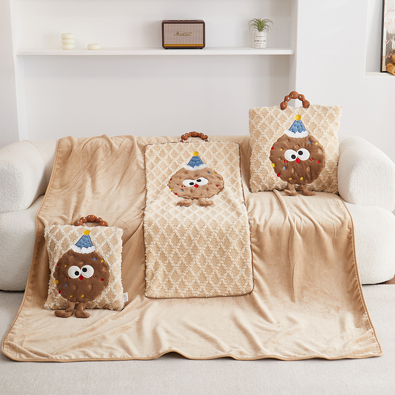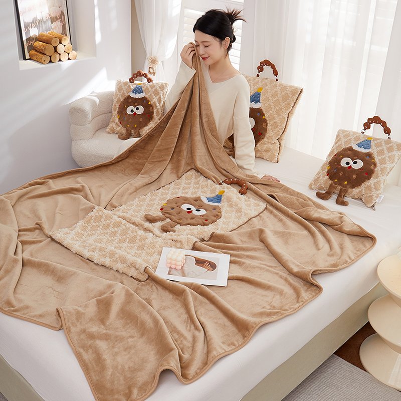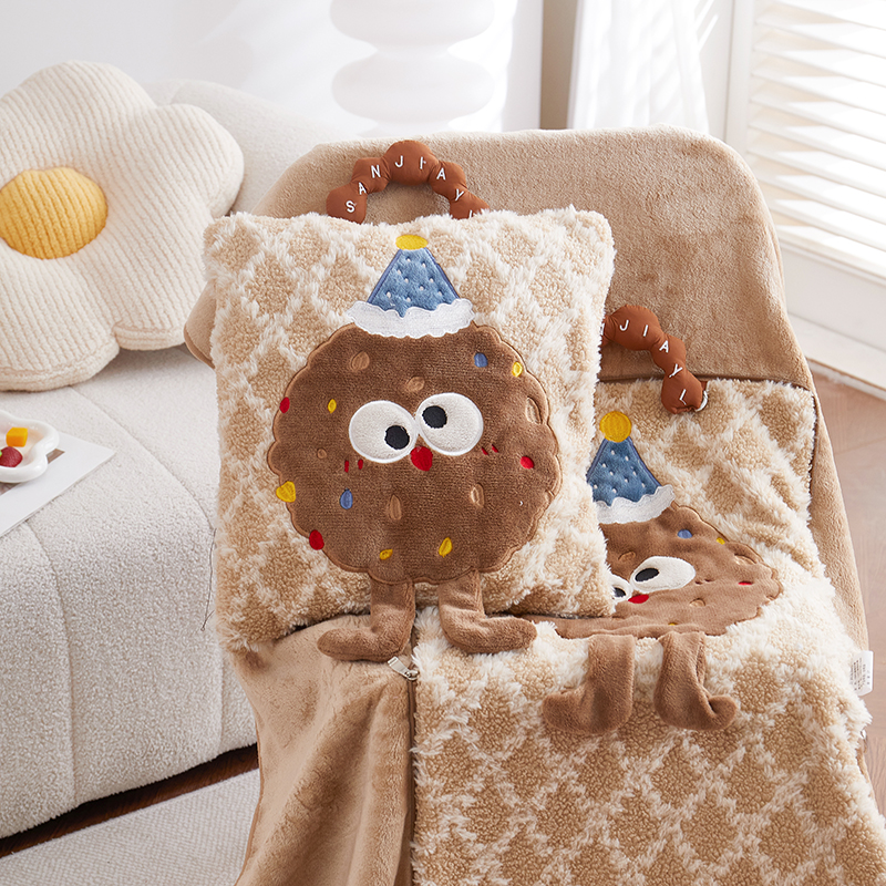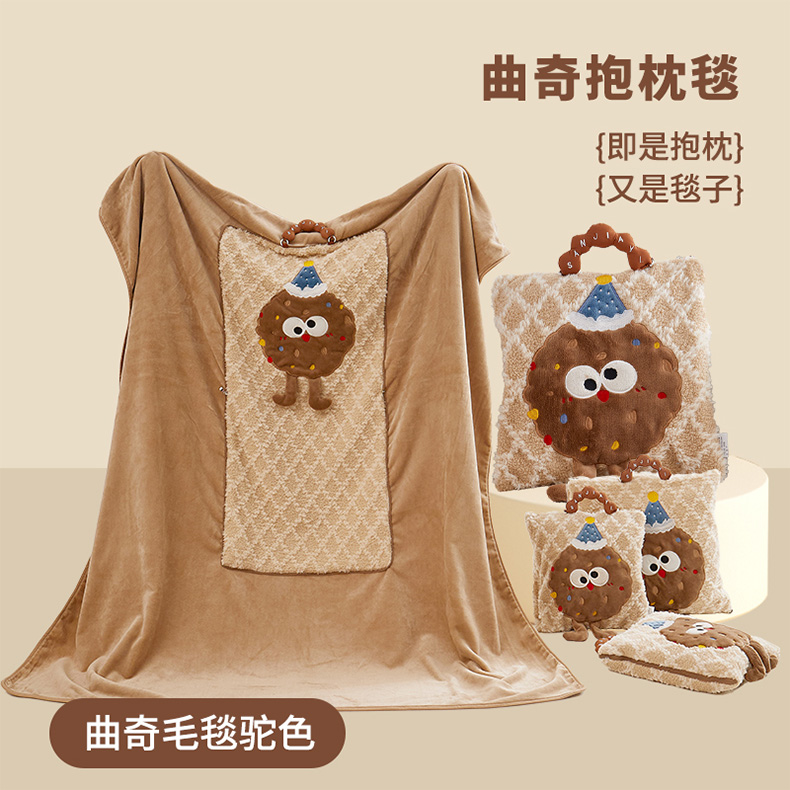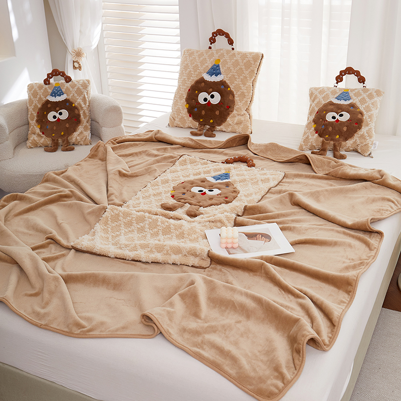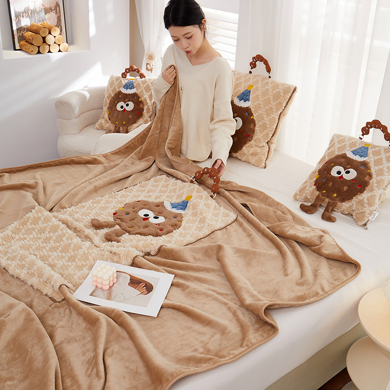 商品名称:古本家居 2025新款贴布立体卡通刺绣曲奇抱枕毯抱枕被 曲奇毛毯-驼色
