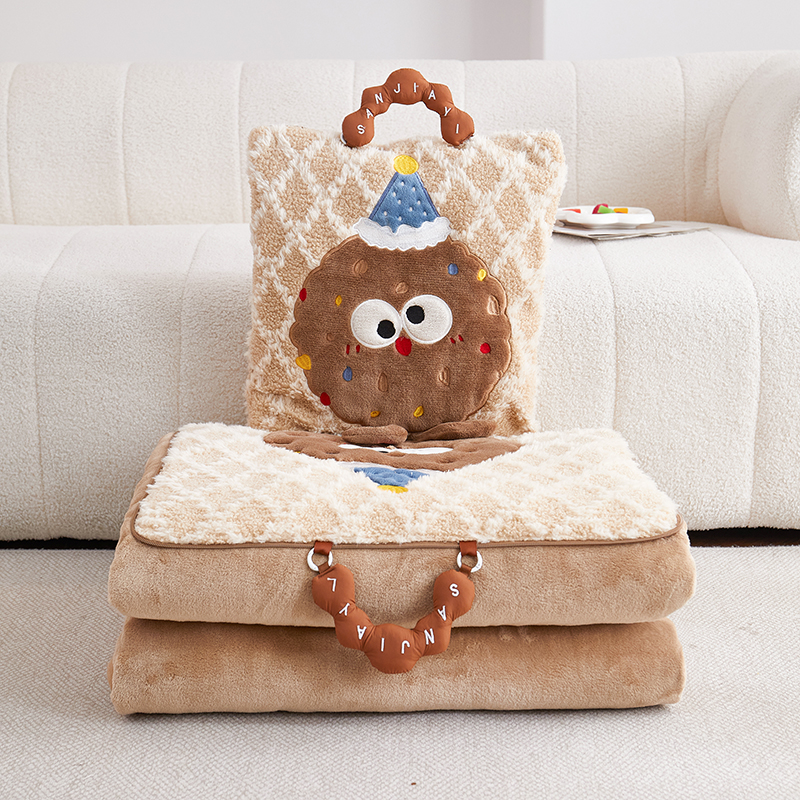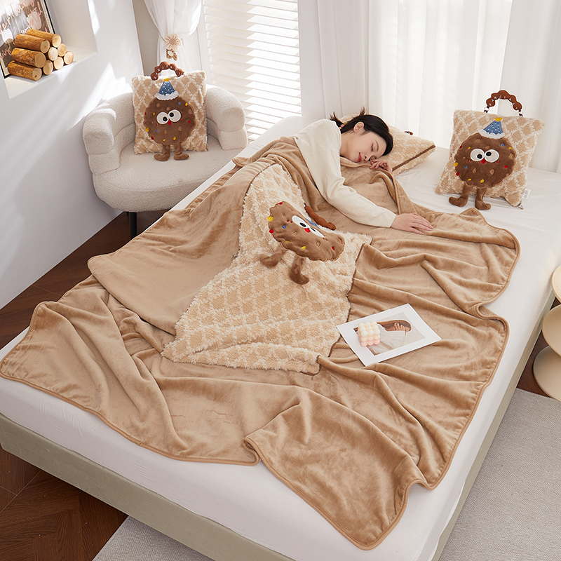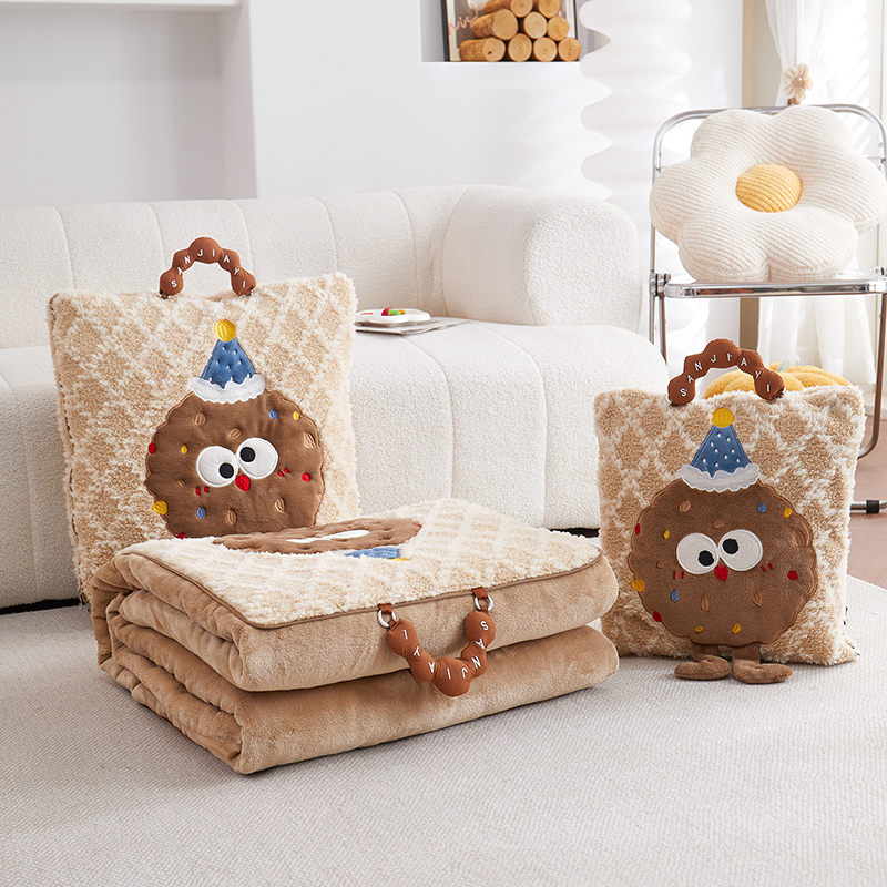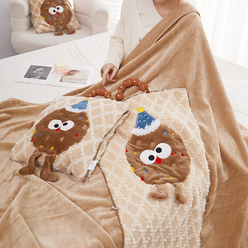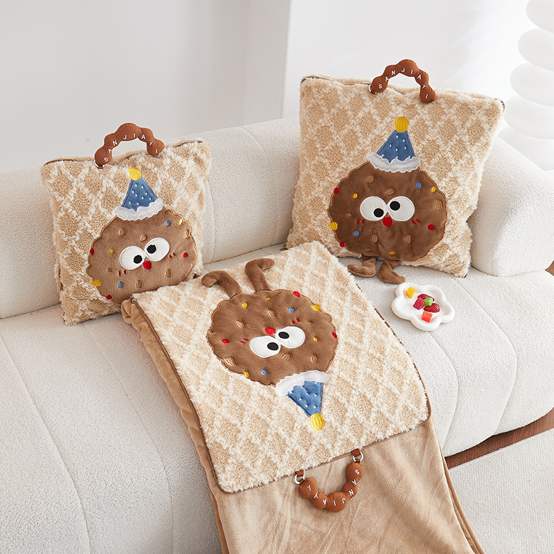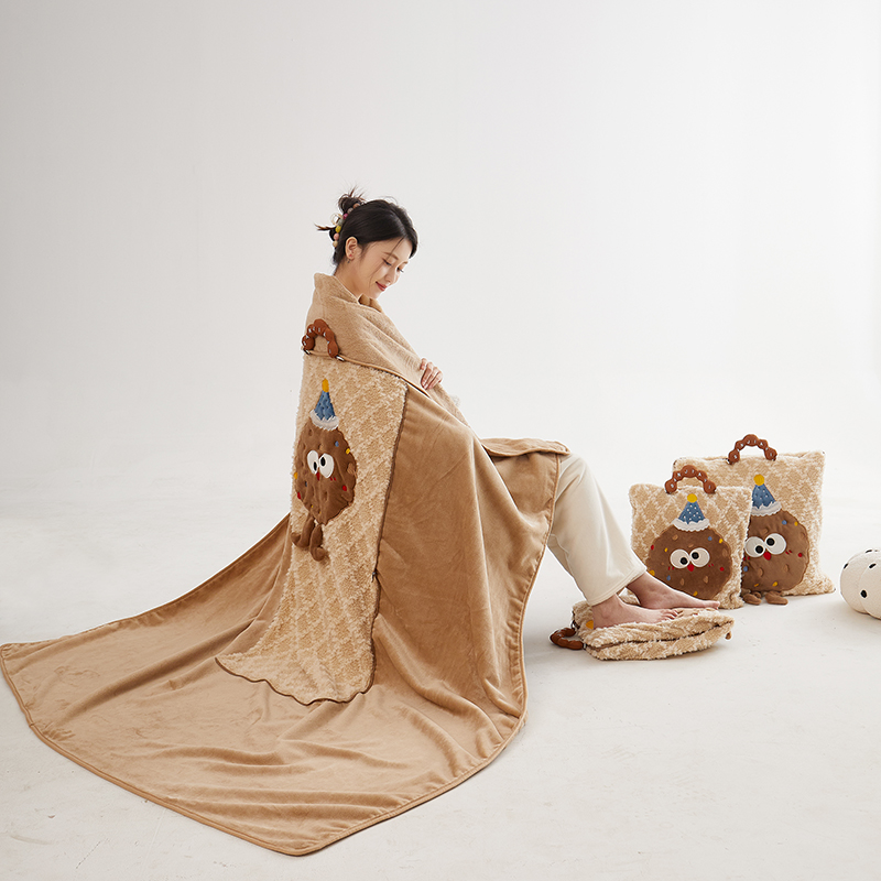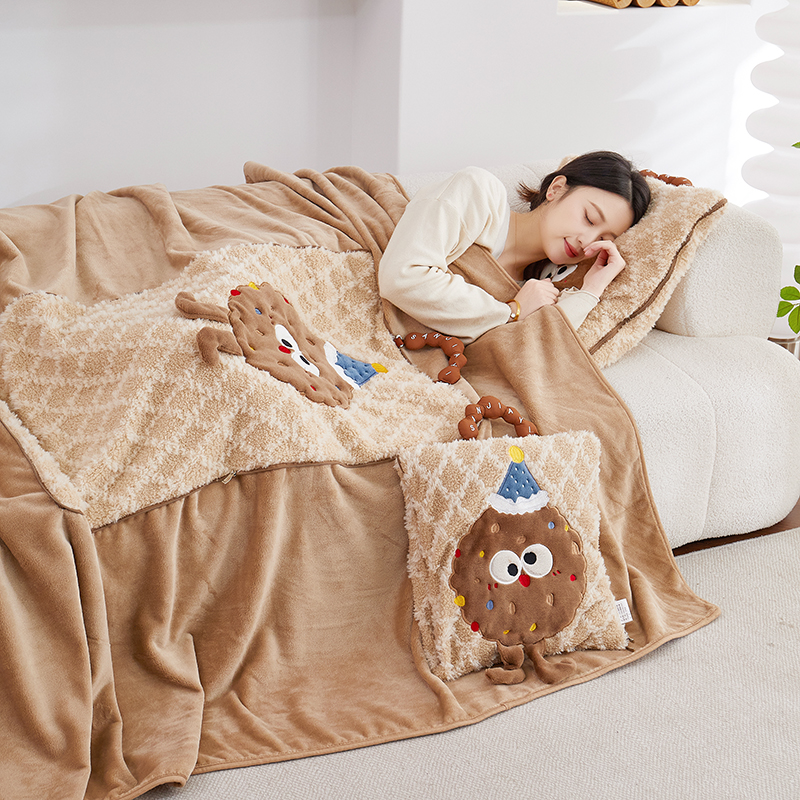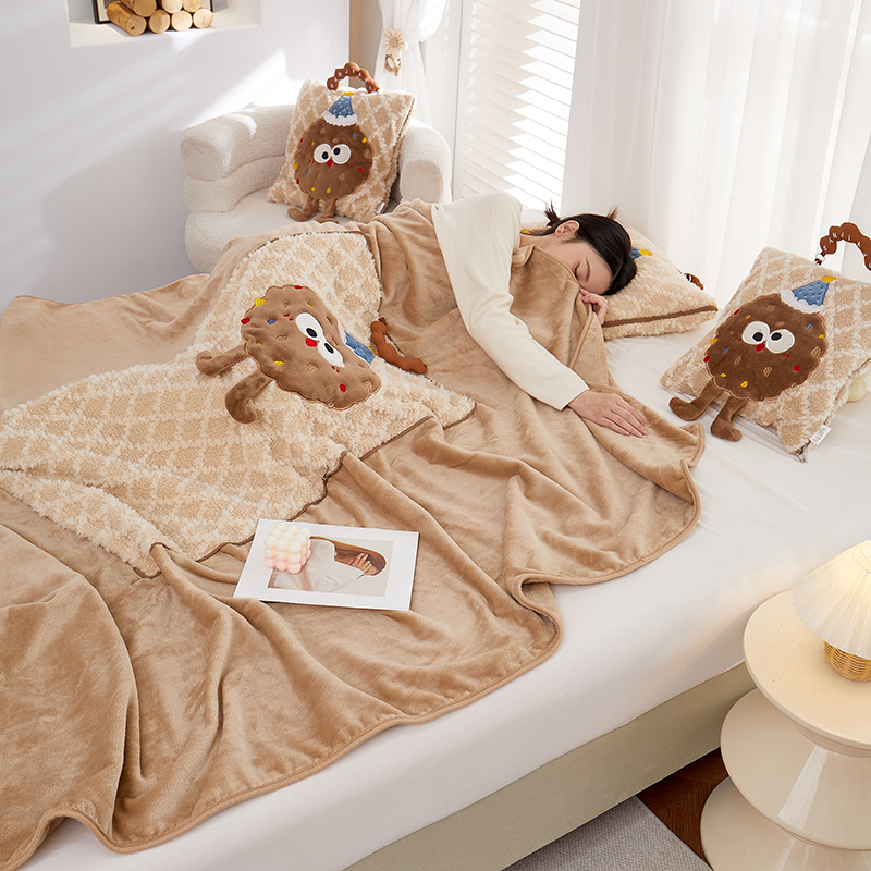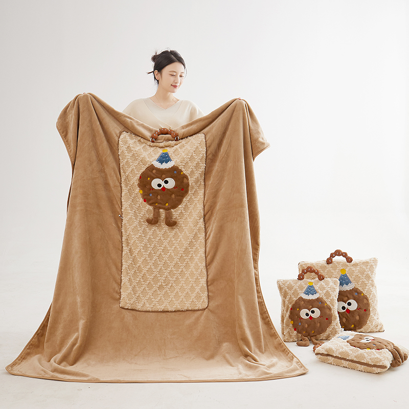 商品名称:古本家居 2025新款贴布立体卡通刺绣曲奇抱枕毯抱枕被 曲奇毛毯-驼色