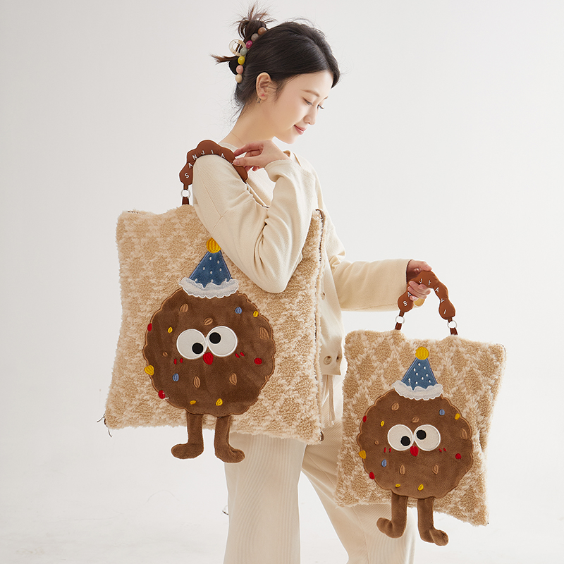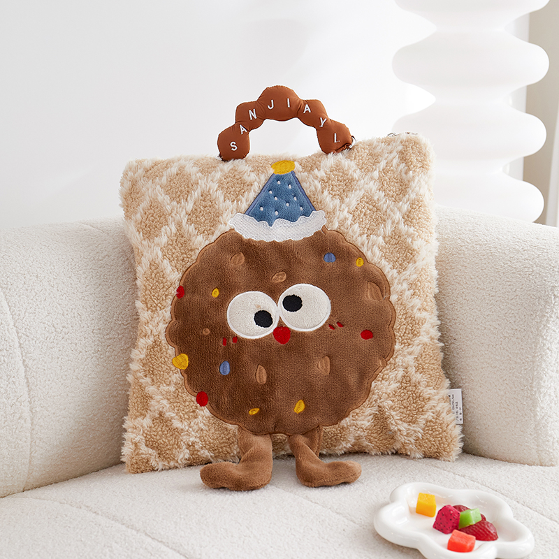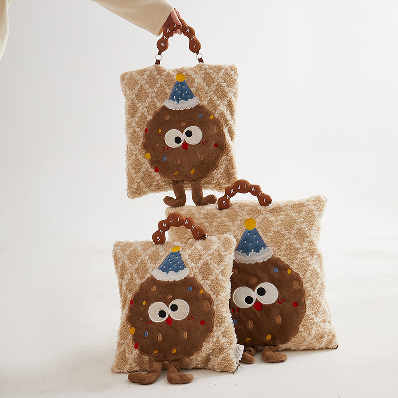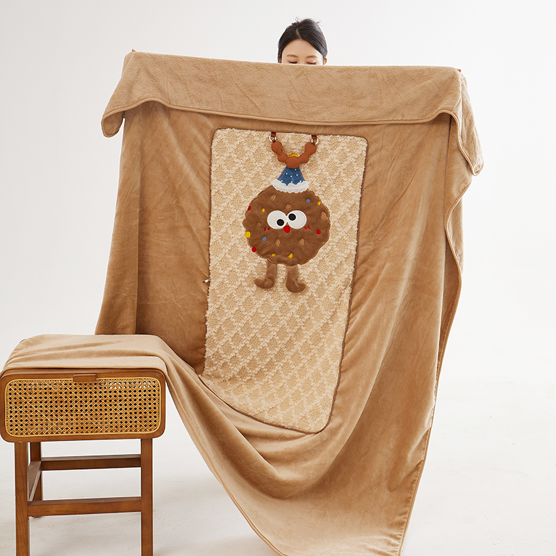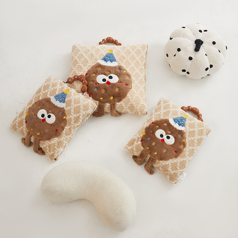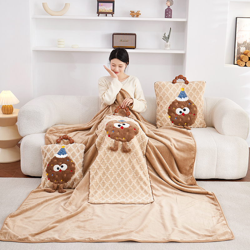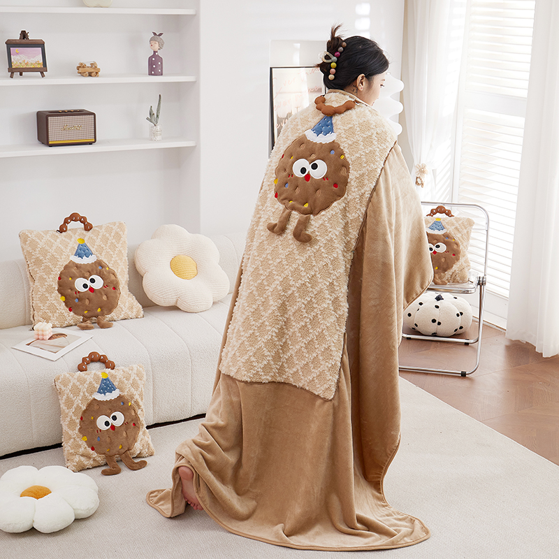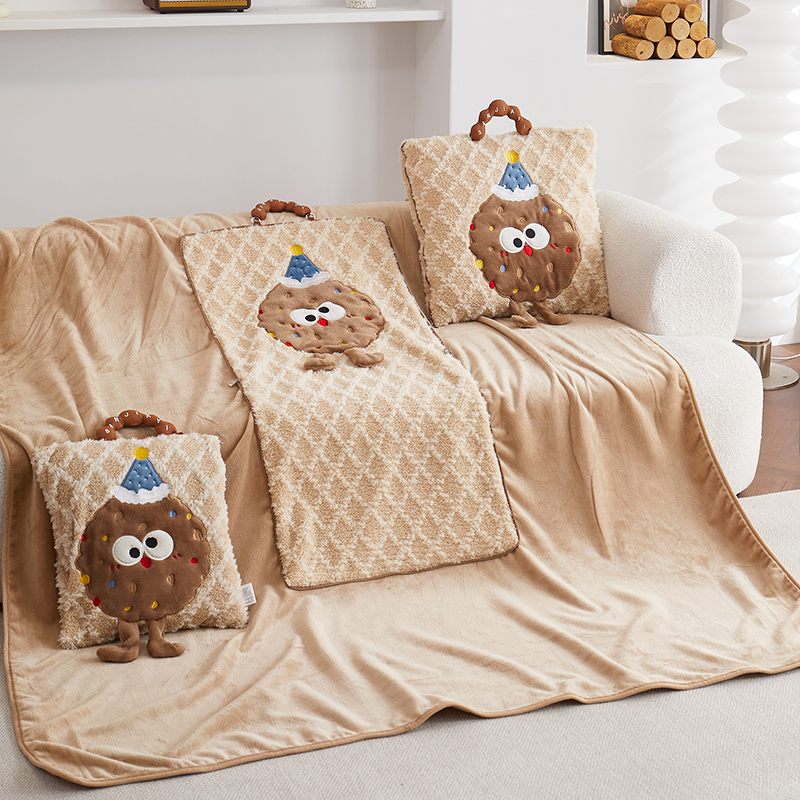 商品名称:古本家居 2025新款贴布立体卡通刺绣曲奇抱枕毯抱枕被 曲奇毛毯-驼色