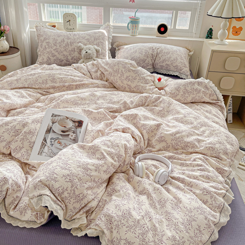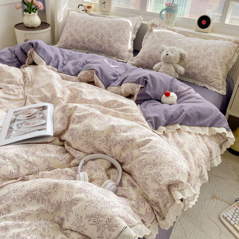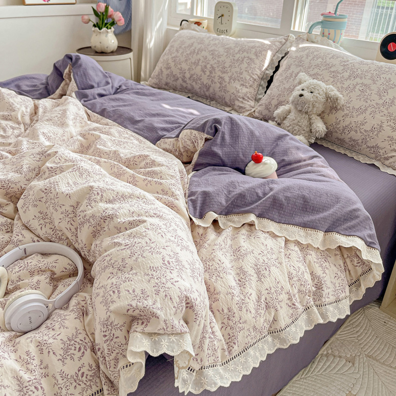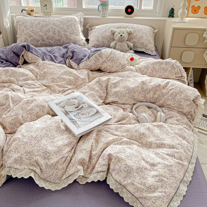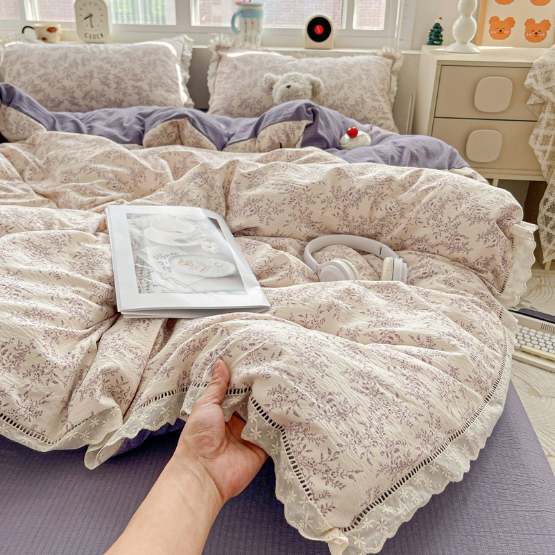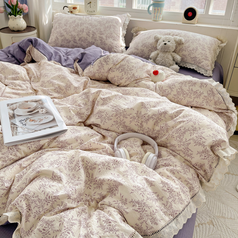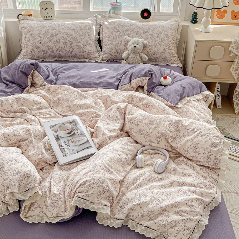 仟网汇 2025新款云感皱皱双层纱全棉花边四件套 紫苏