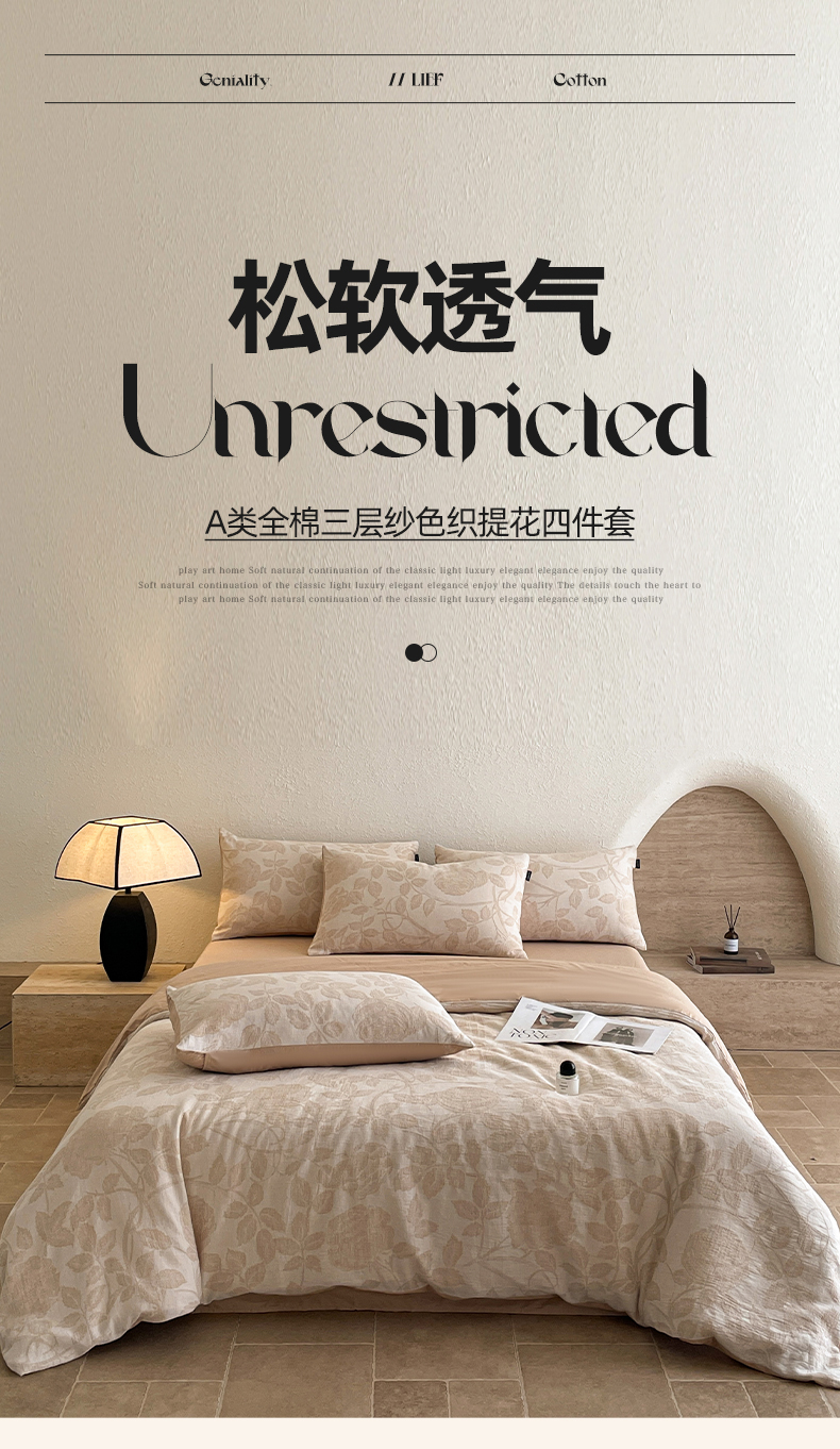 当前位置: 91家纺网 > 商品网购 > 床品套件 > 四件套 > 全棉普通四件套 > 拼社2025新款全棉色织水洗三层纱提花纯棉四件套全棉单被套【提供买家秀】 望月-咖
