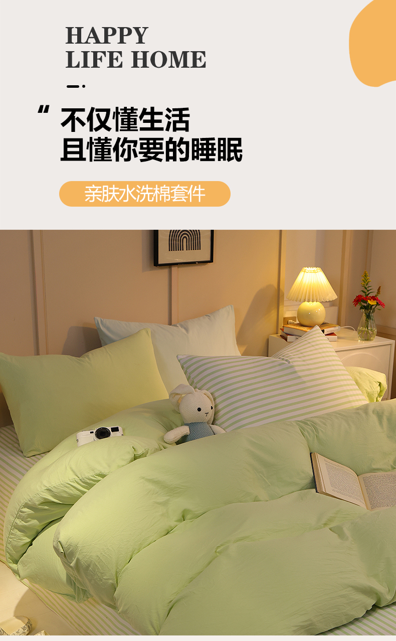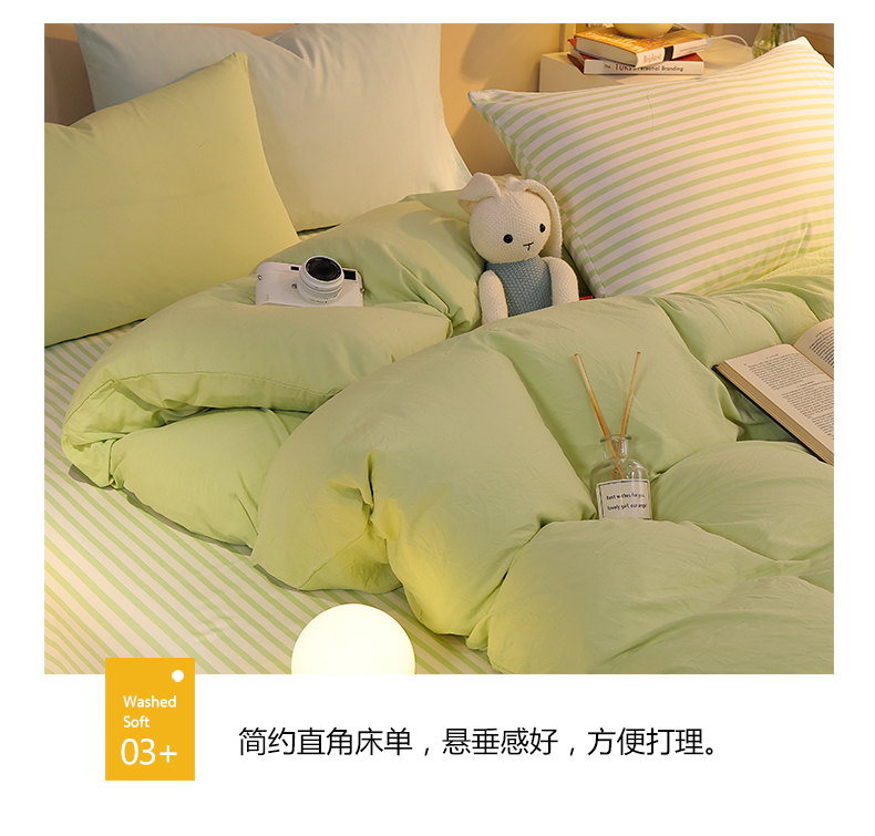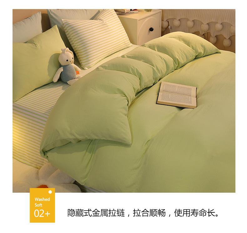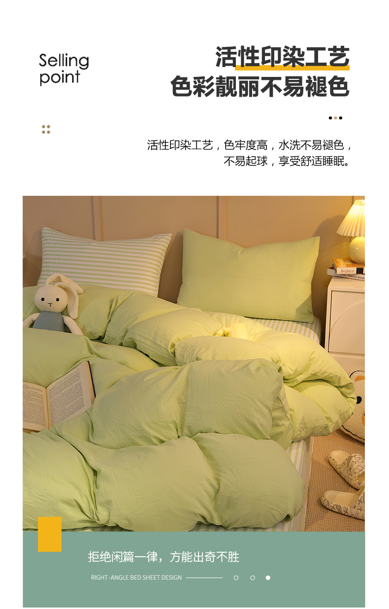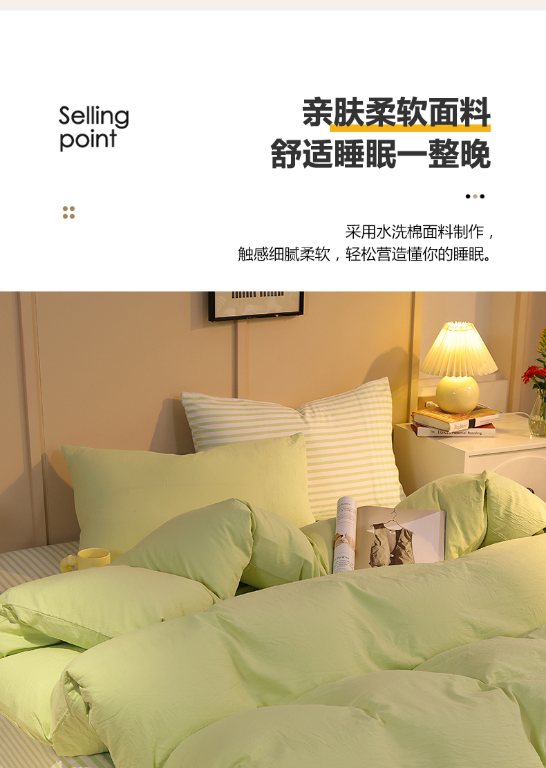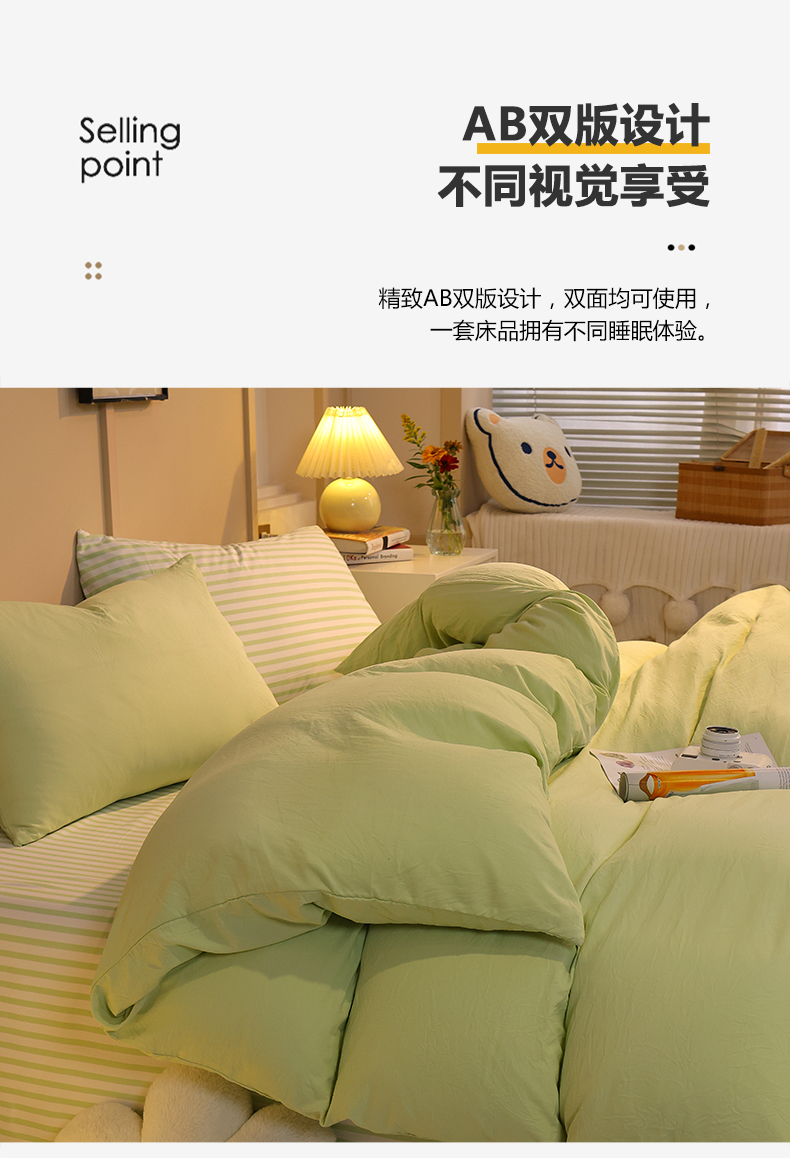 商品名称:缦绣阁家纺 2025新款亲肤水洗棉纯色双拼四件套简约风床单款床笠款四件套宿舍三件套 双拼果绿+条纹绿