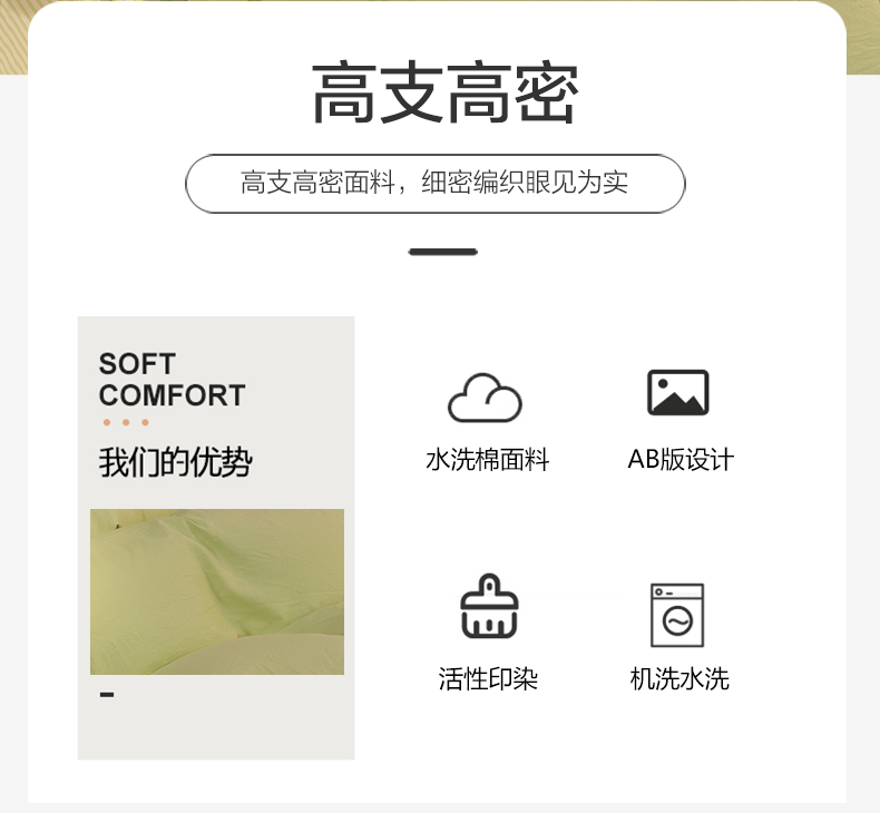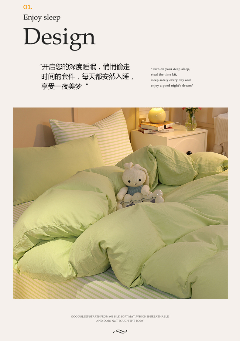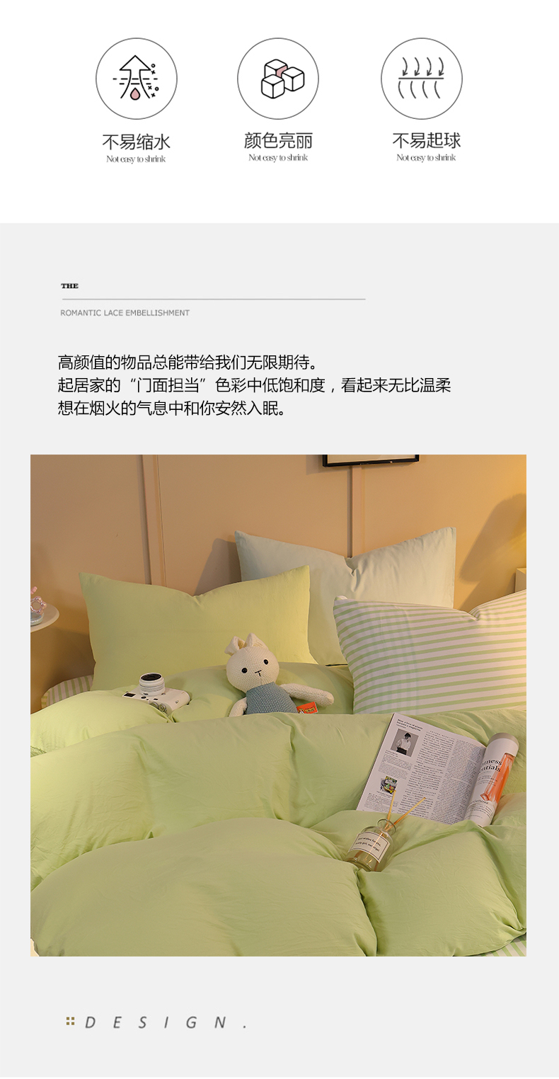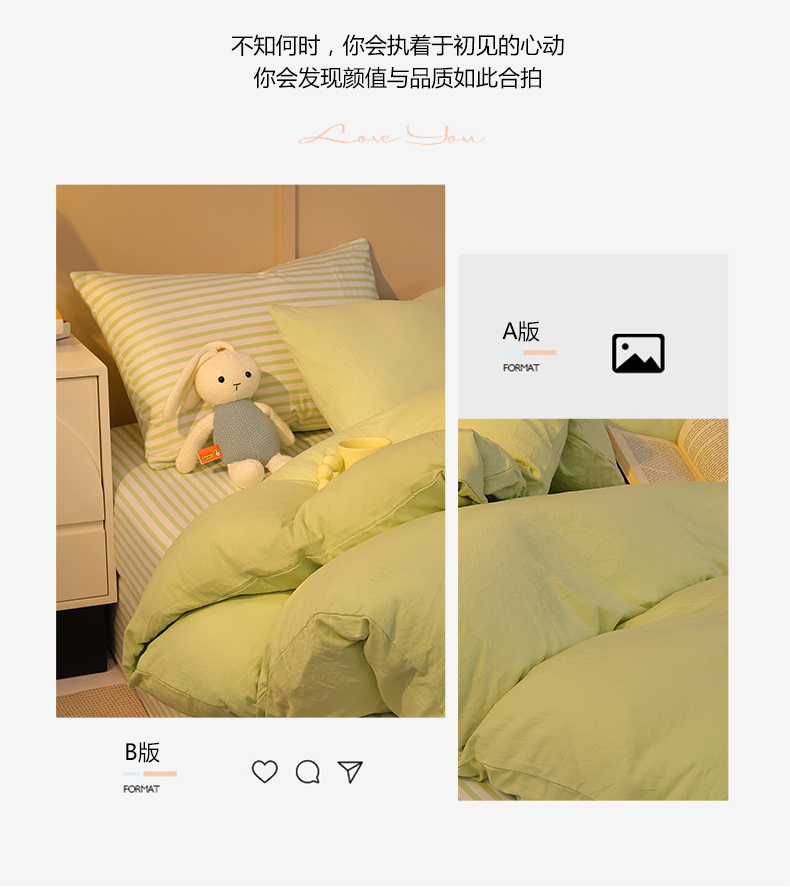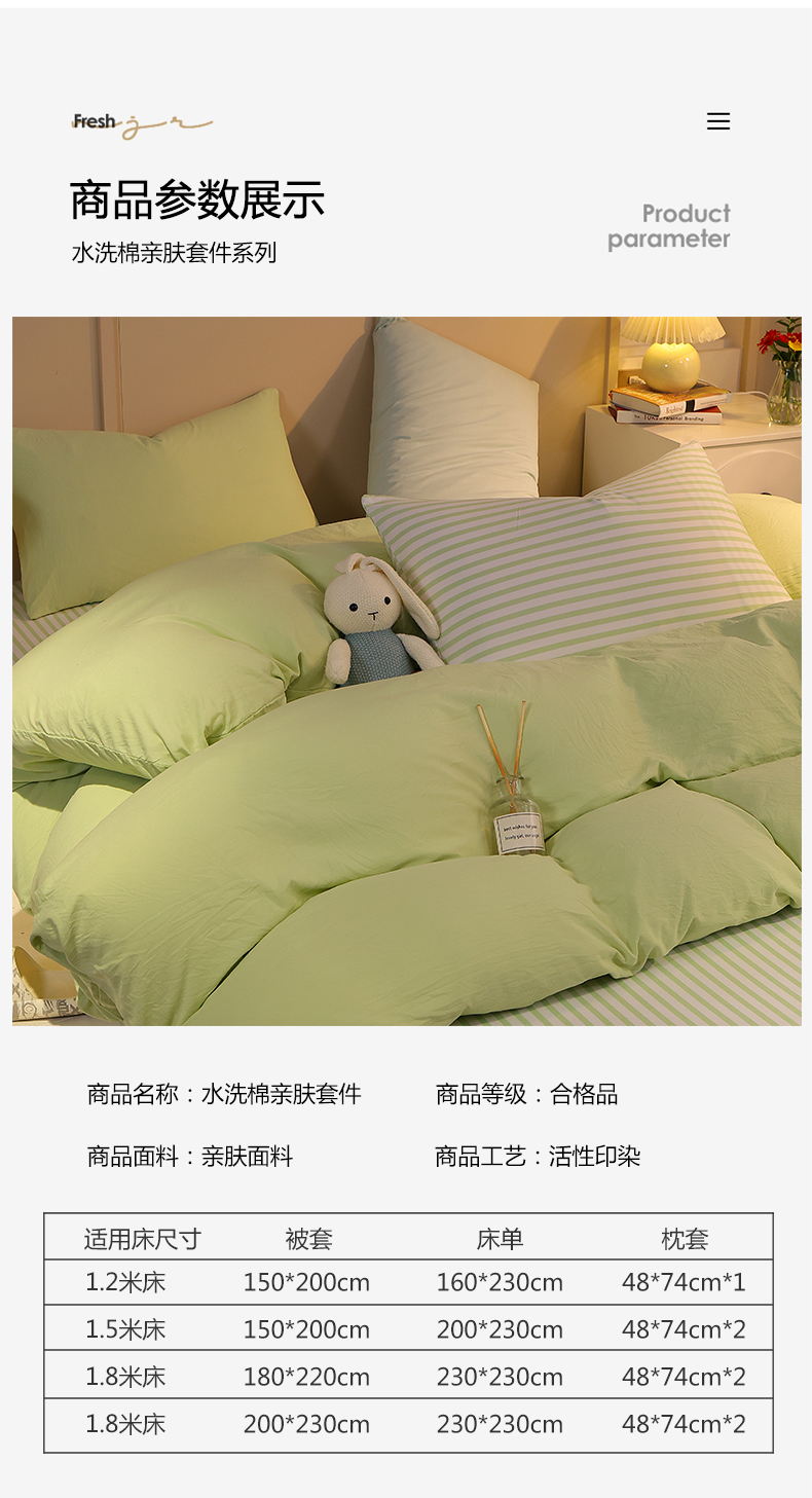 商品名称:缦绣阁家纺 2025新款亲肤水洗棉纯色双拼四件套简约风床单款床笠款四件套宿舍三件套 双拼果绿+条纹绿