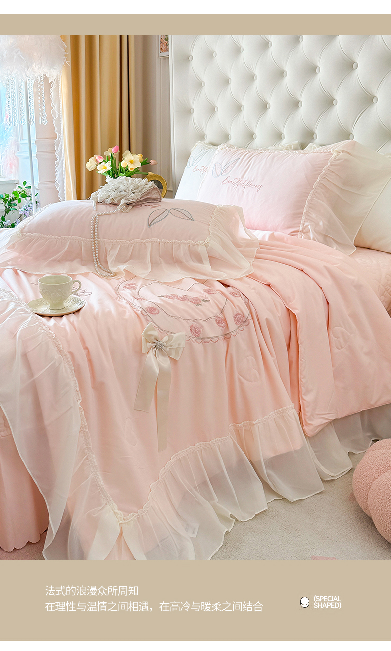 宅家居 2025新款法式花边浪漫花卉爱心刺绣绗绣床盖夏被夏凉被空调被四件套-玫瑰之恋 玫瑰之恋-浅蓝