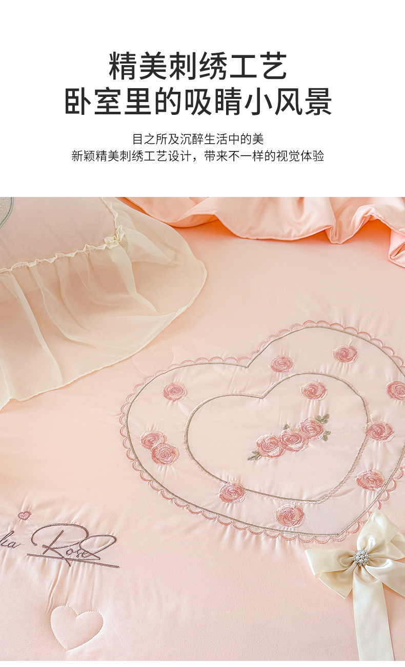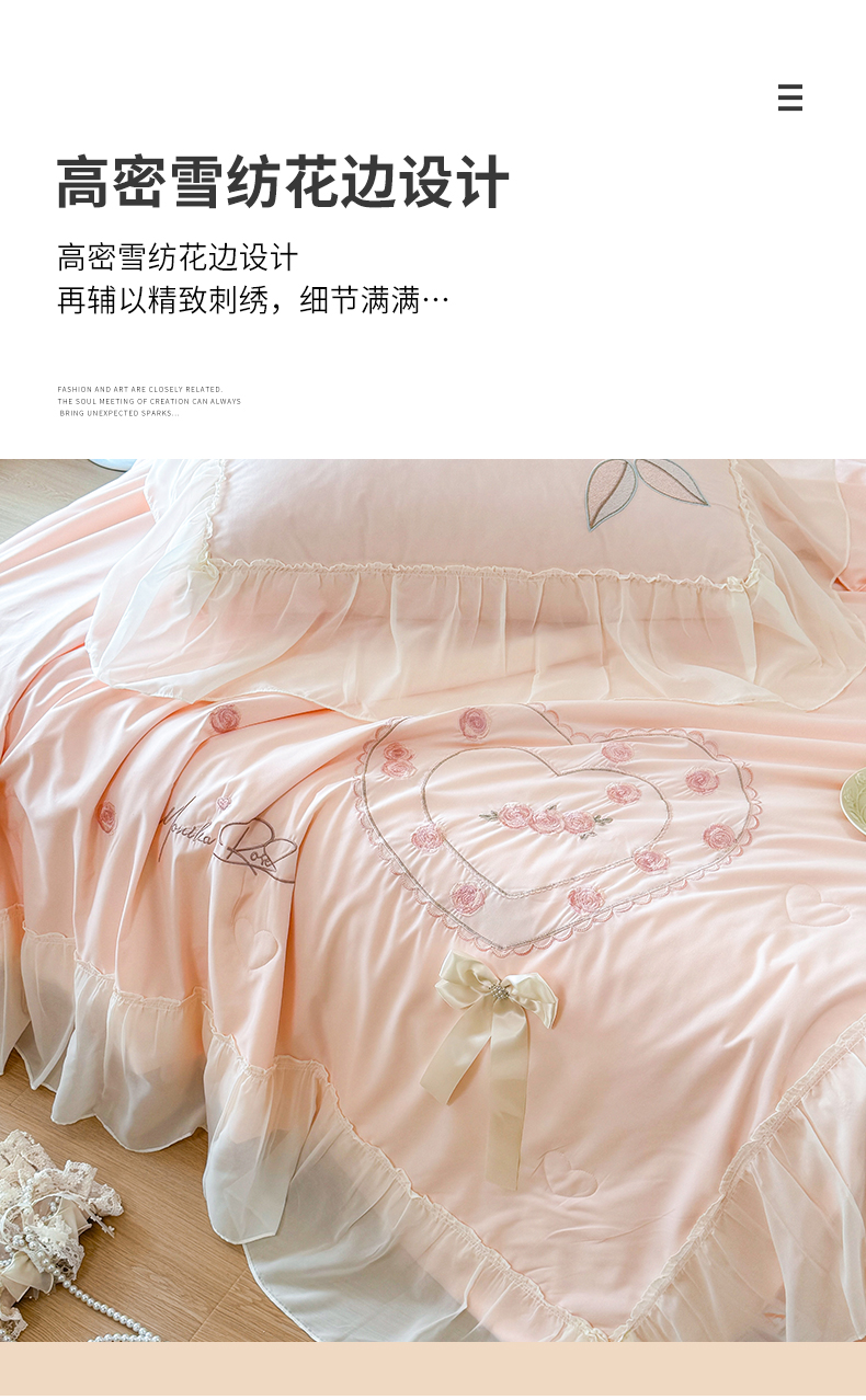 商品名称:宅家居 2025新款法式花边浪漫花卉爱心刺绣绗绣床盖夏被夏凉被空调被四件套-玫瑰之恋 玫瑰之恋-浅蓝