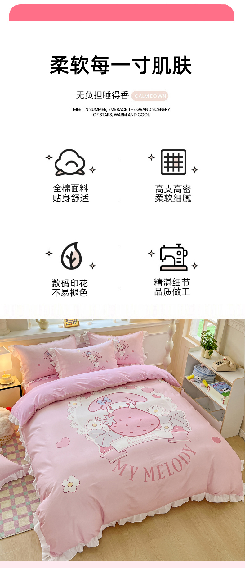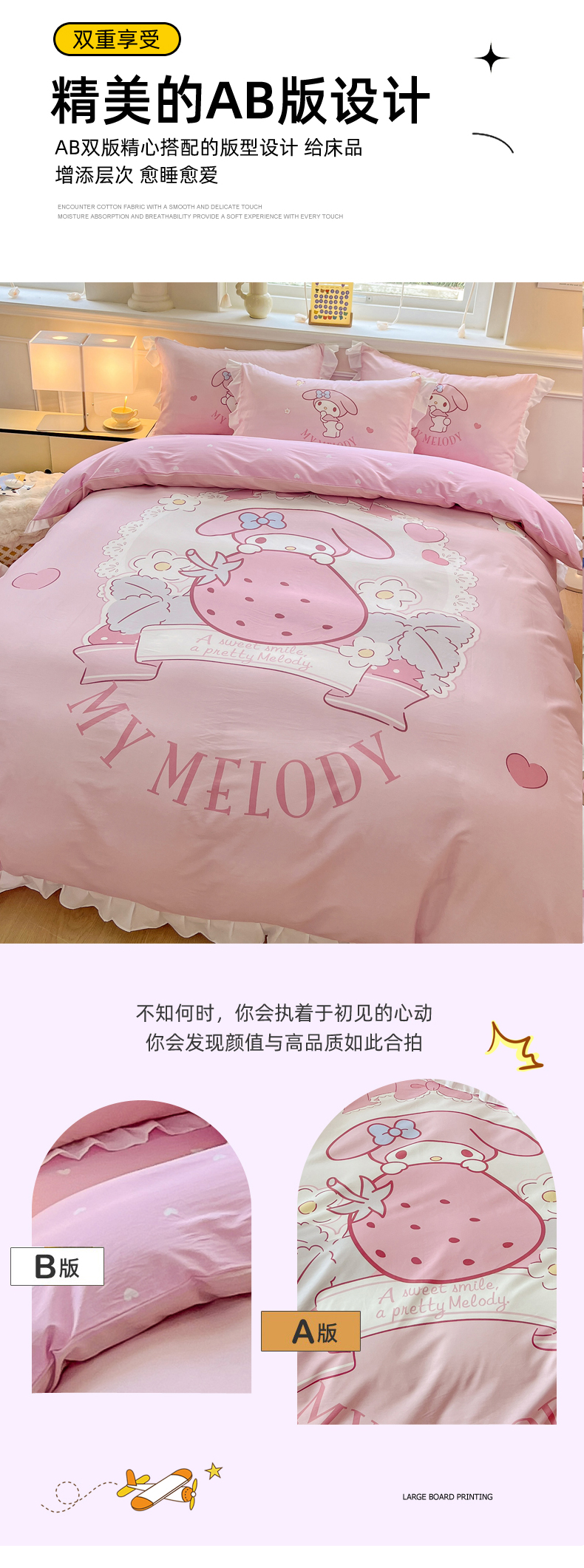 当前位置: 91家纺网 > 商品网购 > 床品套件 > 四件套 > 全棉普通四件套 > 玉元坊 2025新款三丽鸥白花边被套数码印花大版全棉纯棉卡通三四件套 大版花边-粉兔草莓